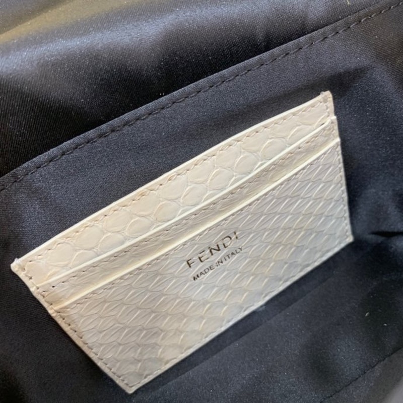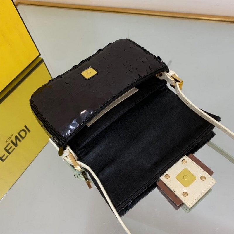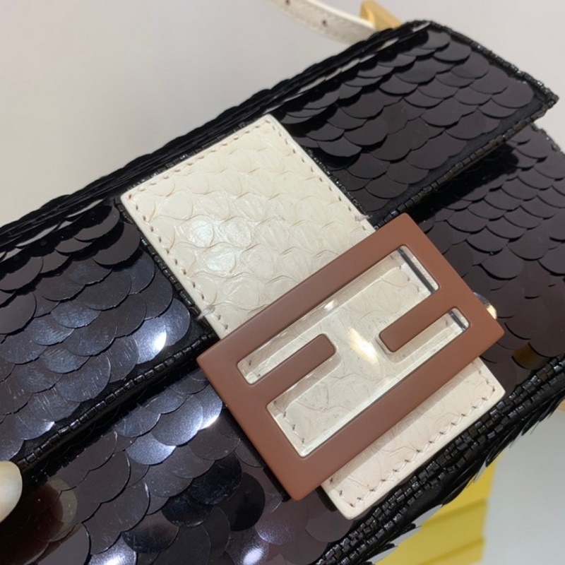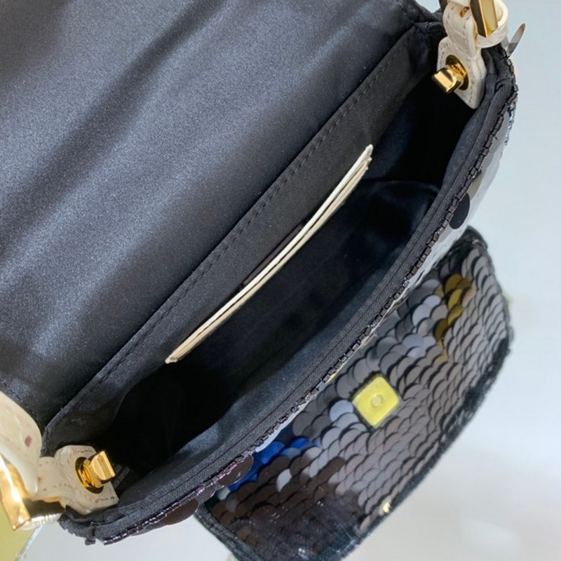 펜디 97 트럼펫 백 전체에 금색 금속 스팽글 자수 장식과 FF 버클 이 가방은 1997년에 출시된 첫 번째 가방을 재해석한 것입니다. 이름도 그 이름을 따서 지었습니다. 가죽과 같은 색상의 앞쪽 덮개가 달린 상징적인 언더암 디자인이 특징입니다. 가죽 디테일과 새틴 안감의 내부 수납공간 자석 스냅 카드 홀더. 빈티지 골드톤 하드웨어 핸드백에는 탈착식 손잡이와 옆면의 버클이 있어 손으로 들거나 어깨에 메고 다닐 수 있습니다. 크기: 5*5*11cm ☆2016년형 블랙 스팽글 No.: BD96181290