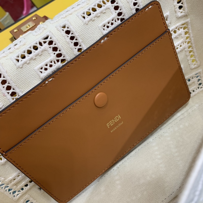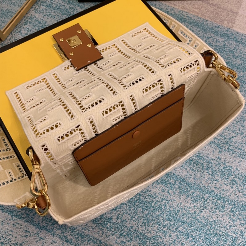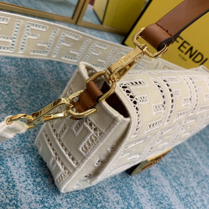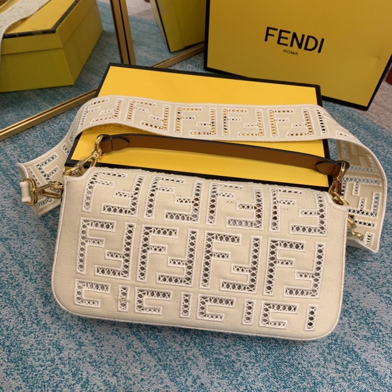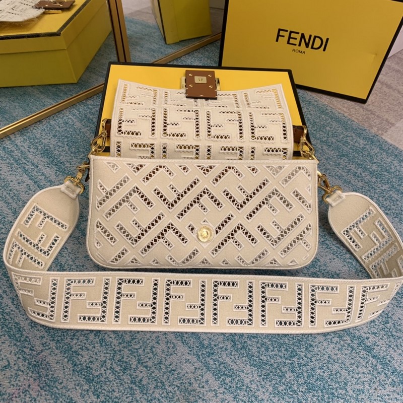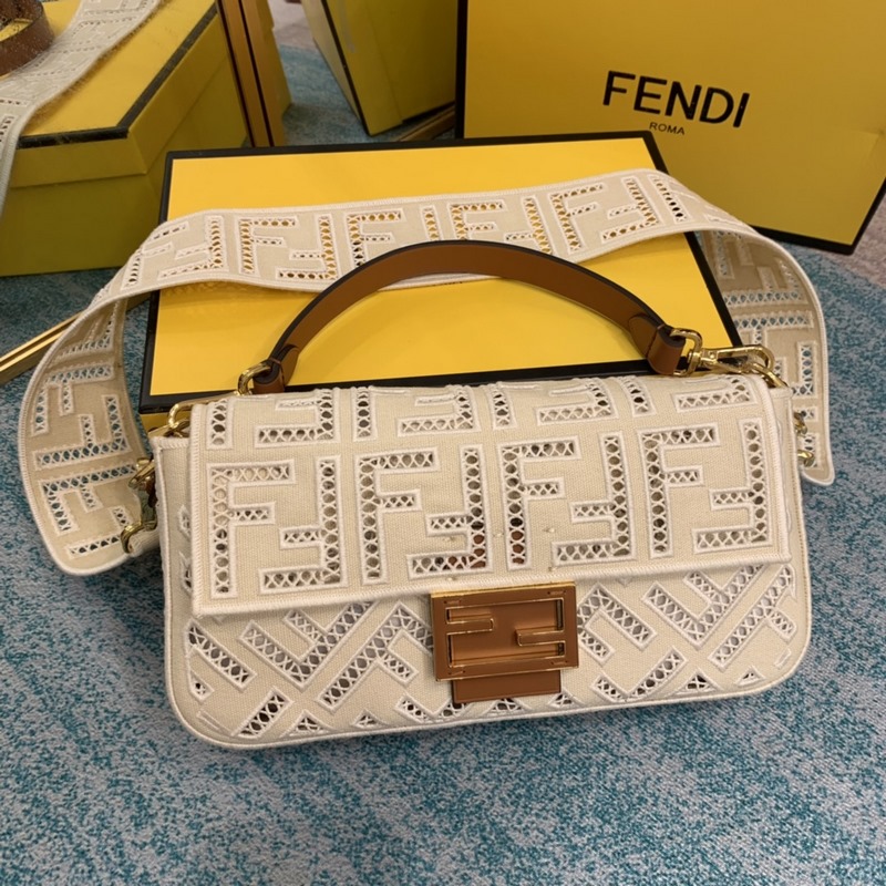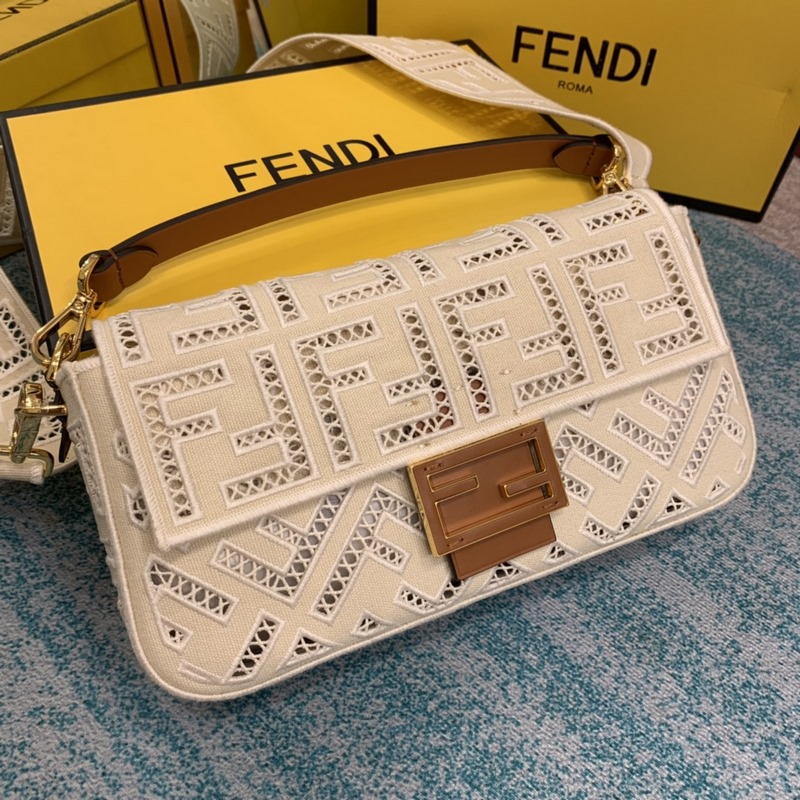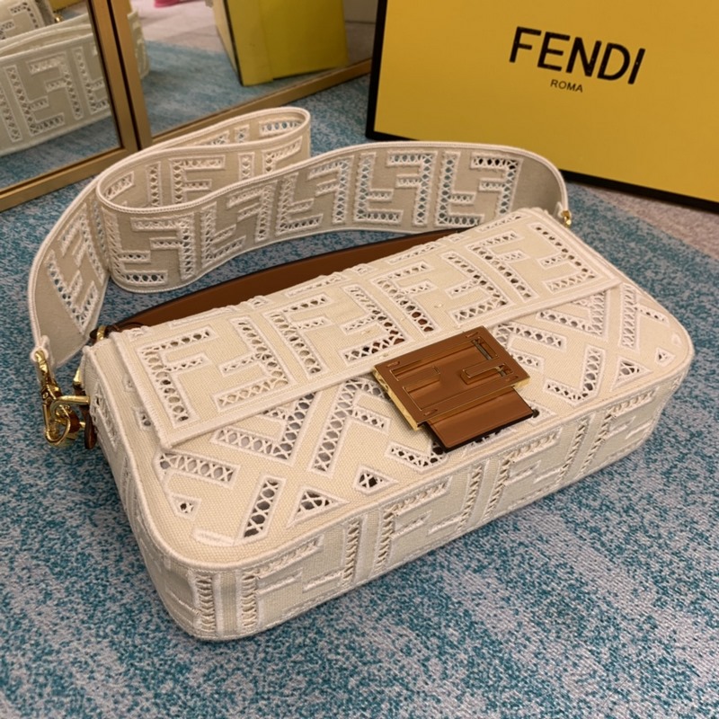 펜디 숄더백 흰색 캔버스 소재의 바게트 핸드백 FF 오픈워크 자수 모티브