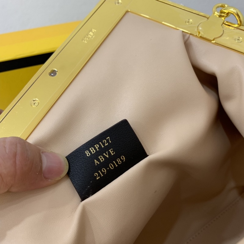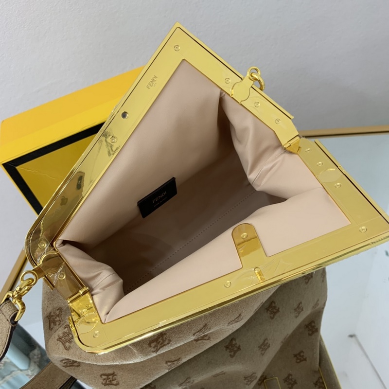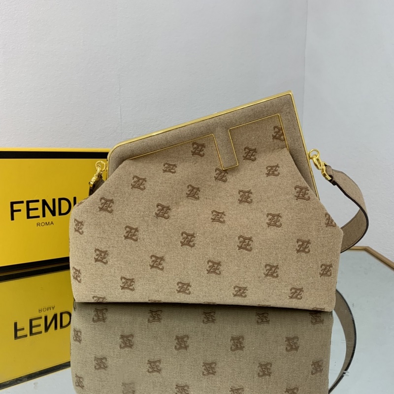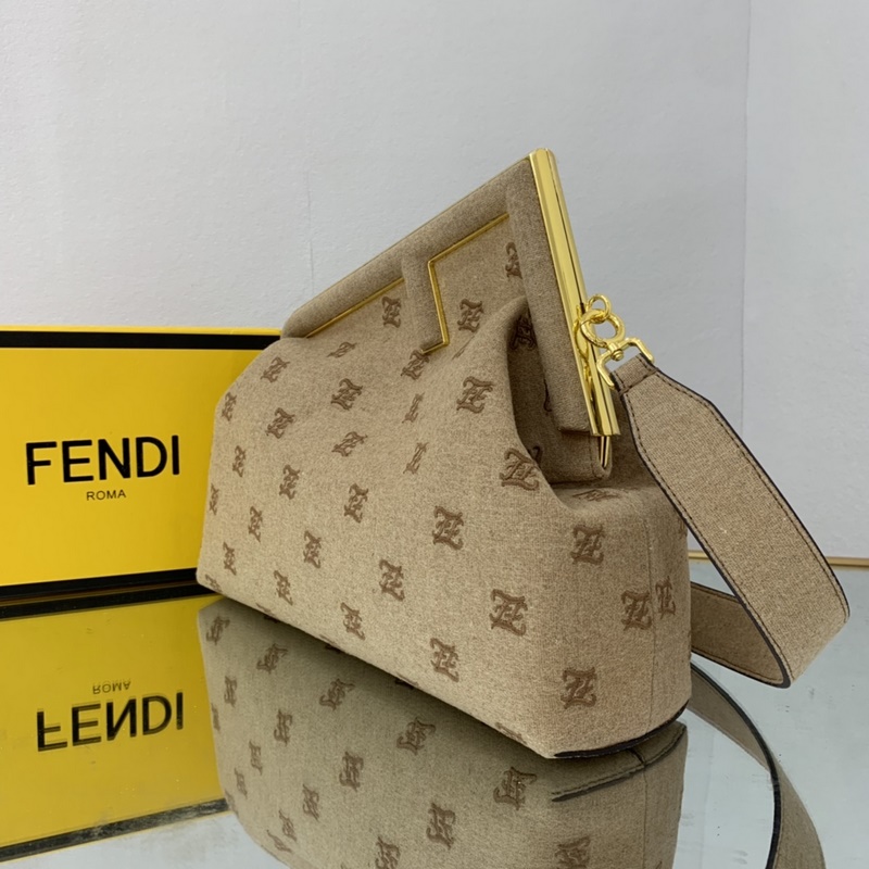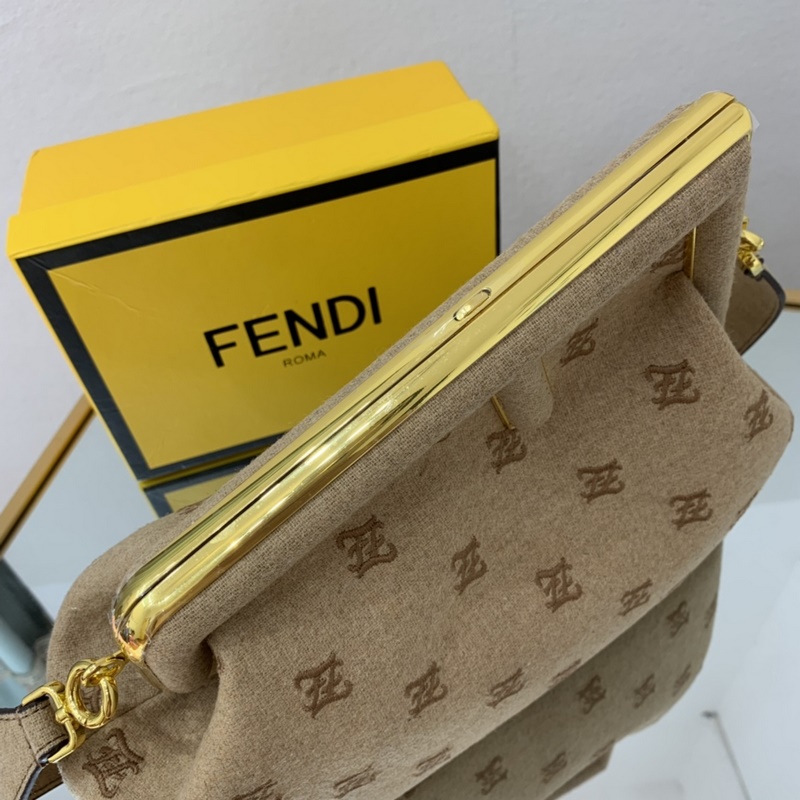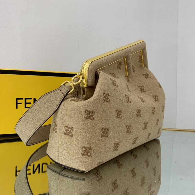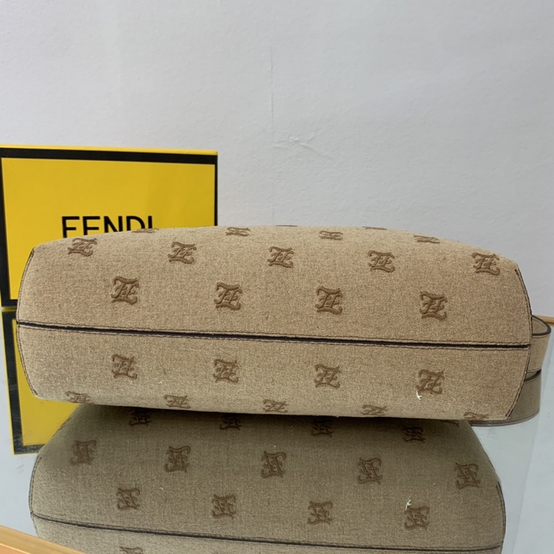 펜디 베이지색 플란넬 소재의 중간 가방 패턴 자수 장식 특대 금속 F자형 걸쇠가 같은 색상의 플란넬 안감에 가죽으로 고정되어 있는 내부 수납공간과 금색 금속 장식 탈착식 플란넬 어깨 스트랩이 있어 손으로 들거나 어깨에 메고 다닐 수 있습니다. 크기: 32.5*15*23.5cm 아이템 번호: BD96181150