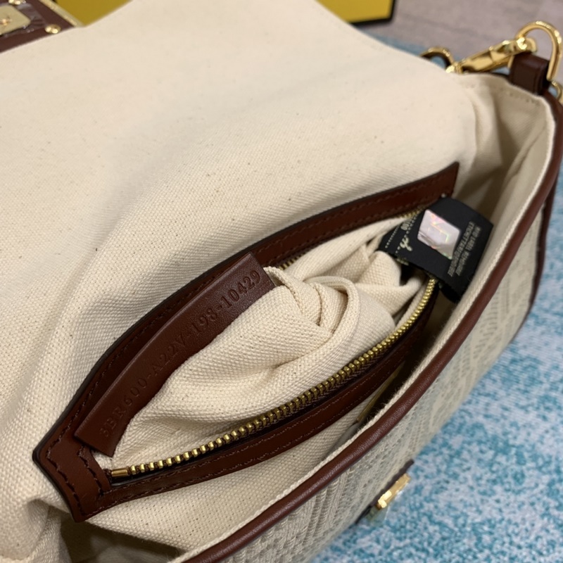 펜디 상징적인 중형 바게트 핸드백은 FF 자석 걸쇠가 달린 플랩 디자인이 특징입니다. 손으로 들거나 어깨에 걸칠 수 있는 탈착식 어깨끈이 달린 지퍼 포켓이 있는 줄무늬 베이지색 패브릭에 FF 모티브 자수 장식 황갈색 가죽 디테일 페킨 패브릭 어깨끈 금색 금속 부품 ☆ 번호: 88R600 베이지색 자수 크기 26cm 상품 번호: SD96181200