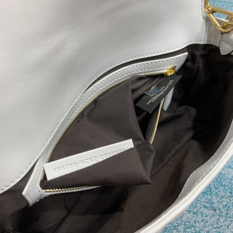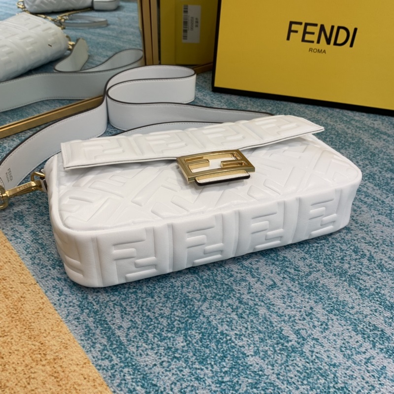 펜디 플랩이 달린 중간 크기의 바게트 핸드백 FF 자석 걸쇠 안감 지퍼 여밈 포켓 탈착식 손잡이 또는 어깨끈 부착 몸에 걸치거나 핸드백에 넣어 휴대 가능 부드럽고 입체적인 질감의 핑크색 양가죽 소재로 제작된 전체 FF 패턴의 금색 금속 부품이 있는 핸드백 이탈리아제 색상: 흰색 모델 번호: 8BS600 크기: 26*15*6 모든 제품에 상자 포함 No.: SD96181200