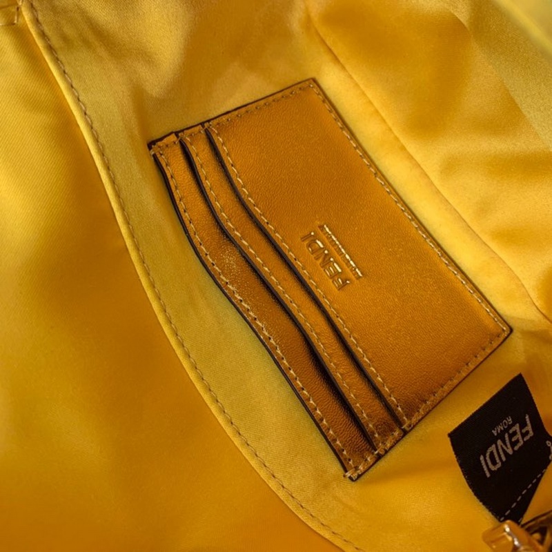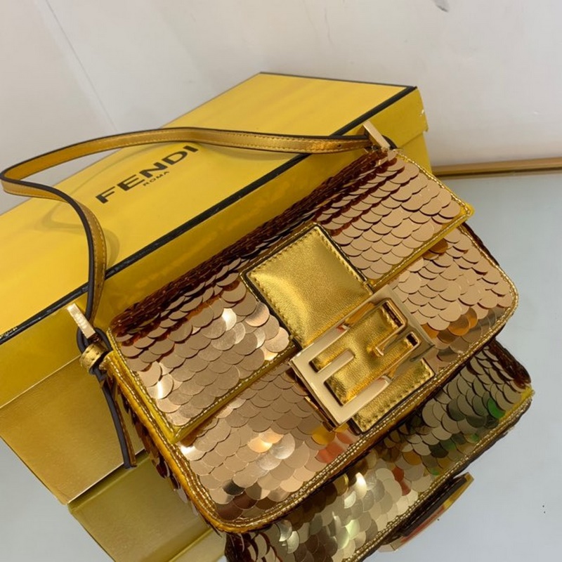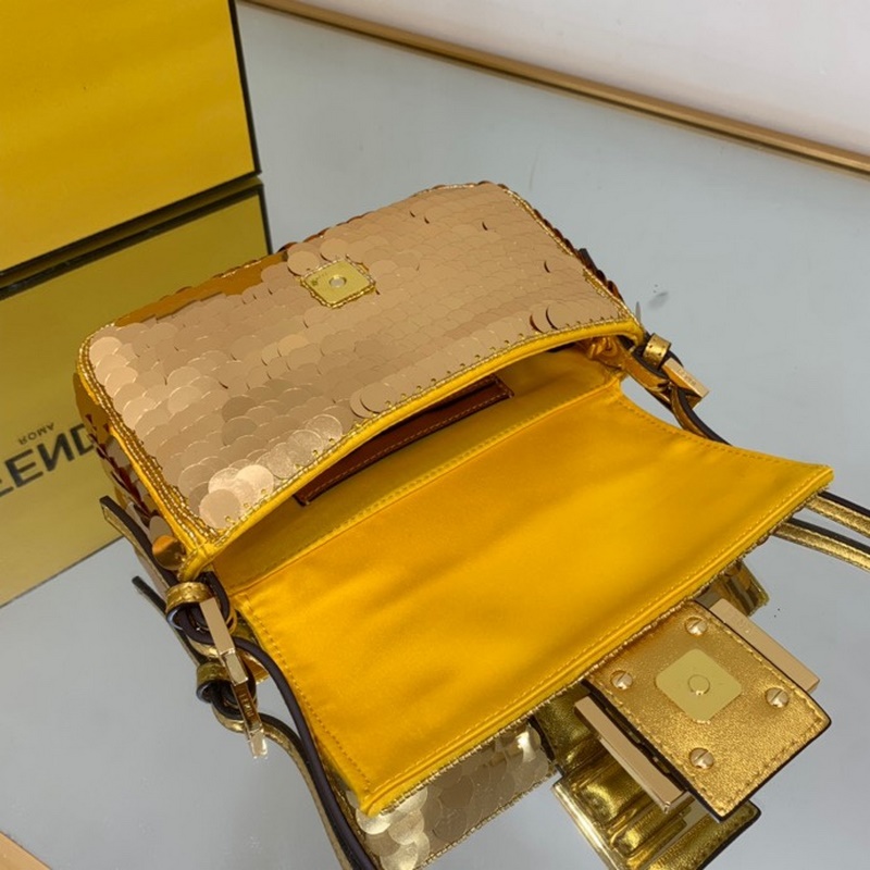 펜디 97 트럼펫 백 전체에 금색 금속 스팽글 자수 장식과 FF 버클