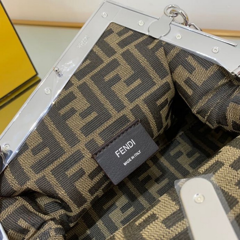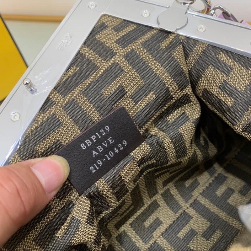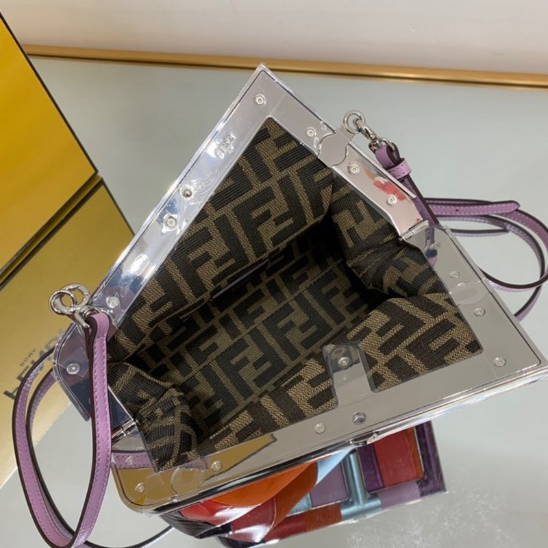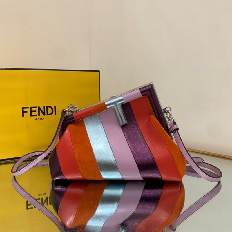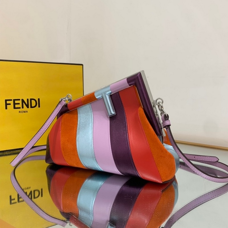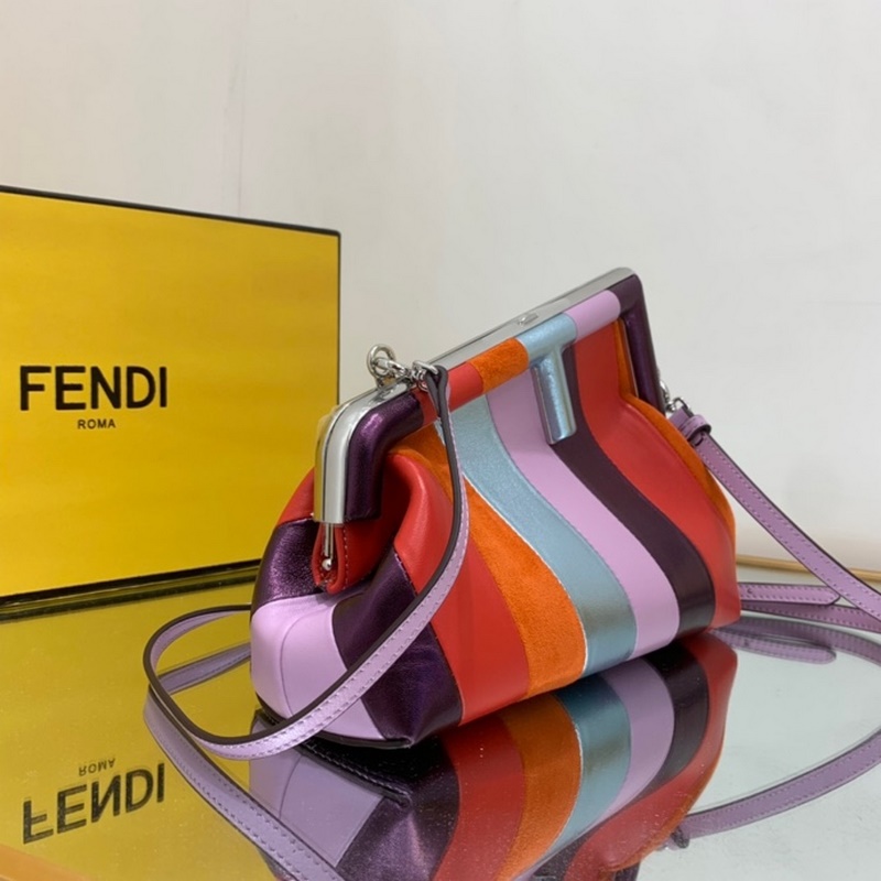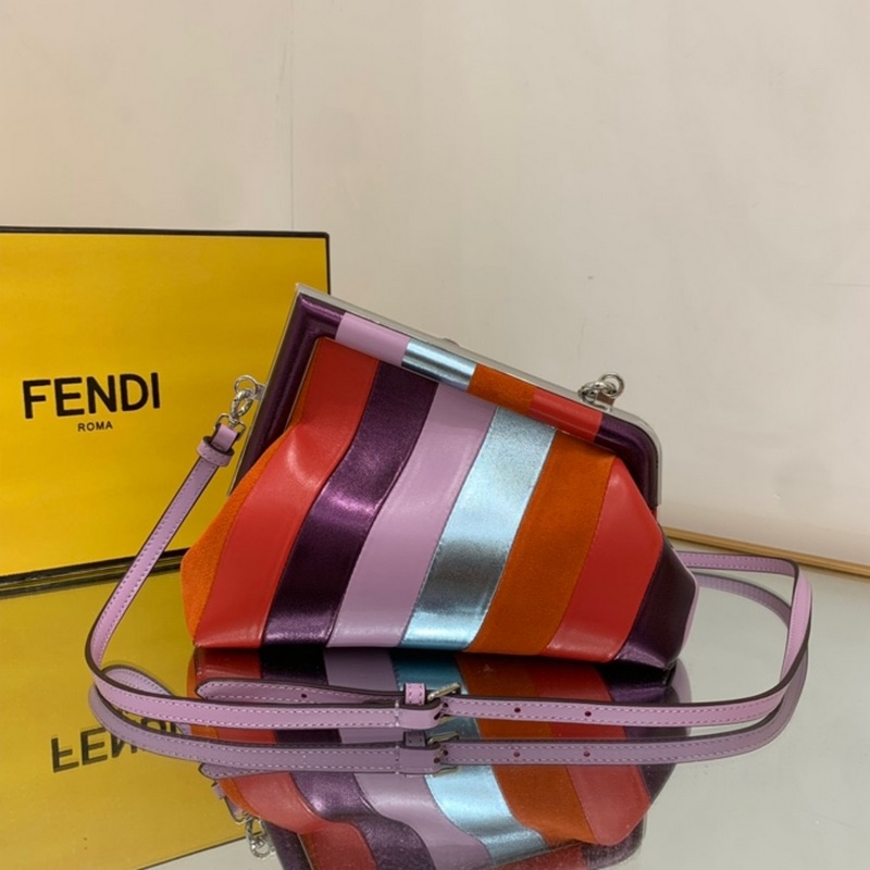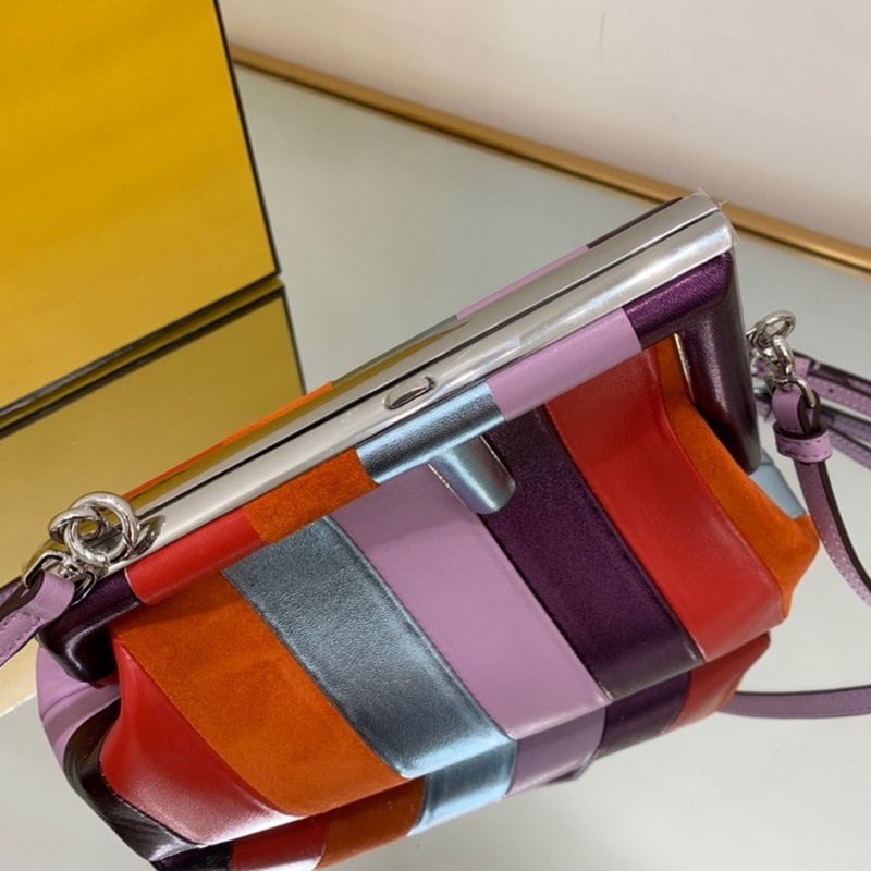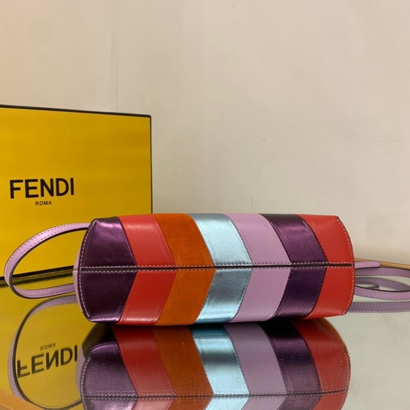 펜디 작은 가방 인레이 가죽과 스웨이드를 사용한 수제 은색과 연갈색의 대각선 줄무늬 패턴 오버사이즈 F형 금속 걸쇠와 같은 디자인의 패브릭 안감 스트랩 FF 모티브가 들어간 내부 수납공간 탈부착 가능한 내부 고리와 팔라듐 도금 금속 부품이 들어간 가방 탈부착 가능한 어깨 스트랩이 있어 손으로 들거나 어깨에 메고 다닐 수 있음 이탈리아제 크기 26 x 9.5 x 18 제품 번호 10429 퍼플 가죽 믹스 No.: BD96181350