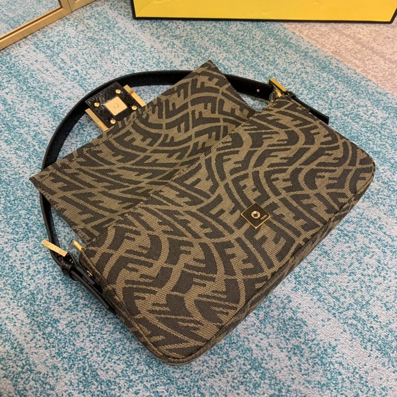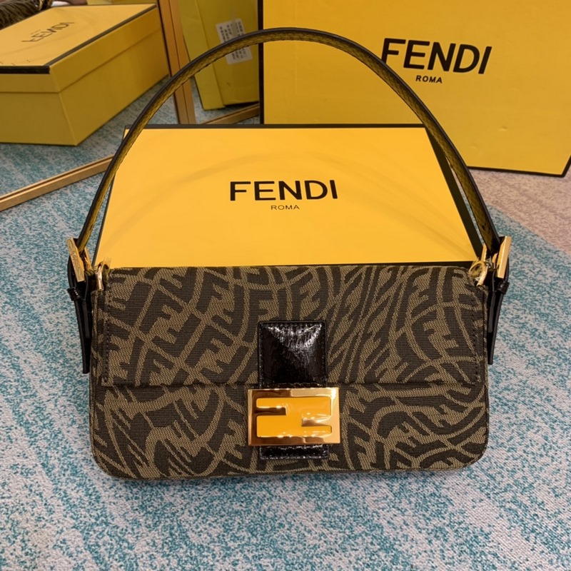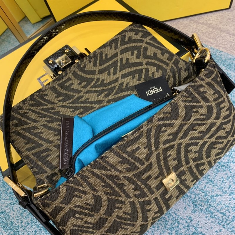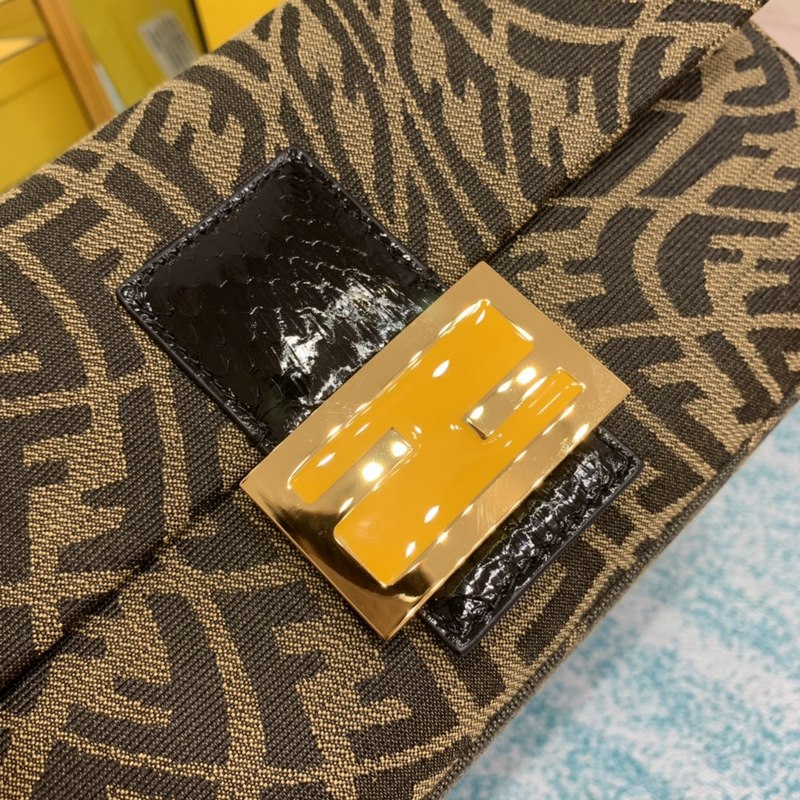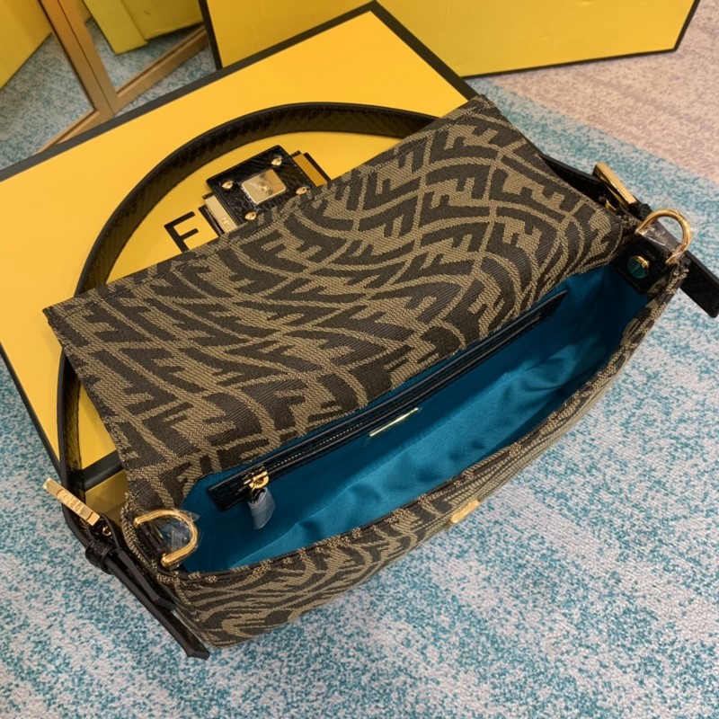 펜디 여름 캡슐 컬렉션 캔버스에 불규칙하게 장식된 무늬가 대담하고 혁신적이며 독점적인 맞춤형 뱀 가죽 암밴드를 추가하여 더욱 세련된 느낌을 줍니다. 크기 27×4×13cm 중간 크기의 바게트 트윌에 검은색 뱀 가죽 ☆ 번호: 2232. 상자 포함 번호: SD96181020