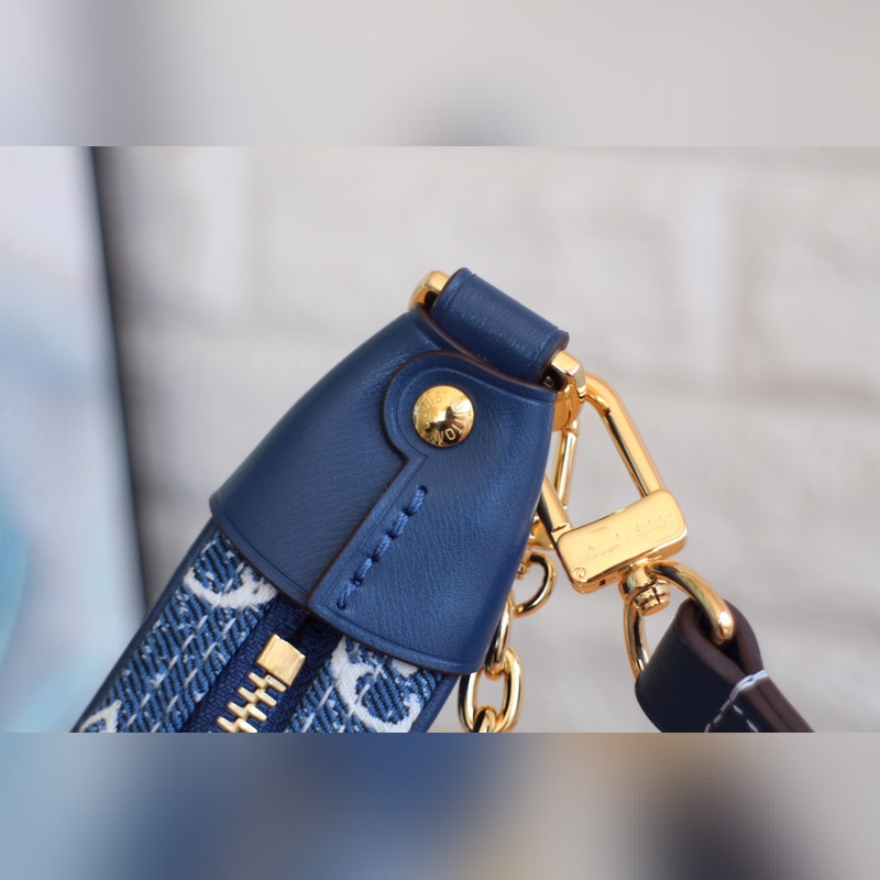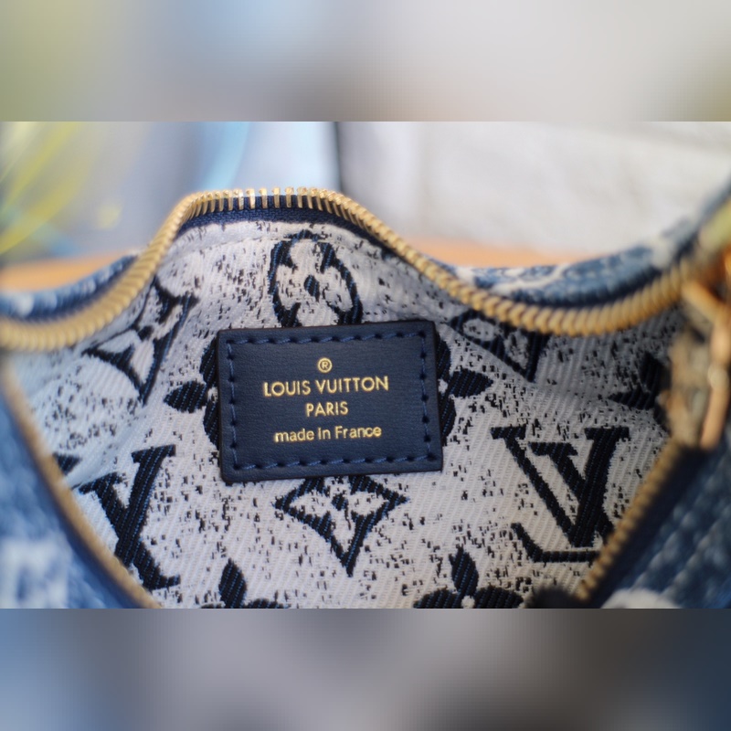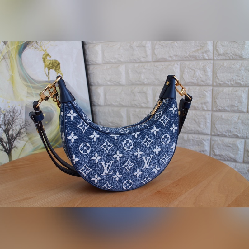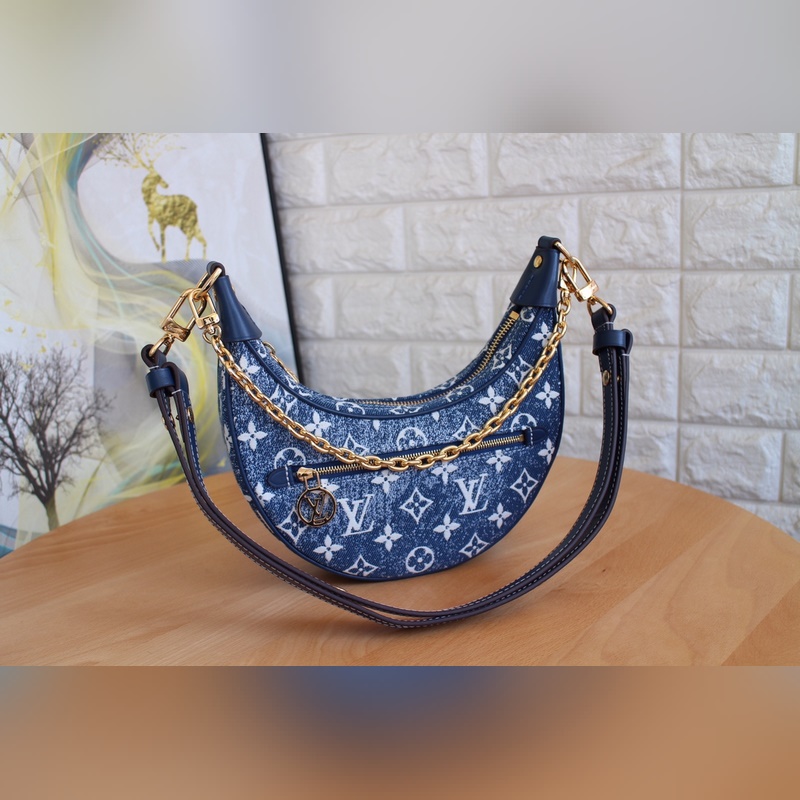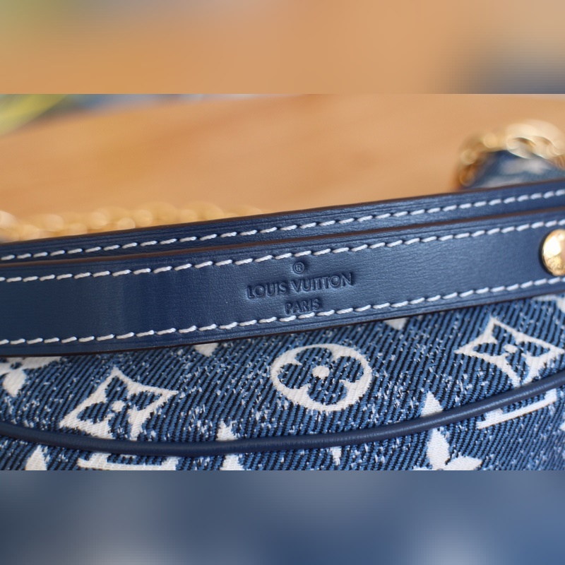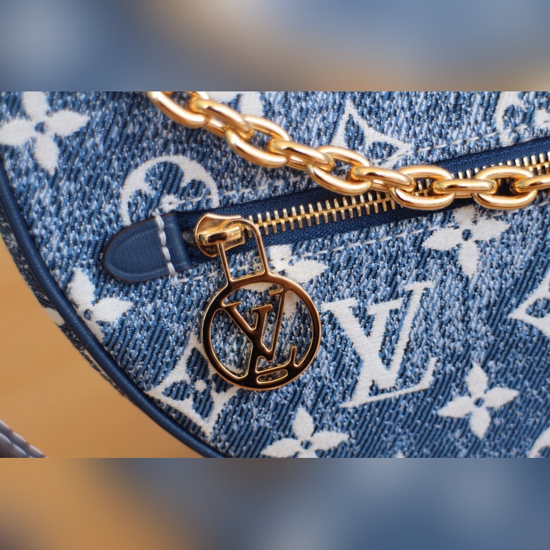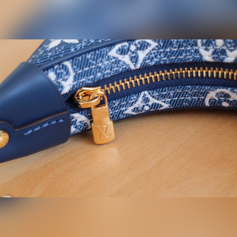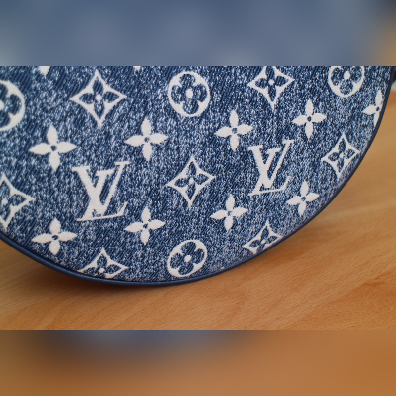 LV 모델: 81166 루프 반달 바게트 2022 크루즈 쇼에서 처음 선보인 이 가방은 페이드 효과가 있는 데님 소재에 모노그램 자카드 패턴이 특징이며 가죽 트리밍과 어깨 스트랩이 달려 있습니다. LV 서클 지퍼 손잡이와 탈착식 체인은 세련된 디테일을 완성합니다. 소가죽과 소가죽 트림이 있는 자카드 데님 단방향 자카드 데님 안감 금속 소재 1개 앞면 지퍼 포켓 1개 LV 서클 로고 지퍼 손잡이 탈부착 및 길이 조절이 가능한 어깨 스트랩! 크기: 23x13x6cm