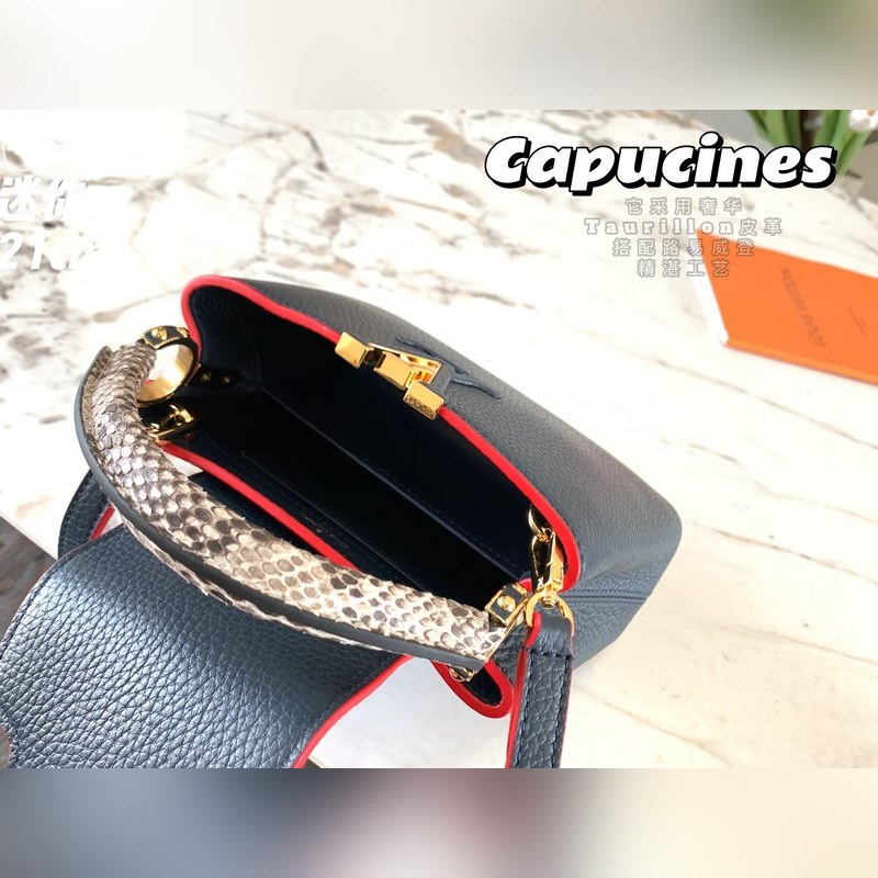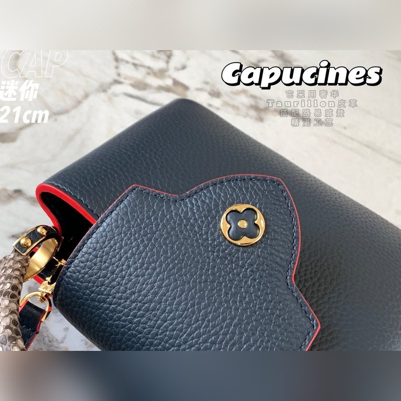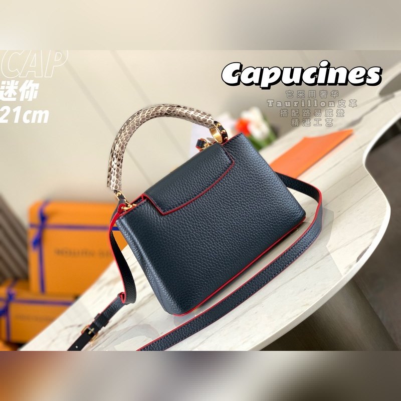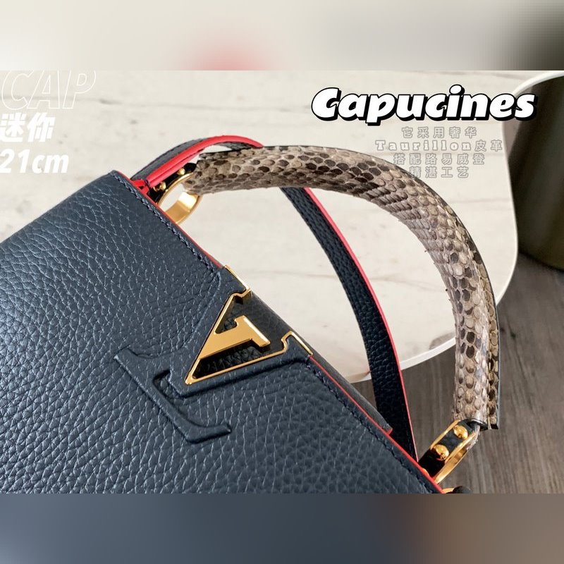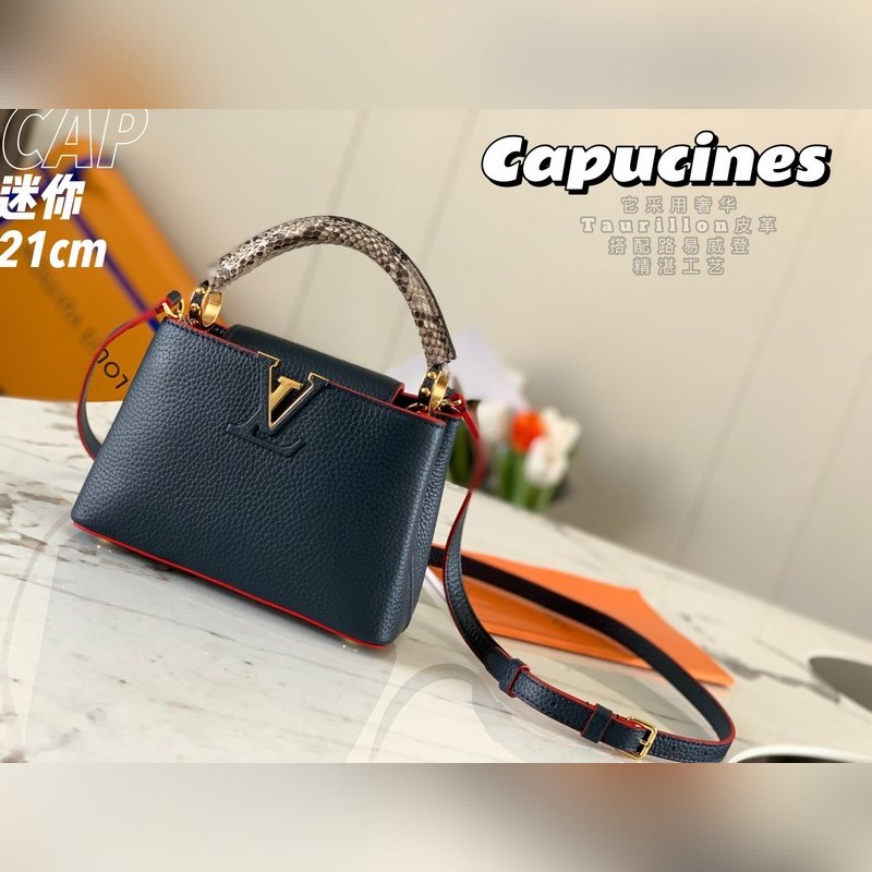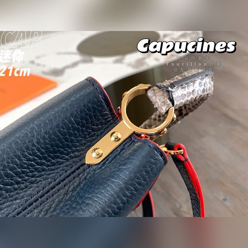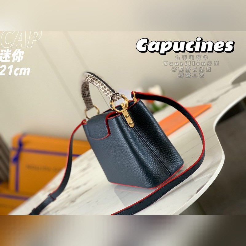 LV Capucines 미니 백 모델 M92822 네이비 블루와 골드 버클 이 Capucines 미니 백은 고급스러운 타우리옹 가죽과 파이톤 가죽 손잡이의 은은한 광택을 자랑하며 상징적인 글자가 장식되어 있습니다. 탈부착이 가능한 넓은 어깨 스트랩을 활용하면 컴팩트한 크기로 어깨에 메거나 크로스 바디로 메는 것이 가능합니다. 크기: 21.0 x 14.0 x 8.0cm