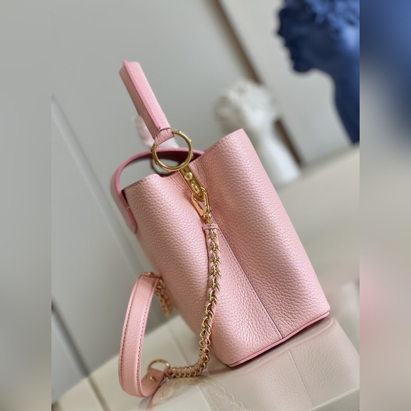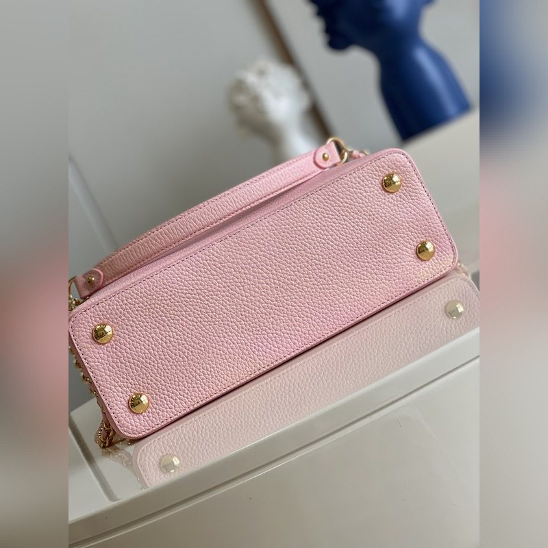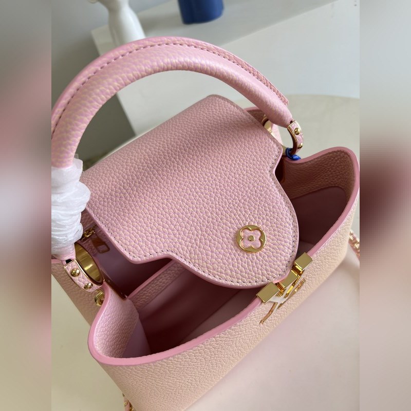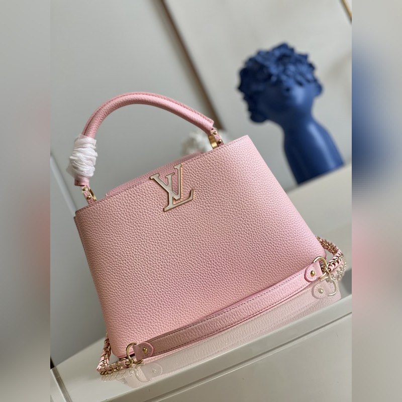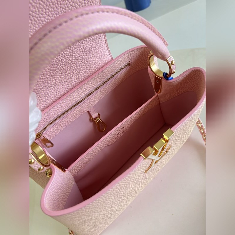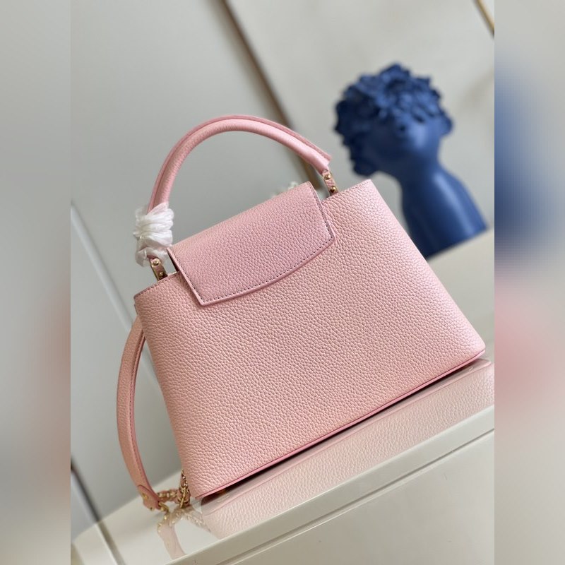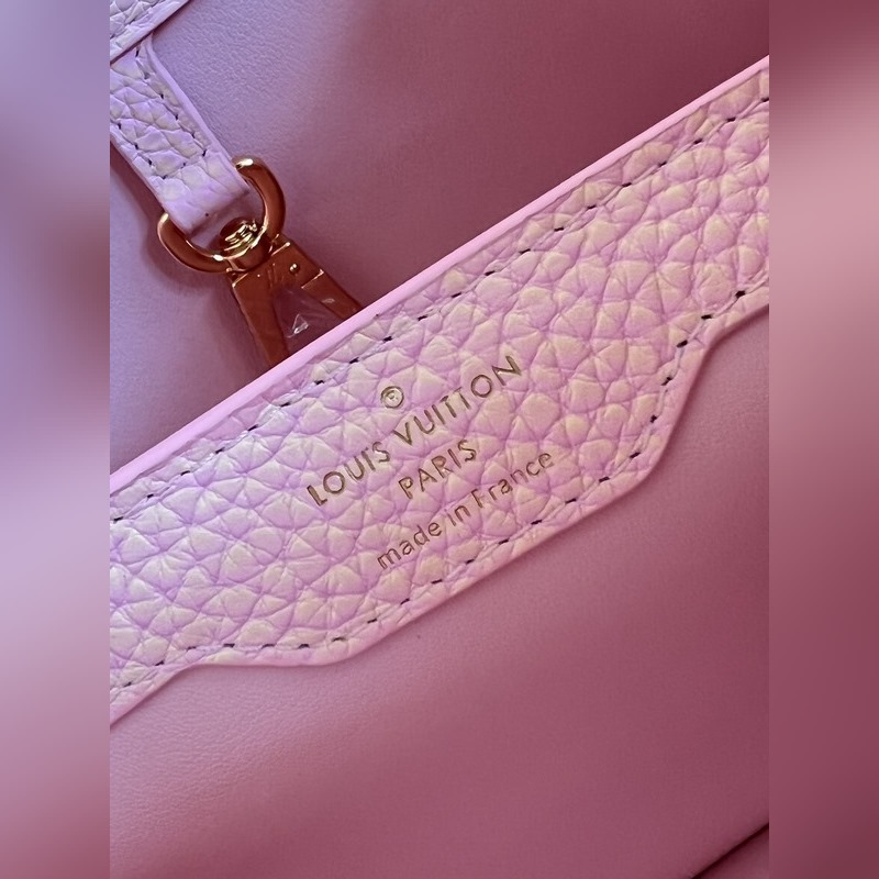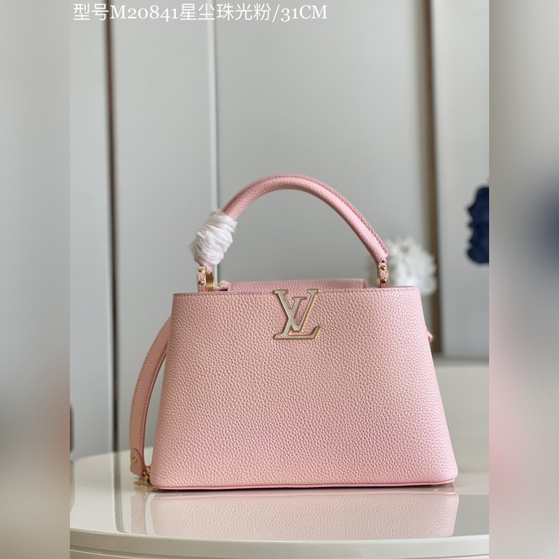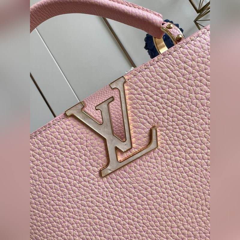 LV 모델 M20841 스타 모양의 진주 가죽 소재 캡슐린 MM 이 Capucines MM 가방은 다양한 조명 아래에서 타우리옹 가죽의 색상 변화를 보여줍니다. LV 글자는 광택이 있는 조개껍질 같은 광택으로 반짝이며 단일 핸들과 탈착식 가죽 브레이드 체인은 다양한 운반 옵션을 제공합니다. 크기 31.5 x 20 x 11cm