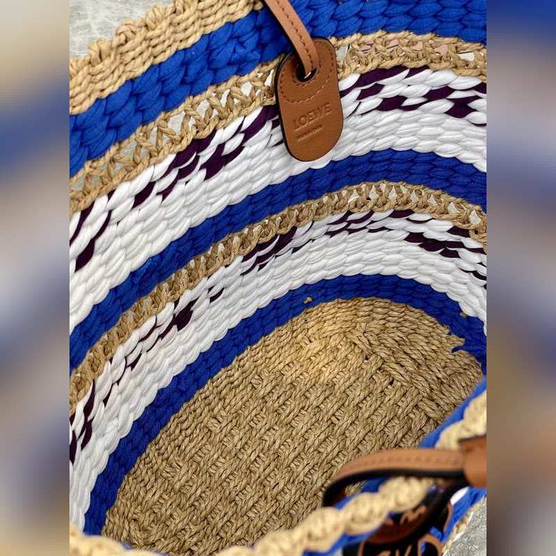 로이웨 바스켓 토트 숄더백 모델: L10125 새로운 직조 기법 코끼리풀과 소가죽 바스켓 토트백 전통적인 바스켓 형태의 가방으로 클래식한 수제 바디 소가죽 스트랩 그리고 소가죽으로 만든 아나그램 참이 특징입니다. 이 버전은 이전의 기성복 컬렉션에서 남은 LOEWE 원단과 코끼리풀을 함께 직조하여 제작되었습니다. 숄더백 개인화된 참과 스트랩으로 커스터마이징 가능 안감 없음 수제 제품이기 때문에 크기가 약간 다를 수 있으며 구매할 때마다 독특한 제품이 제공됩니다. 사이즈: 가방 입구 길이 34*높이*24*두께 11cm