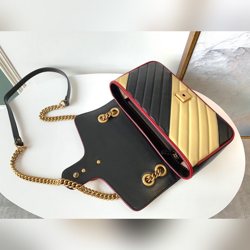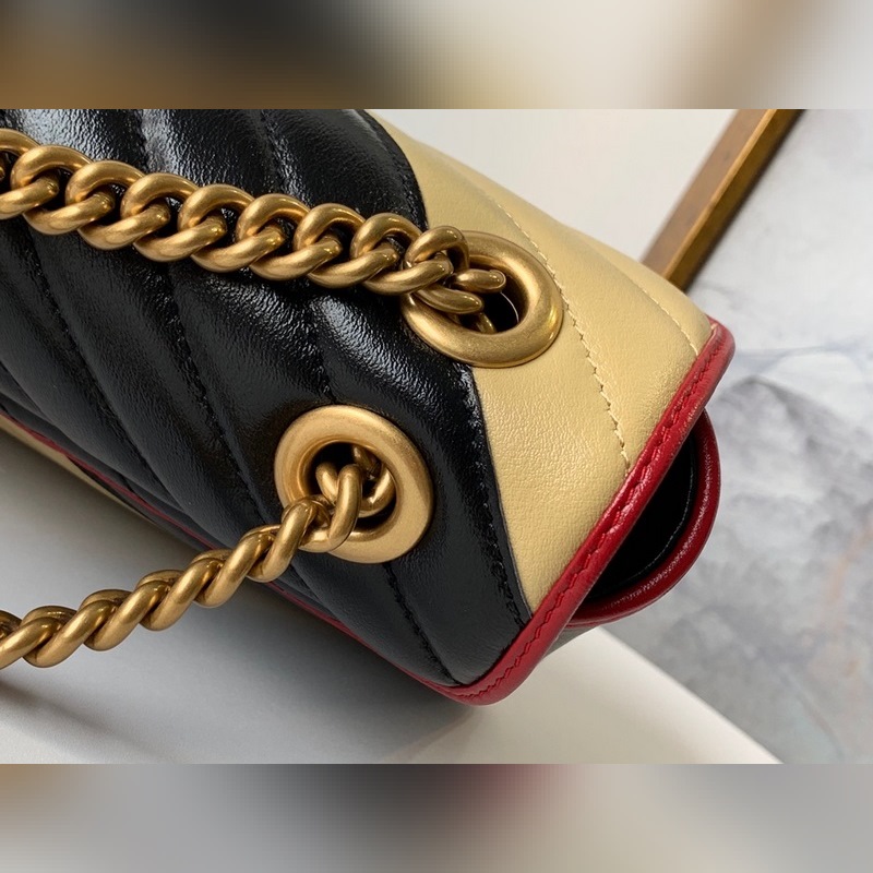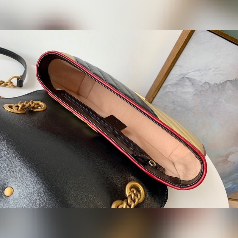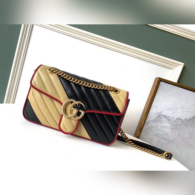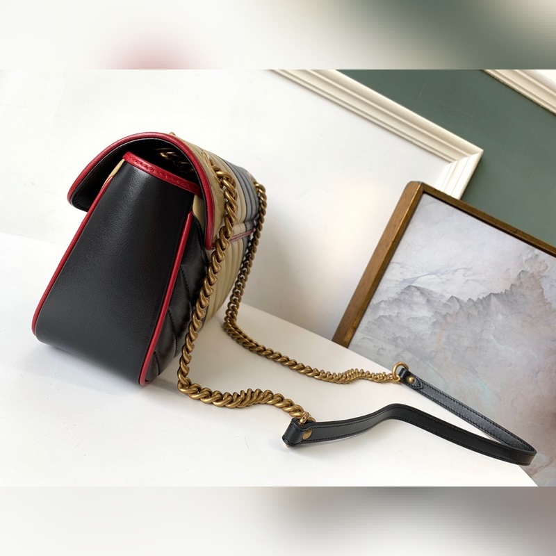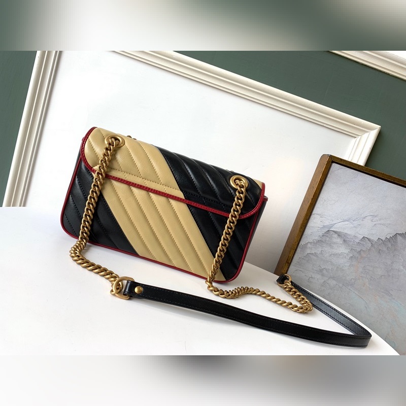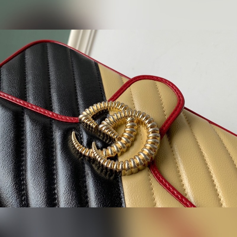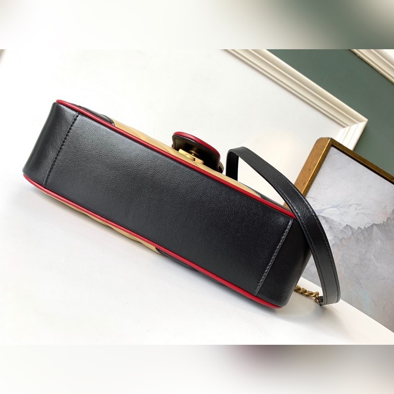 GUCCI GG 마몽트 숄더백 모델 443497 블랙과 베이지 블랙과 베이지 색상의 트윌 퀼팅 가죽으로 제작되었으며 트위스트 리본으로 장식된 더블 G 모양의 장식 액세서리로 장식되어 있어 초가을 컬렉션의 뛰어난 매력을 참신한 스타일로 해석합니다. 크기: 26/15/7cm!