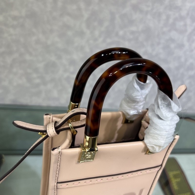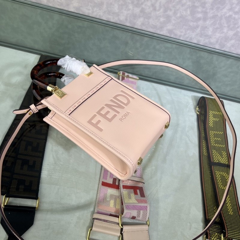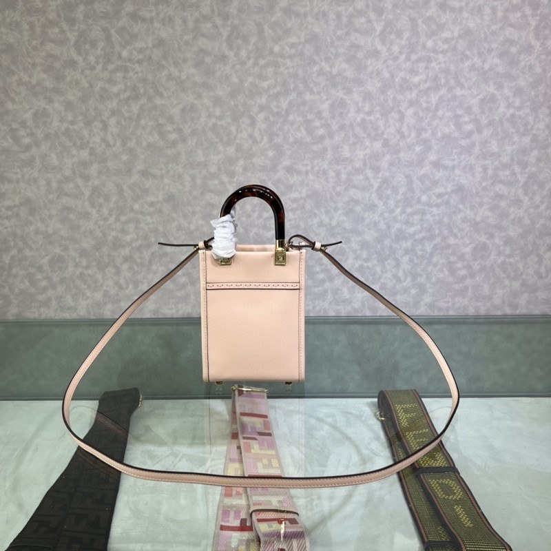 FENDI 선샤인 미니 토트백 라이트 핑크 핫 스탬핑된 FE*DI ROMA 글자와 거북이 등껍질 효과의 단단한 플렉시글라스 손잡이 - 금색 금속 부속품 안쪽 수납 공간이 있고 가죽 트림이 어울리는 플렉시글라스 손잡이가 달린 조절식 탈착식 어깨 스트랩 손 / 크로스 바디 / 어깨 크기: 13*18*6.5cm