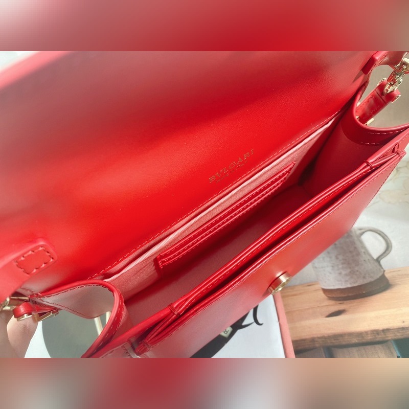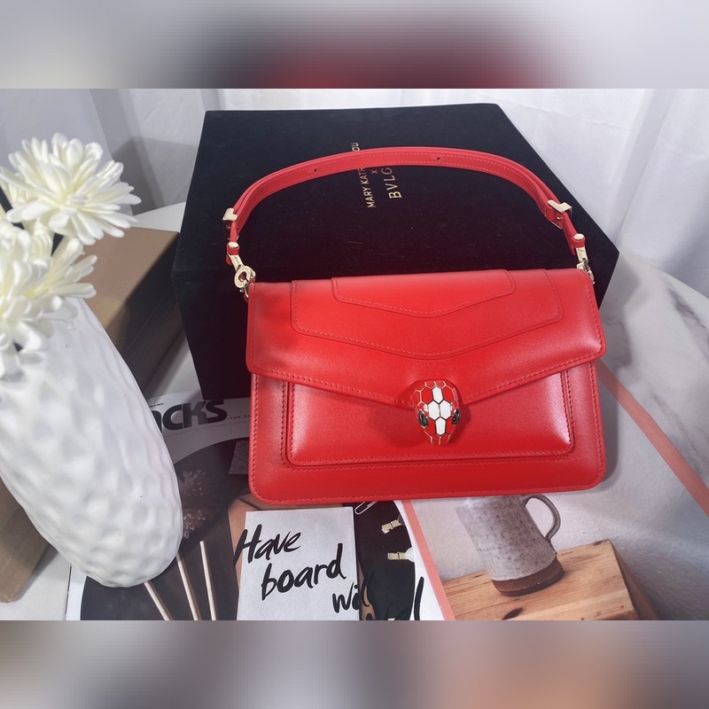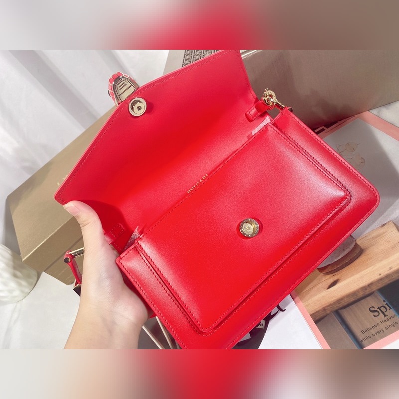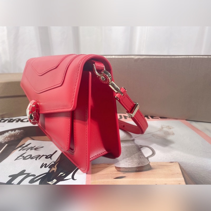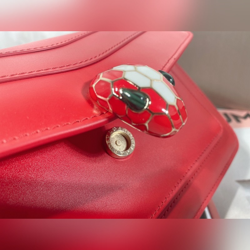 불가리 세르펜티 포에버 이스트-웨스트 시리즈 숄더백 292104950 자홍색 가넷 레드 송아지 가죽으로 제작된 이 제품은 실용적인 가죽 숄더 스트랩이 장착되어 있으며 고전적인 뱀 머리 자석 단추로 장식되어 있습니다. 이 제품은 다용도로 사용할 수 있으며 일상적인 착용에 적합합니다. 이 제품은 하나의 수납 공간 앞쪽 포켓 뒷쪽 패치 포켓 내부 퀼팅 포켓 카드 슬롯 3개 한쪽 면에 화장품 거울 뒷면에 불가리 금속 로고가 있습니다. 크기 22 X 15 X 4.5cm