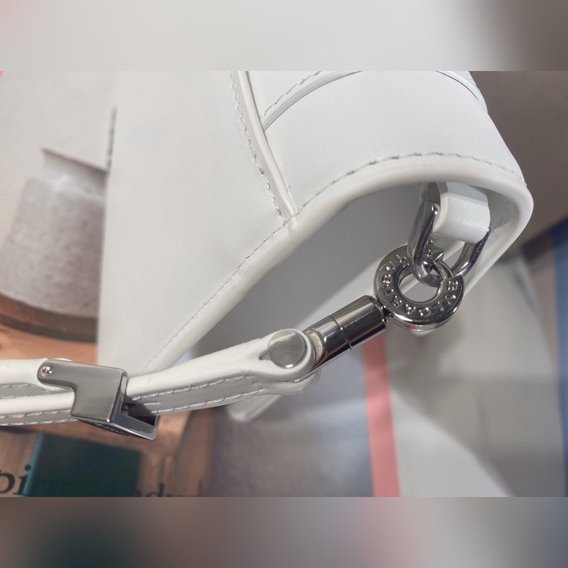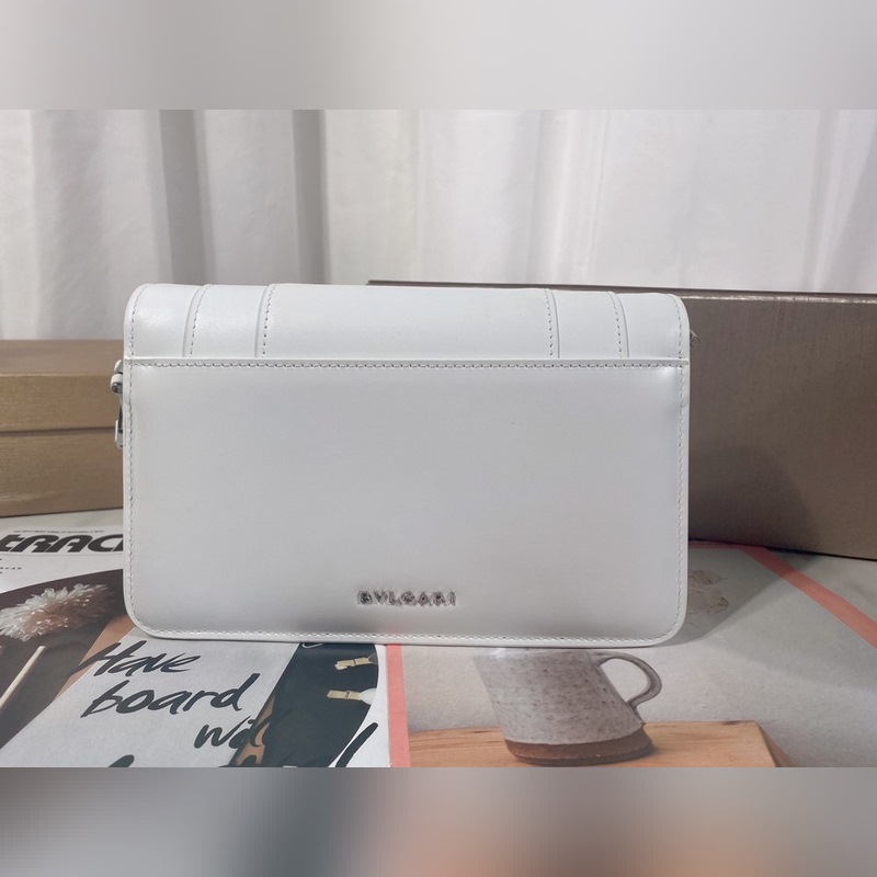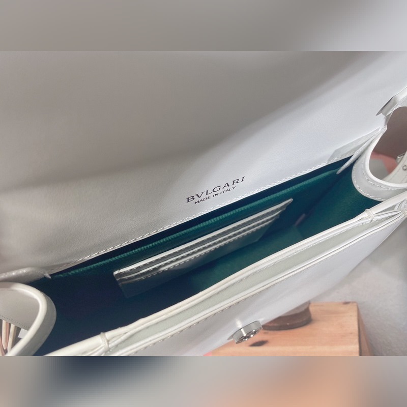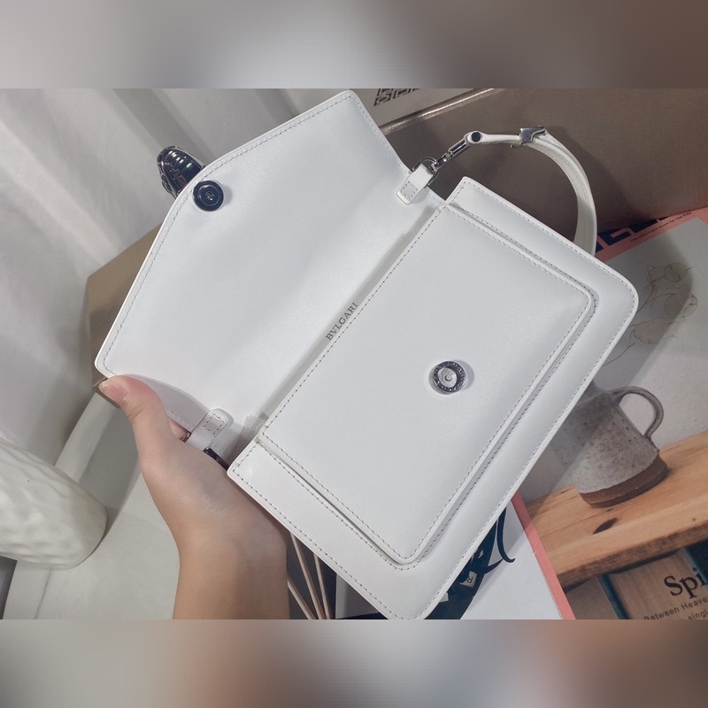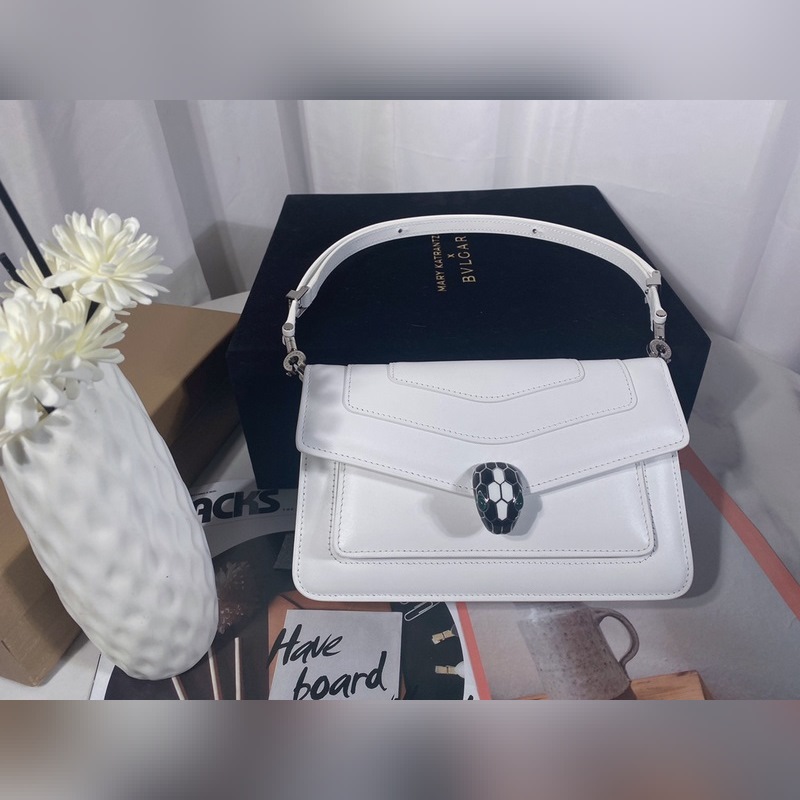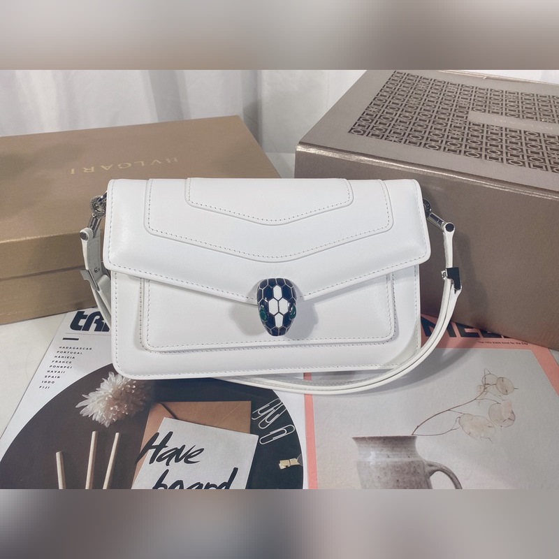 불가리 세르펜티 포에버 이스트-웨스트 시리즈 숄더백 292104950 흰색 송아지 가죽으로 제작된 이 제품은 실용적인 가죽 어깨 끈이 달려 있으며 고전적인 뱀 머리 자석 단추로 장식되어 있습니다. 이 제품은 다용도로 사용할 수 있으며 일상적으로 착용하기에도 적합합니다. 이 제품은 하나의 수납 공간 앞쪽 포켓 뒷쪽 패치 포켓 내부 퀼팅 포켓 카드 슬롯 3개 한쪽 면에 화장품 거울 뒷면에 불가리 금속 로고가 있습니다. 크기 22 X 15 X 4.5cm