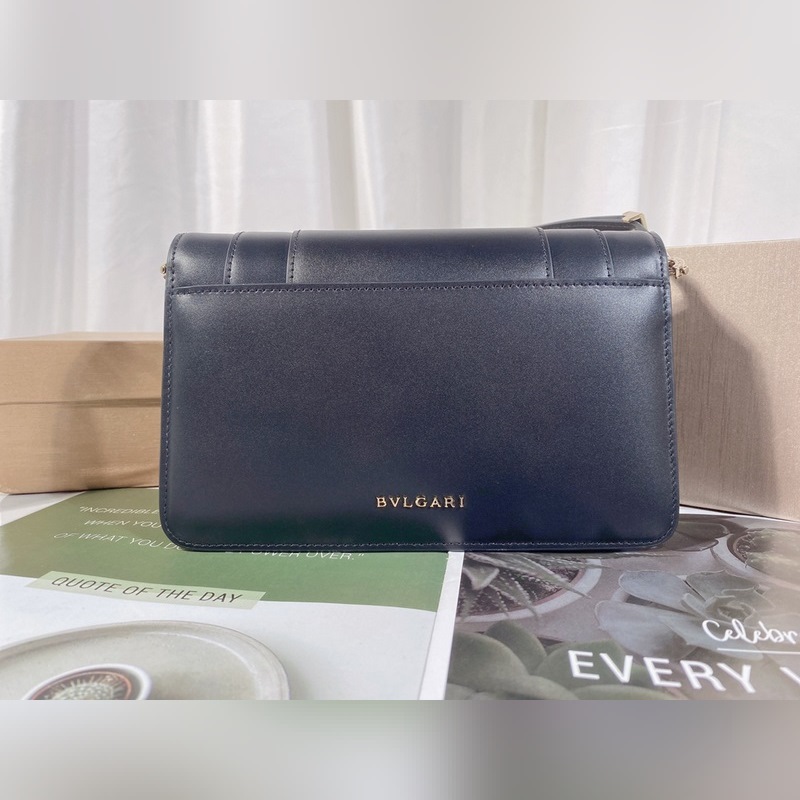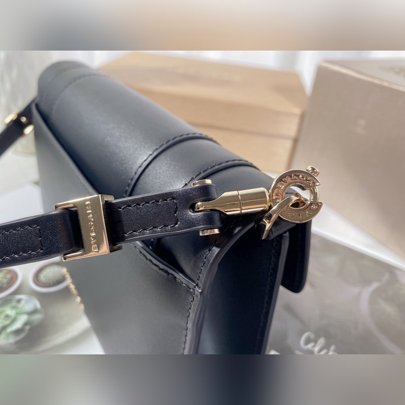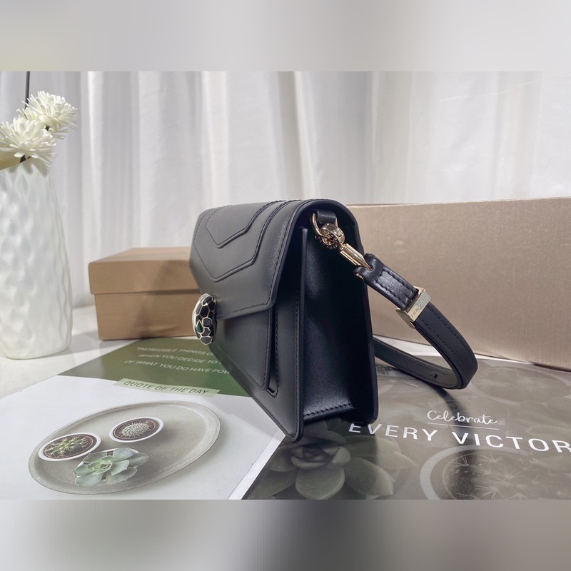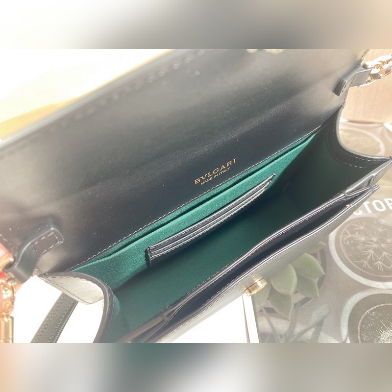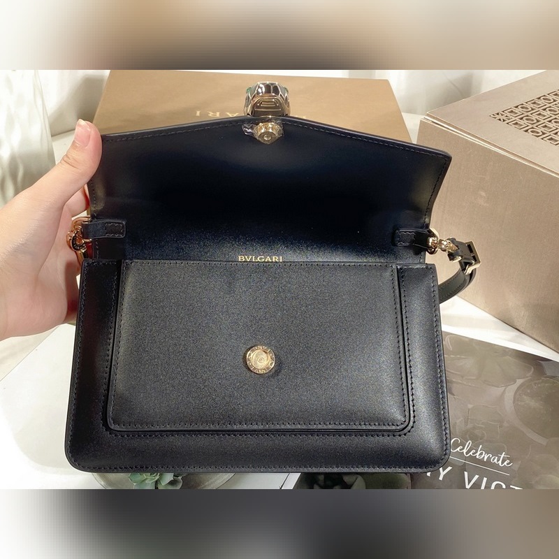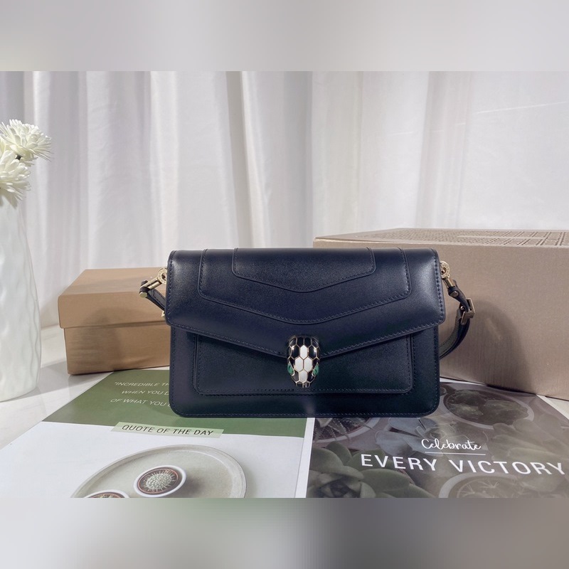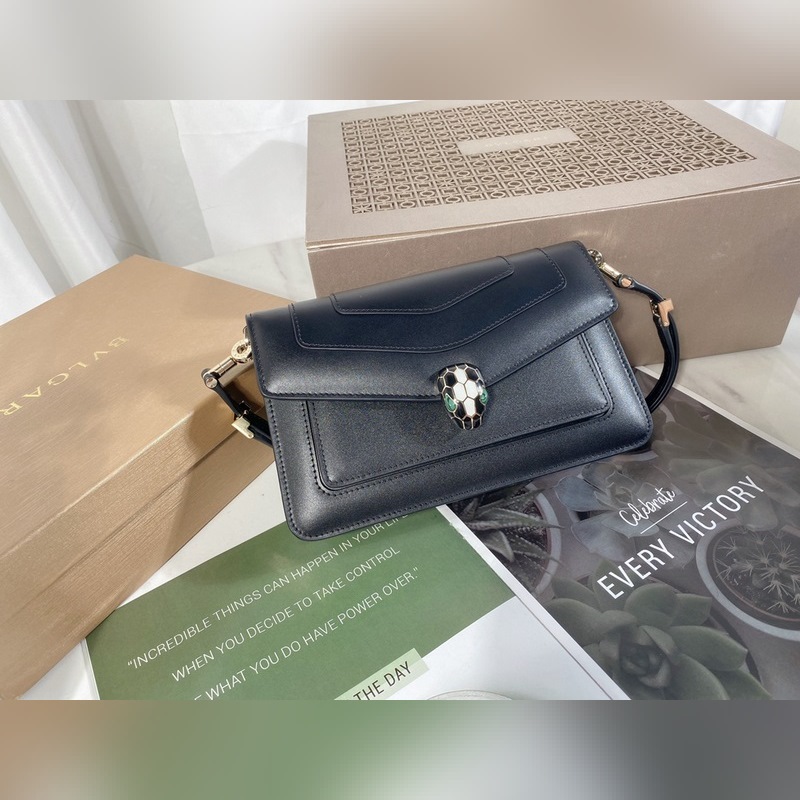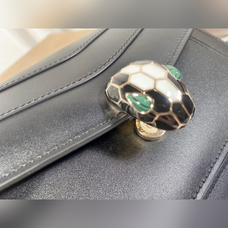 불가리 세르펜티 포에버 이스트-웨스트 시리즈 숄더백 292104950 검은색 송아지 가죽으로 제작된 이 제품은 실용적인 가죽 어깨끈이 달려 있으며 고전적인 뱀 머리 자석 단추로 장식되어 있습니다. 이 제품은 다용도로 사용할 수 있으며 일상적인 착용에 적합합니다. 이 제품은 하나의 수납 공간 앞쪽 포켓 뒷쪽 패치 포켓 내부 퀼팅 포켓 카드 슬롯 3개 한쪽 면에 화장품 거울 뒷면에 불가리 금속 로고가 있습니다. 크기 22 X 15 X 4.5cm