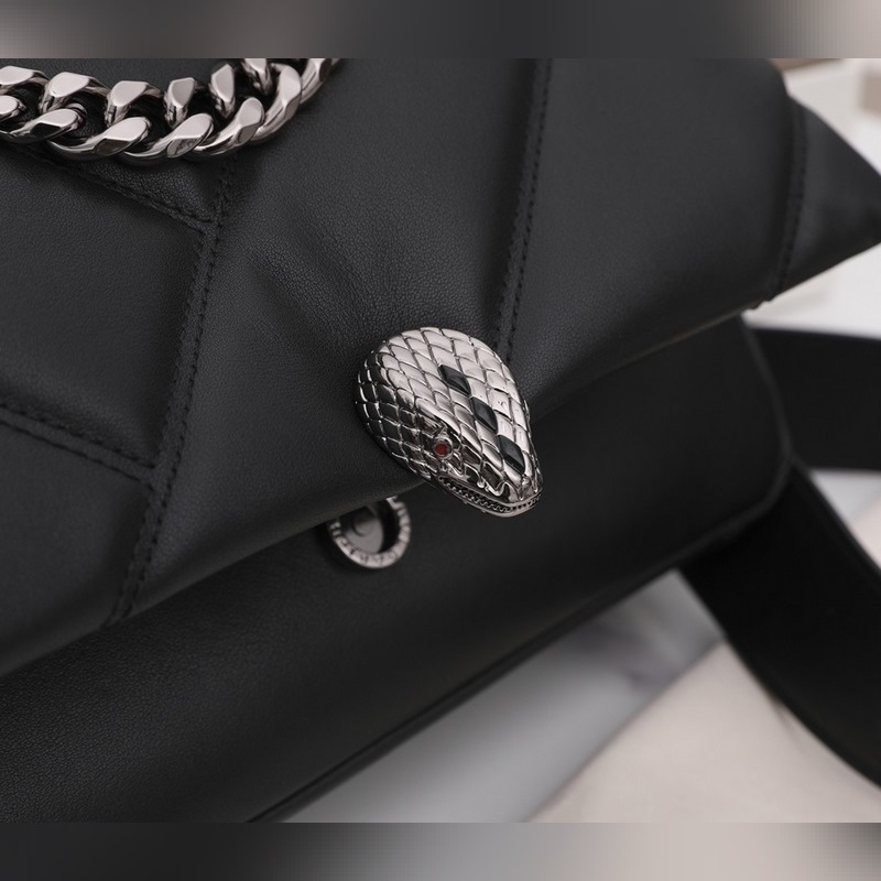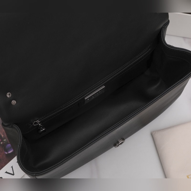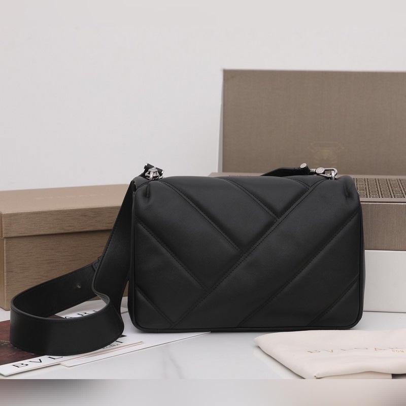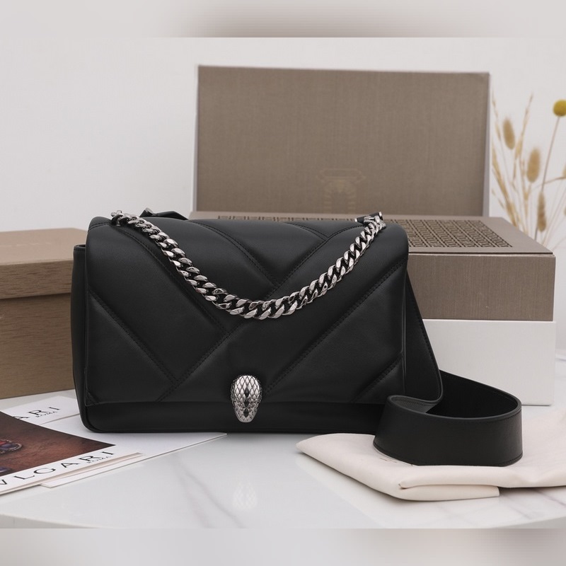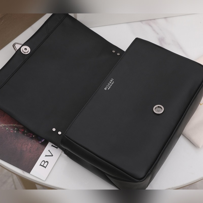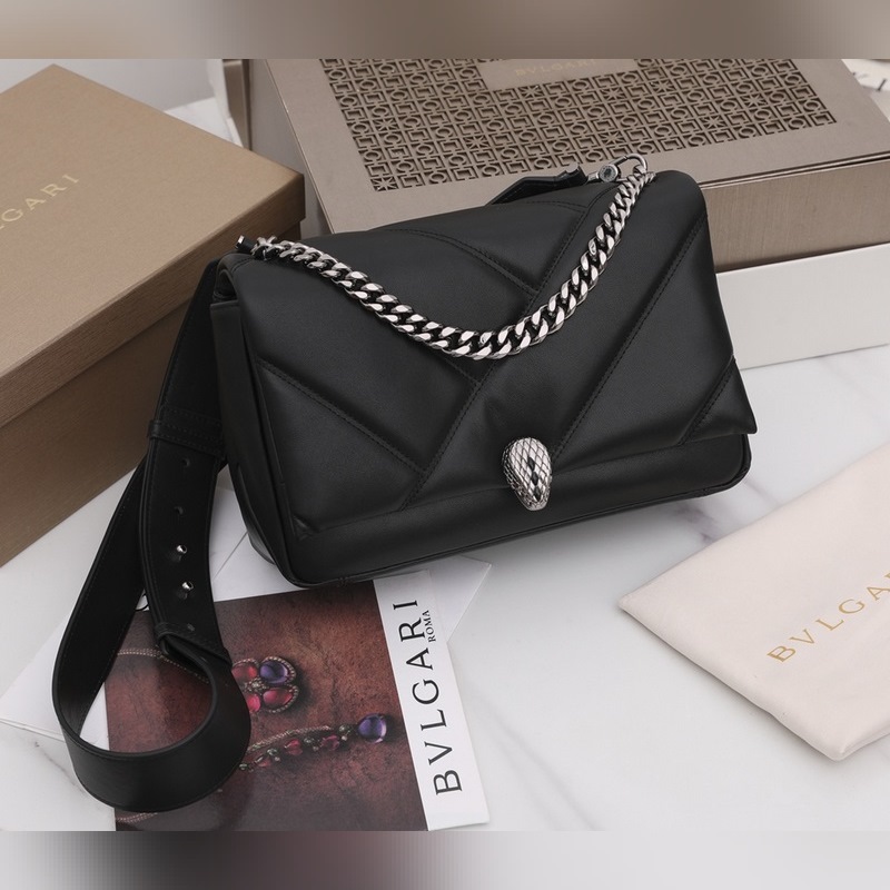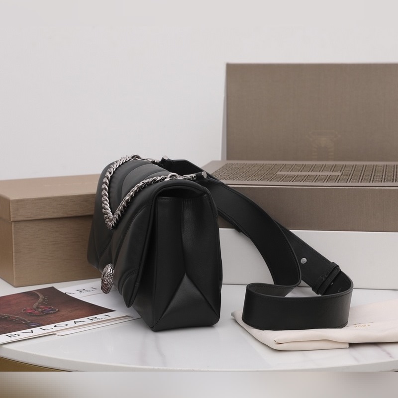 불가리 세르펜티 카보숑 크로스바디 백 모델: 2808891200 화려한 대형 그래픽 패턴과 대담한 메탈 디테일이 돋보이는 이 가방의 주요 부분은 부드럽고 매끄러운 검은 송아지 가죽으로 만들어졌습니다. 루테늄 도금된 다크 브라스 세르펜티 뱀 머리 걸쇠는 1960년대 BVLGARI의 앤티크 시계에서 영감을 얻어 제작되었으며 중앙에 작은 검은색 오닉스 뱀 비늘이 있고 빨간색 에나멜 눈으로 장식되어 있어 독창적인 느낌을 줍니다. 이 가방은 조절 가능하고 탈부착이 가능한 가죽 어깨끈이 있어 핸드백이나 클러치백으로 다양하게 사용할 수 있으며 낮과 밤에 상관없이 착용할 수 있습니다. 중간 크기이며 수납 공간 1개 내부 지퍼 포켓 1개 내부 오픈 포켓 1개가 있습니다. 내부 금속 명판에 BVLGARI 로고가 새겨져 있습니다. 크기 27 X 18 X 11cm
