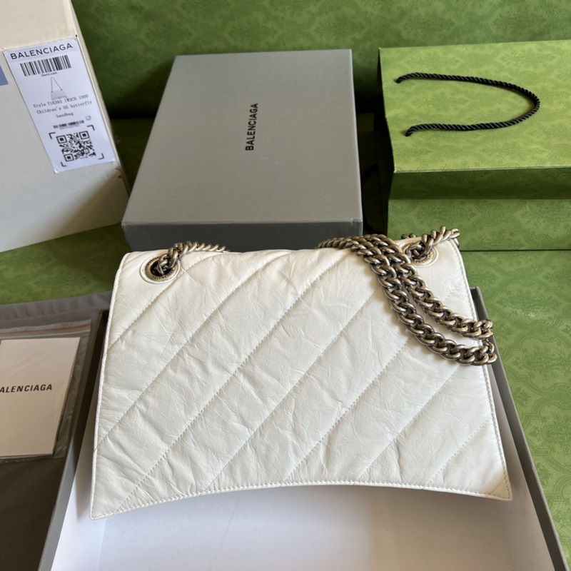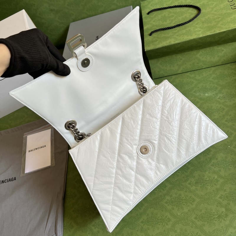 발렌시아가 22번째 가을/겨울 시리즈에서 강력하고 실용적인 대형 가방이 다시 돌아왔습니다! 모래시계 모양의 가방에 클래식한 B자형 금속 로고가 장식되어 있습니다. 매우 부드러운 송아지 가죽은 종이처럼 구겨진 듯한 질감을 주는 특별한 마감 처리가 되어 있습니다. 대각선 퀼팅 패딩 공정을 통해 다운 소재의 슈트 같은 느낌을 주며 매우 부드럽고 탄력적입니다! 가방은 용량이 크고 여러 개의 내부 수납 공간이 있어 편리합니다. 두꺼운 금속 체인 숄더 스트랩을 이용하면 길이를 자유롭게 조절할 수 있습니다. 체인 숄더백으로 착용하든 체인 핸드백으로 착용하든 아니면 팔 아래에 메고 다니든 전혀 다른 분위기를 연출할 수 있습니다. 모델 번호: 716393. 크기: 31x19.8x6.9cm. 색상: 은색/갈라진 가죽. 아이템 번호: XP96181350