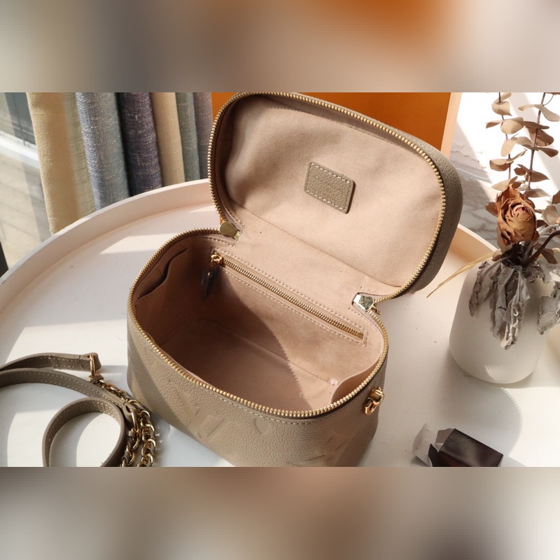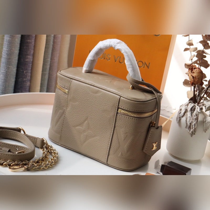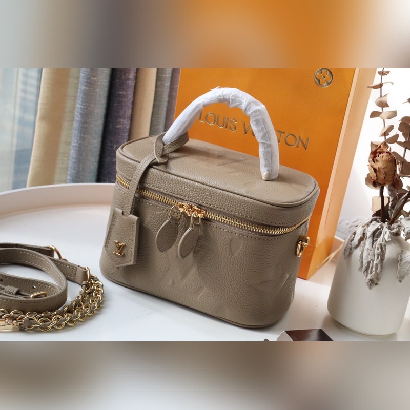 LV 베니티 스몰 핸드백 모델 번호: M45608 이 허영의 작은 가방 거대한 모노그램 엠보싱 우아한 모양 가죽 상단 손잡이가 특징입니다. 가죽 끈으로 지퍼를 쉽게 열 수 있고 자물쇠로 안전하게 보관할 수 있습니다. 탈부착이 가능하고 길이 조절이 가능한 어깨 끈은 가죽으로 엮은 체인으로 만들어졌습니다. 크기 19×13×11cm 아이템 번호: LD96181100