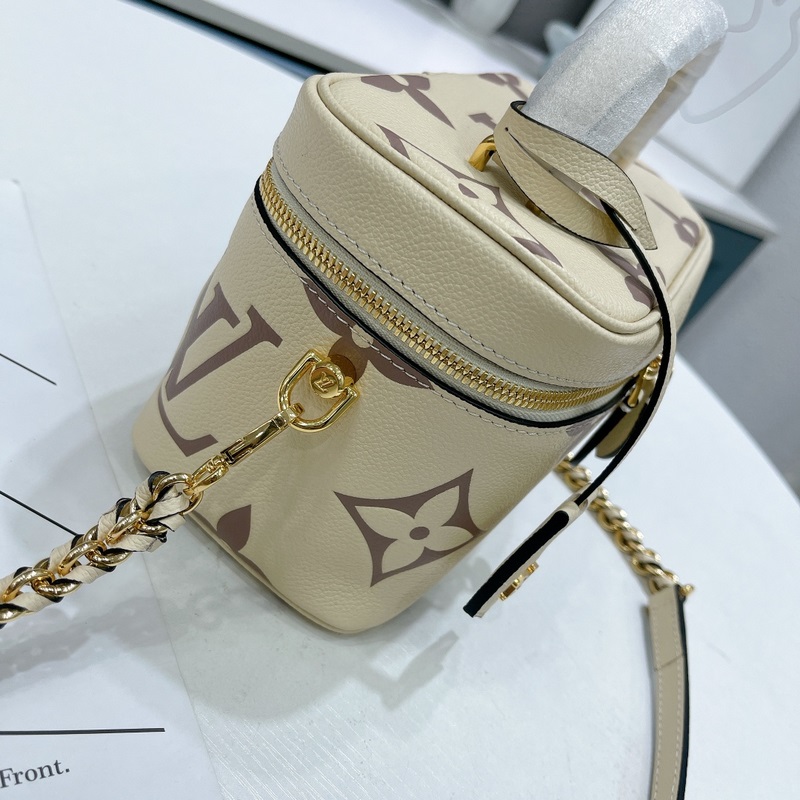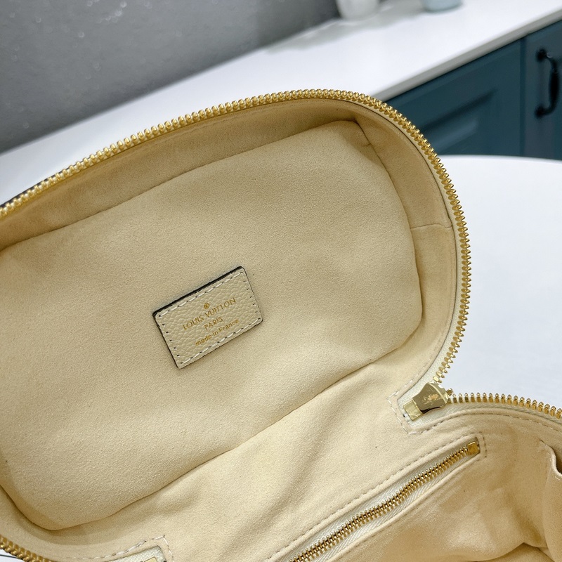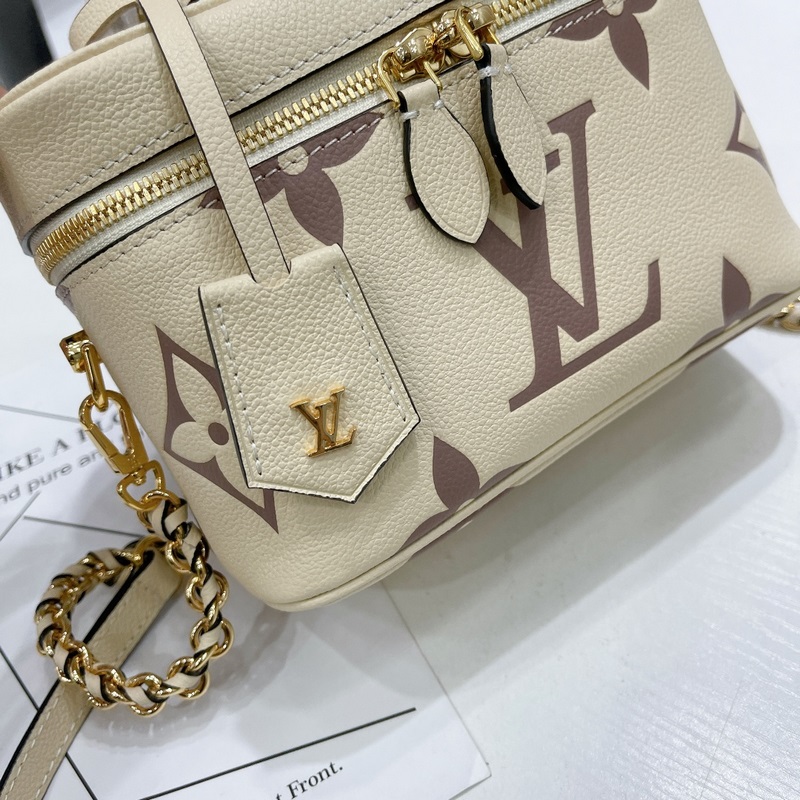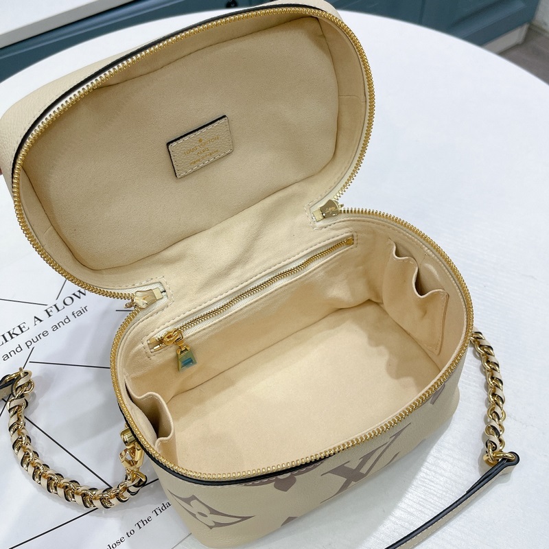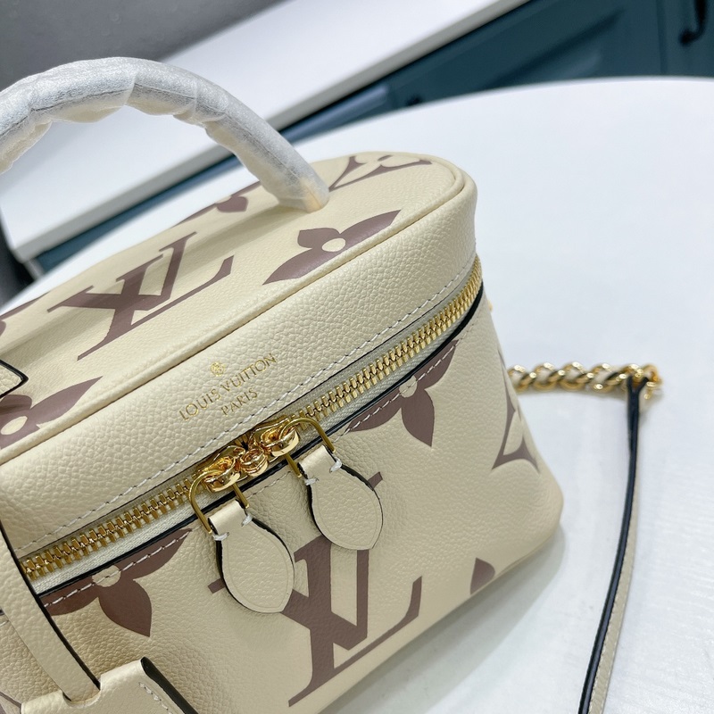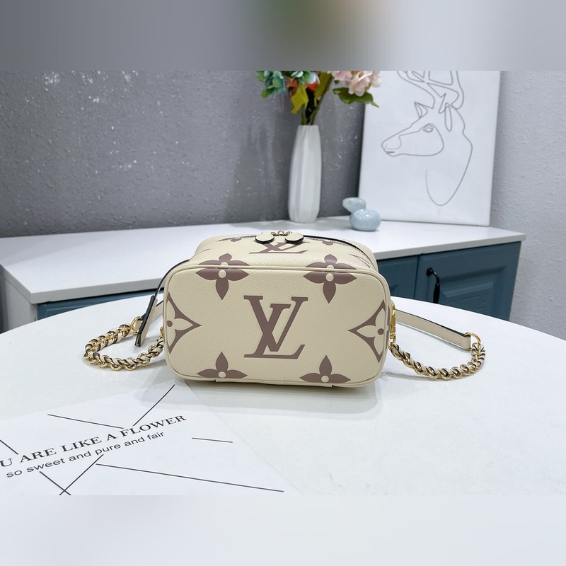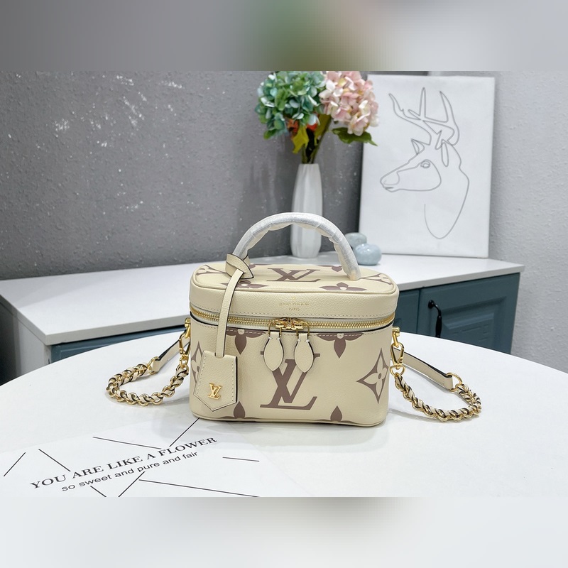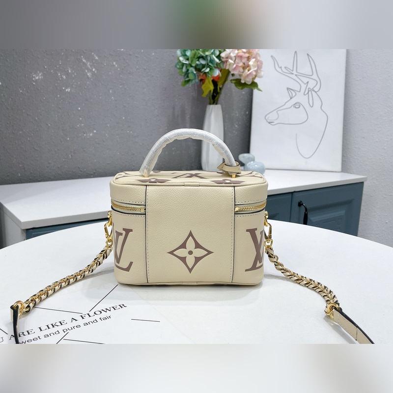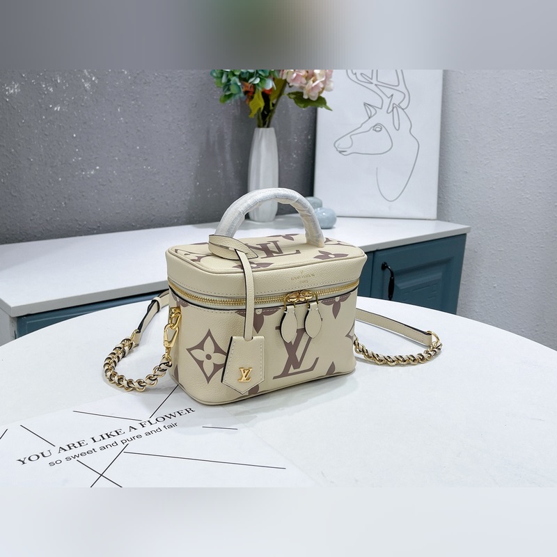 LV 허영심 작은 가방 품목 번호 M45599 미색 허영심 작은 가방 모노그램 니스 배니티 화장품 가방에서 영감을 받은 이 가방은 자이언트 모노그램 패턴이 양각으로 새겨진 모노그램 앙프렝뜨 가죽으로 만들어졌습니다. 가죽 태슬 지퍼 손잡이 우아한 손잡이 탈착식 어깨 스트랩이 세련된 스타일과 실용적인 기능을 결합합니다. 크기: 19 x 13 x 11cm 아이템 번호: RYX96181080