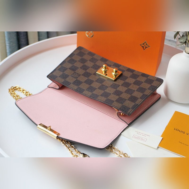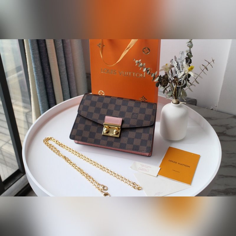 LV 모델 M60357 크루아상 체인백 플뢰르 드 리스 체인 백은 플뢰르 드 리스 특유의 디자인을 크루아젯으로 재해석한 제품입니다. 루이 비통 트렁크에 사용되는 다미에 캔버스 염색 가죽 S-록 소재로 제작되었습니다. 탈착식 체인이 포함되어 있어 어깨에 메거나 손에 들 수 있습니다. 크기: 21.0 x 13.5 x 5.0 cm 항목 번호: LD9618850