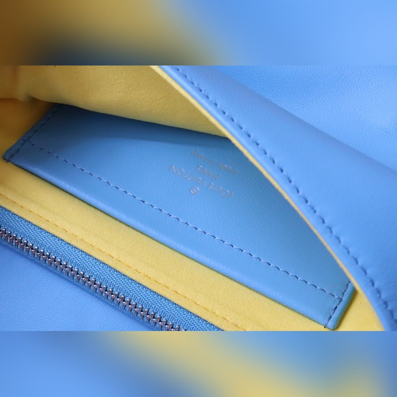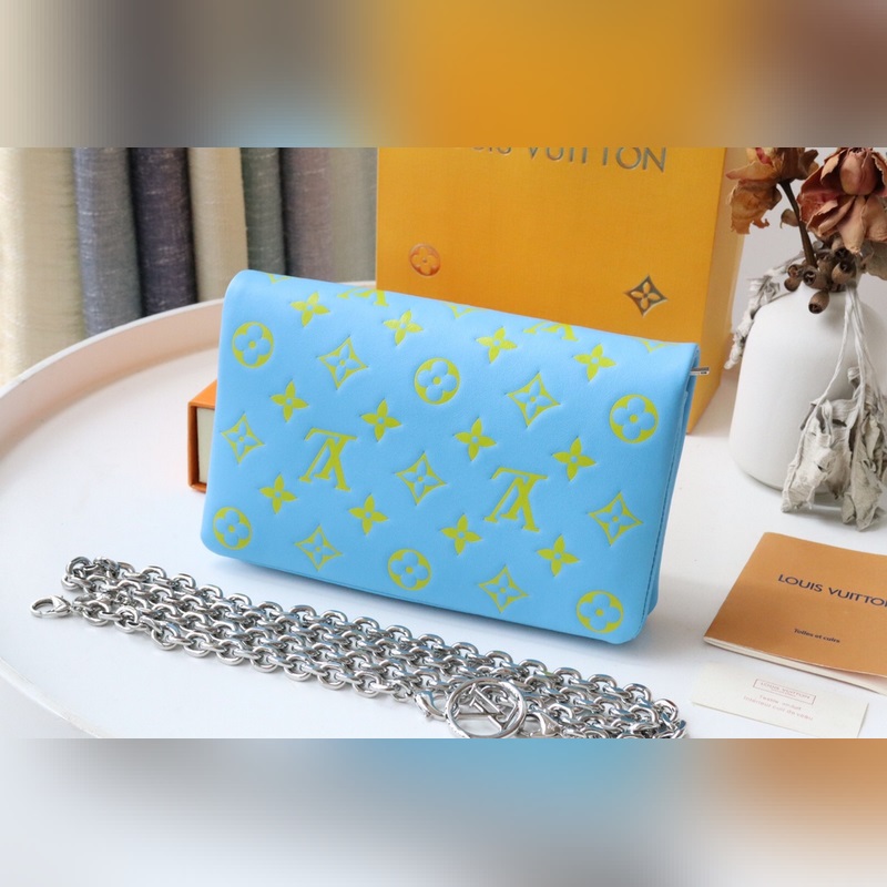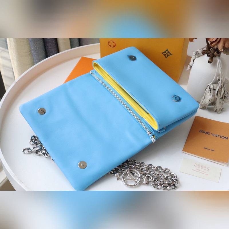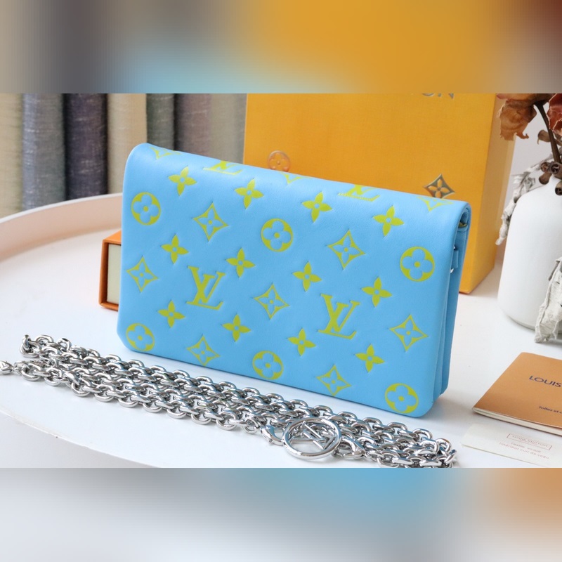 LV 포셰트 쿠쎄 체인 백 모델 번호: M80743 파란색 양가죽에 엠보싱 처리된 모노그램은 베개처럼 폭신한 질감을 구현합니다. 스마트한 모양 덕분에 휴대할 수 있으며 루이 비통의 참으로 장식된 탈착식 체인을 이용해 클러치백이나 허리 가방으로 사용할 수 있습니다. 크기 20.0 x 14.0 x 8.0 cm 아이템 번호: LD9618980