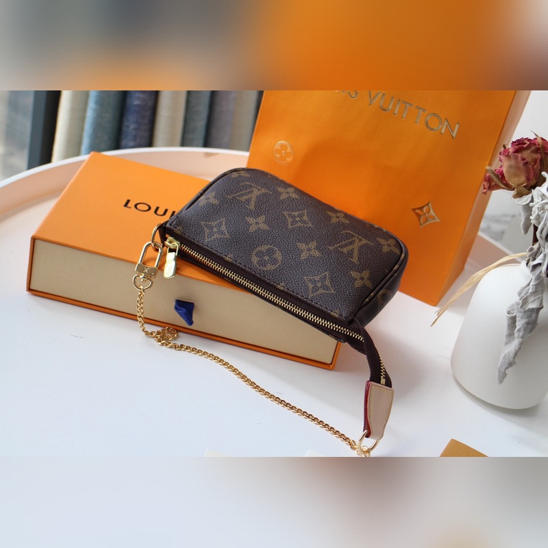 LV 마작 가방 모델 번호: M58009 이 장식용 가방은 지퍼로 여닫을 수 있고 루이비통 핸드백에 있는 D링에 연결할 수 있는 금색 체인이 달려 있습니다. 크기: 15.5 × 10.5 × 4cm 참조: LD9618660