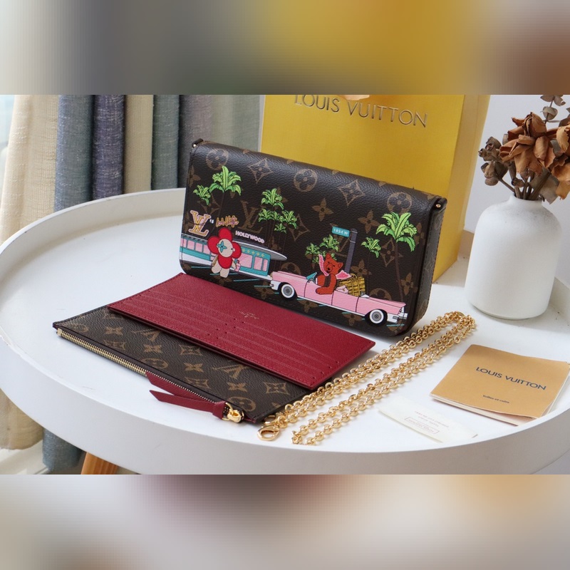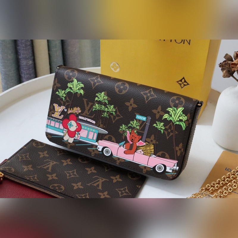 LV 상품 번호: M80859 3피스 세트 이 F?licie Pochette 가방은 모노그램 캔버스로 만들어졌으며 브랜드 마스코트인 비비안과 캘리포니아 베어가 오픈 컨버터블 자동차를 타고 레스토랑과 야자수를 지나며 할리우드 대로에서 여유롭게 드라이브를 즐기는 모습을 세련된 프린트로 표현했습니다. 탈착식 포켓이 기능적인 디자인을 더해 주며 손으로 들거나 어깨에 메거나 몸에 걸칠 수 있습니다. 상세 특징 21 x 12 x 3cm. 아이템 번호: LD9618800