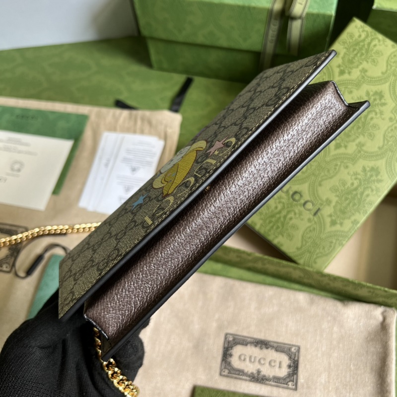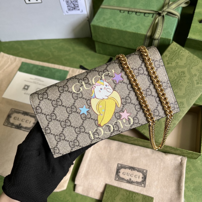오리지널 그린 박스 포장. 무지개와 별이 프린트된 체인 백. 프린트는 Gucci Love March 시리즈 전체에 걸쳐 사용되어 장난기 넘치는 디자인 미학을 강조합니다. 이 활기찬 고양이는 친구들과 함께 하는 다양한 귀여운 장난과 모험으로 유명합니다. 이 GG Supreme 카드 홀더는 무지개와 별 패턴으로 장식된 귀여운 바나나 야옹 프린트를 생생하게 표현합니다. 베이지색과 흑단색 캔버스 무지개와 별 무늬 B 안감은 질감이 있는 천으로 되어 있습니다. 크기: 19(가로) x 10(세로) x 4cm. 색상: 갈색/바나나 무늬가 있는 PVC. 품번: XP9618800