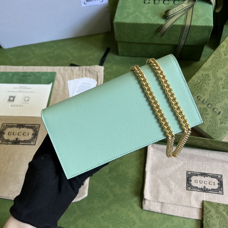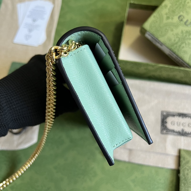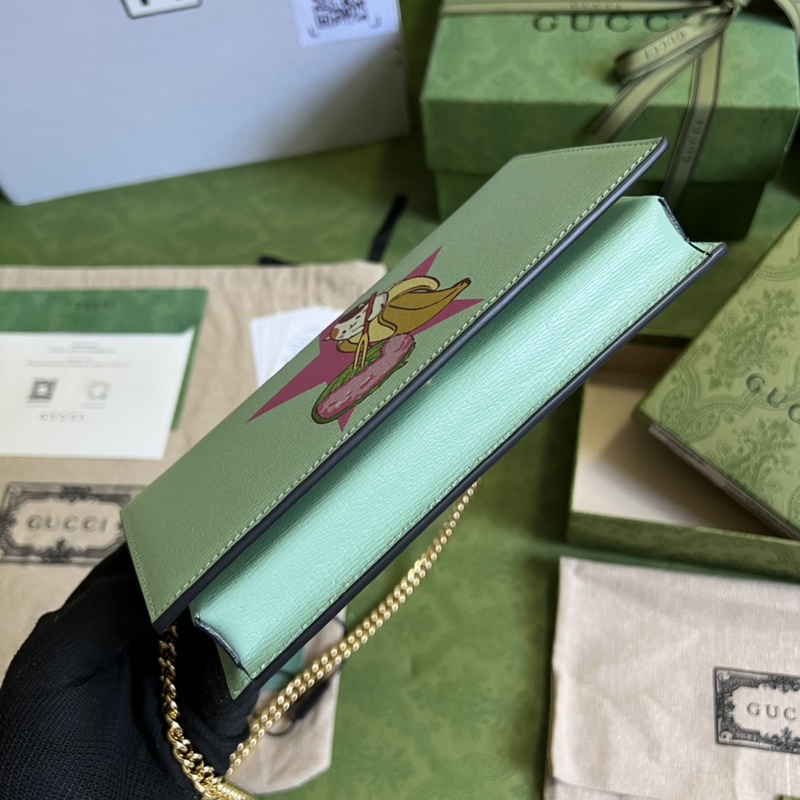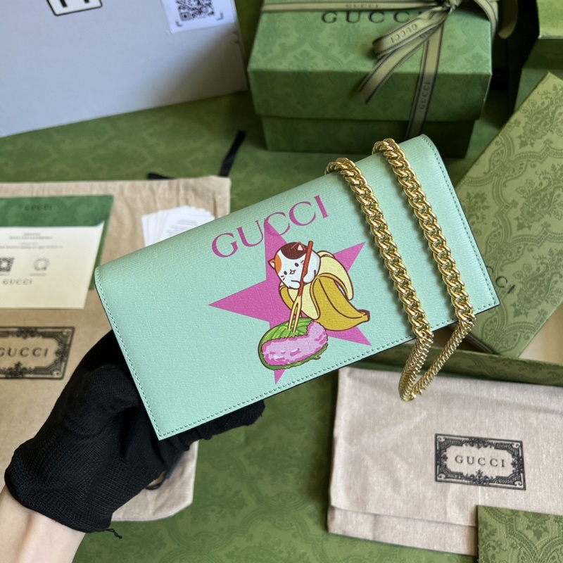 오리지널 그린 박스 포장. 무지개와 별 무늬 체인 백. 프린트는 Gucc