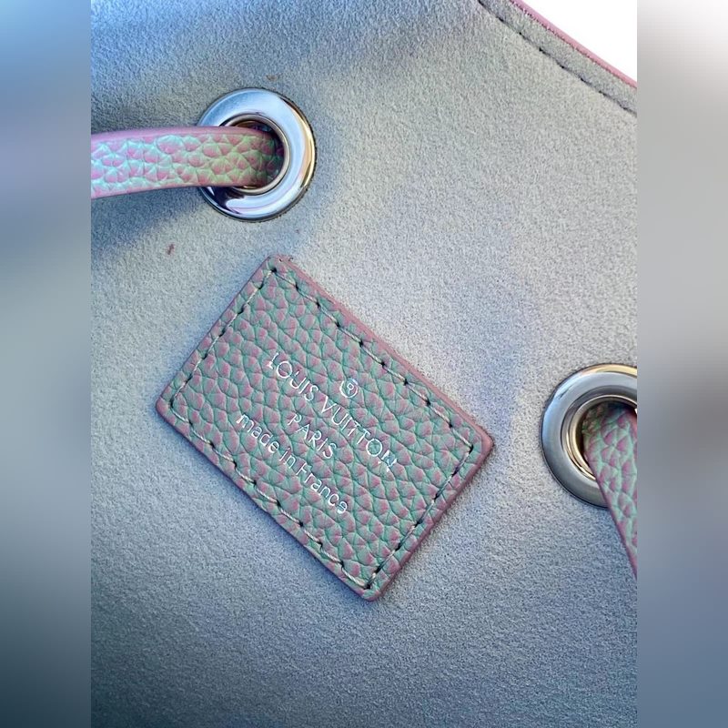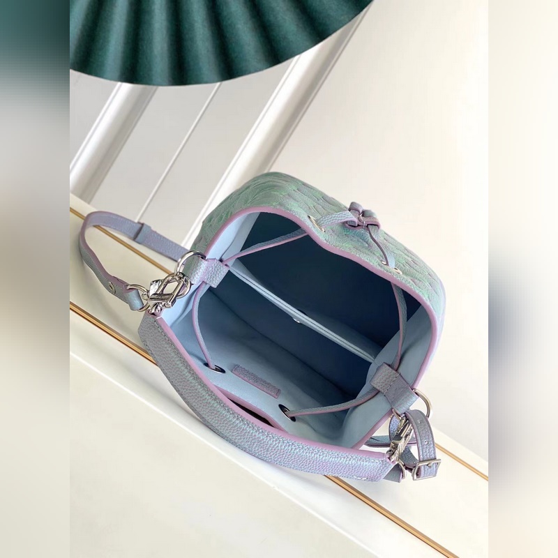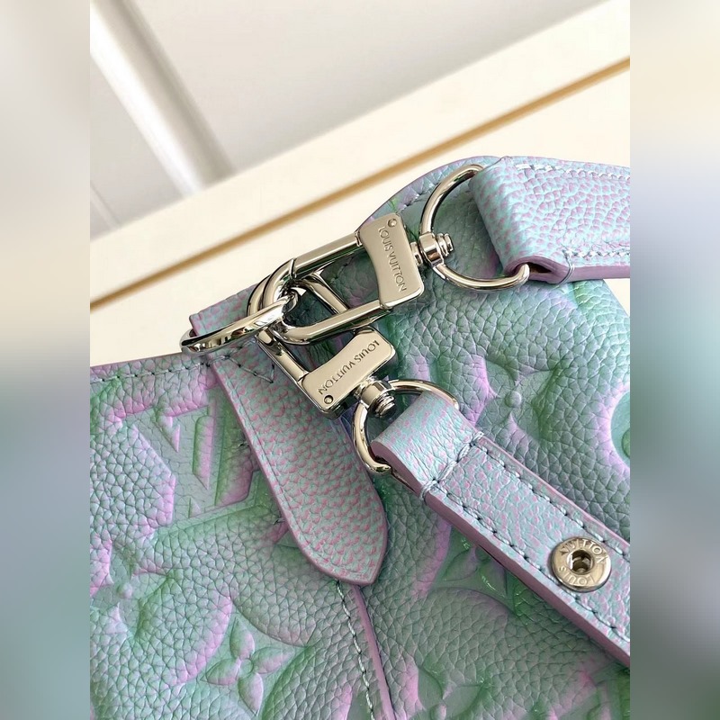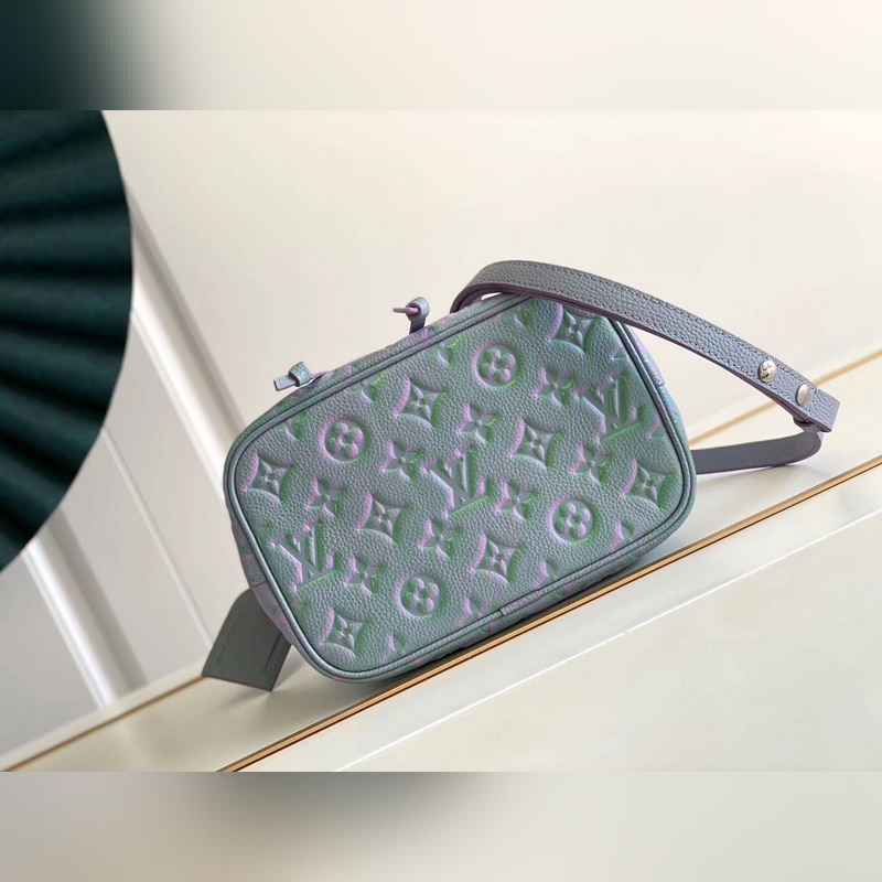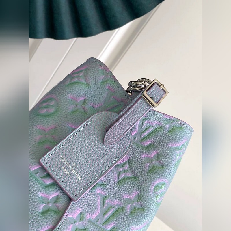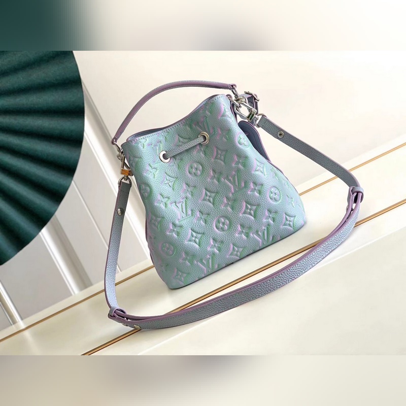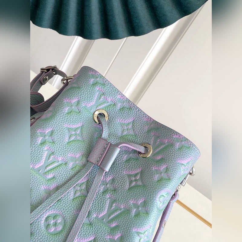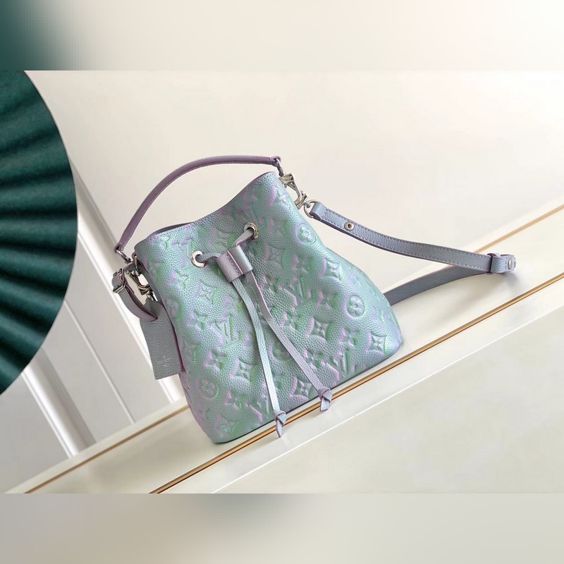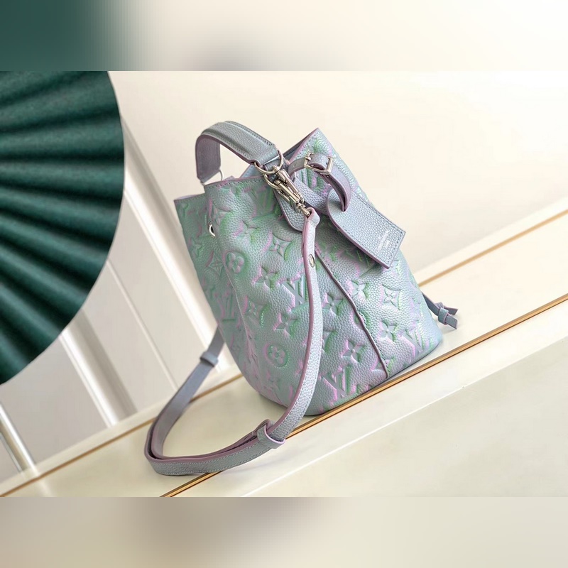 LV 모델 M46269 M45709 네오노에 BB 버킷백 모노그램 앙프렝뜨 가죽으로 제작되었으며 3단계 스프레이 기법으로 마감 처리되어 서머 스타더스트 컬렉션의 컬러 스토리를 전달하는 광택 있는 무지갯빛 효과를 연출합니다. 끈으로 묶는 방식의 잠금 장치와 스냅 버튼이 달린 내부 포켓이 기능성을 더해 주며 탈착식 손잡이와 어깨끈을 활용하여 다양한 방법으로 휴대할 수 있습니다. 크기: 20 x 20 x 13cm(길이 x 높이 x 너비)