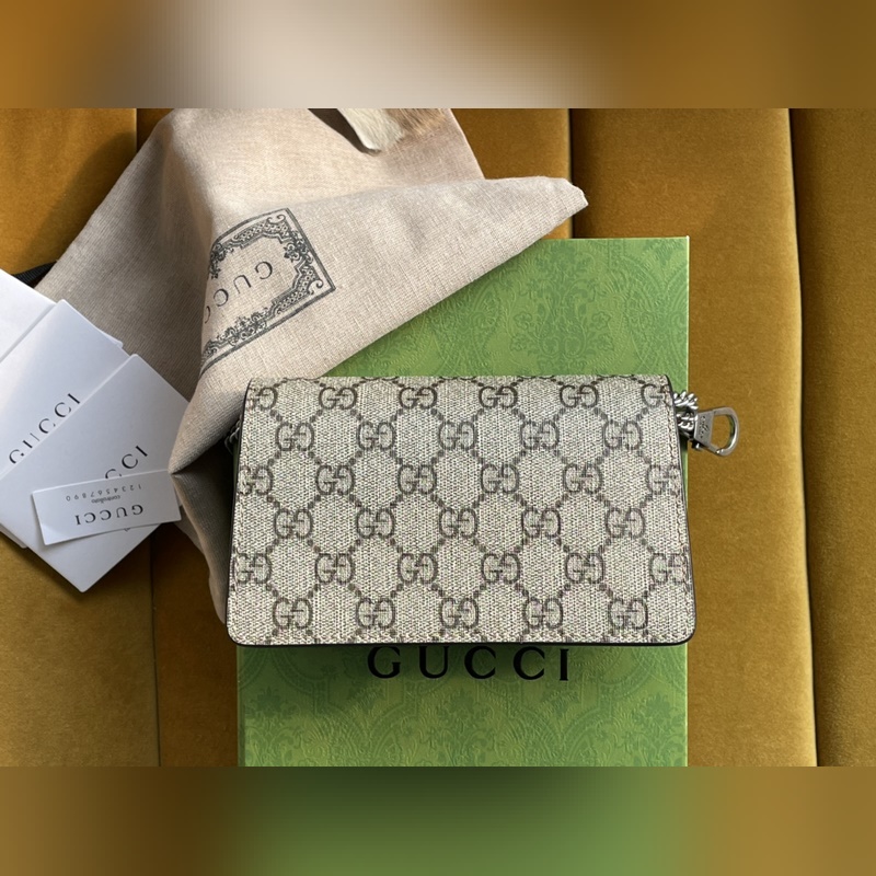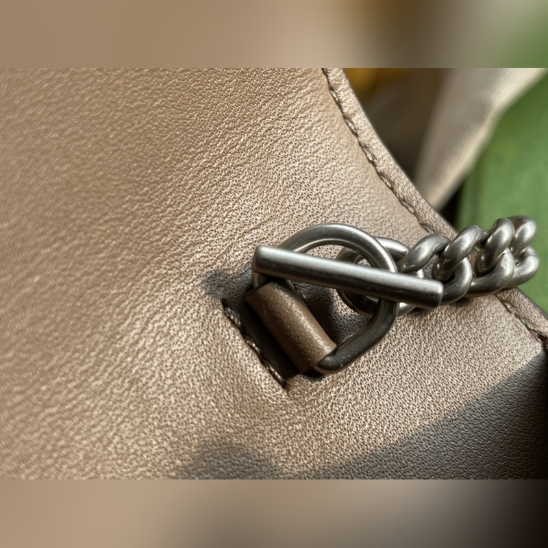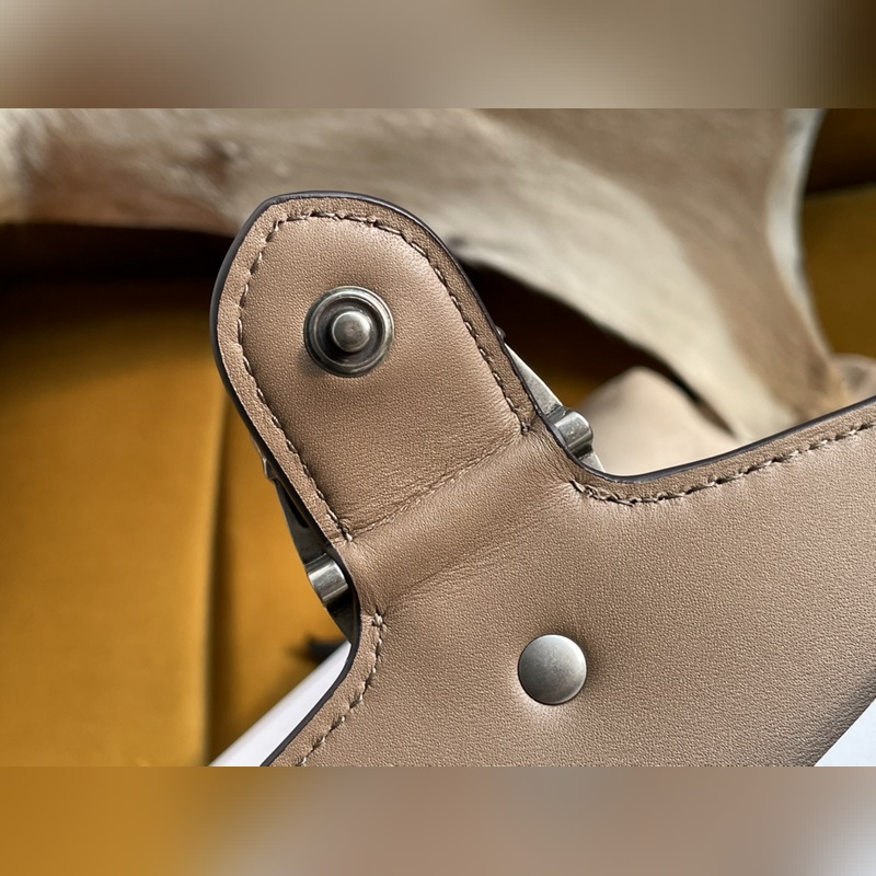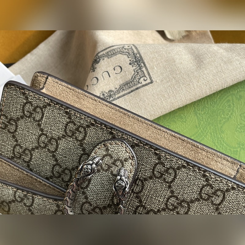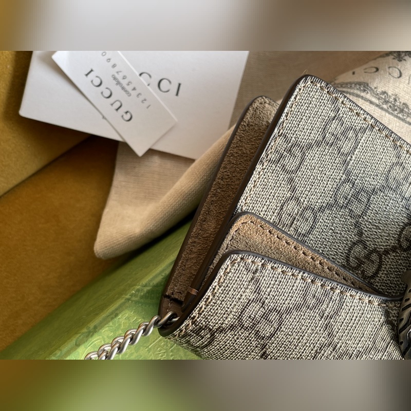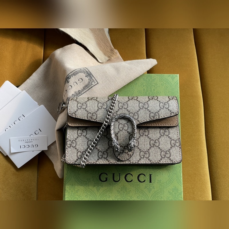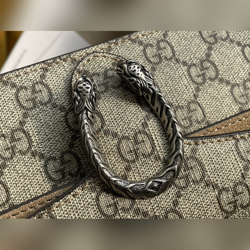 아이템 번호: 476432 디오니소스 가방은 이탈리아산 코팅 캔버스에 라이트 카멜 스웨이드 소재로 만들어졌으며 빈티지 실버 메탈 호랑이 머리 버클 장식 반 수제 고급 슬라이딩 체인 스트랩 크기: 16.5*10*4.5cm [원 포장 상태] 아이템 번호: XZM9618850