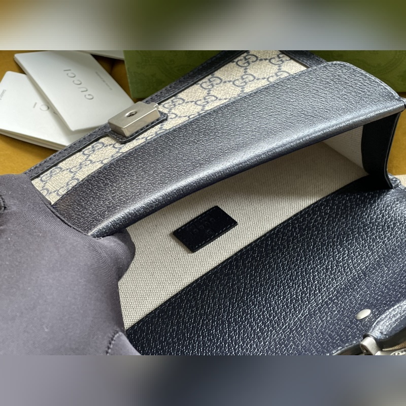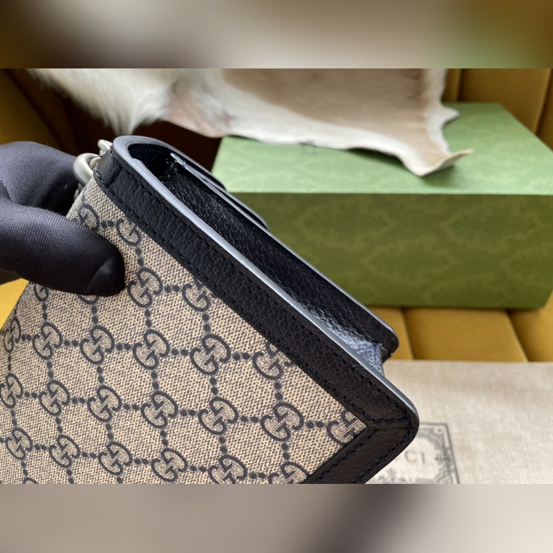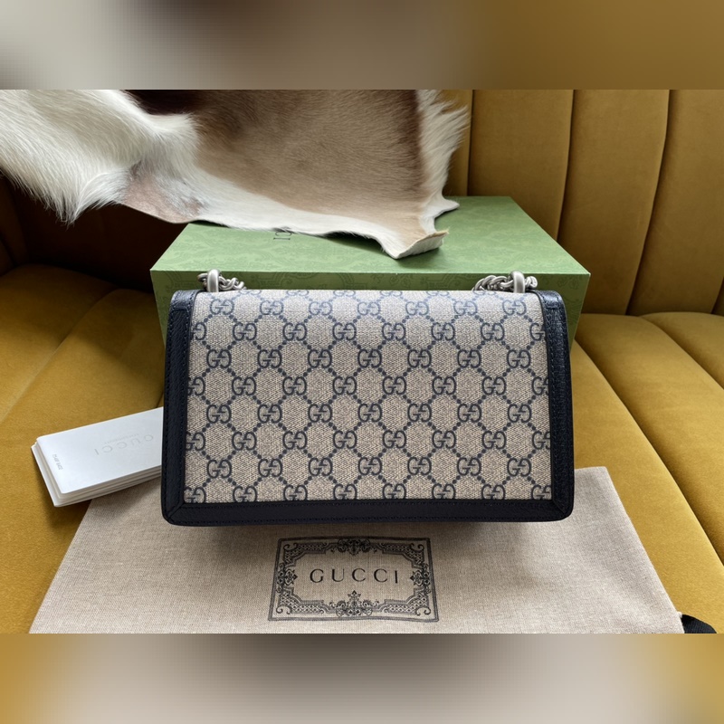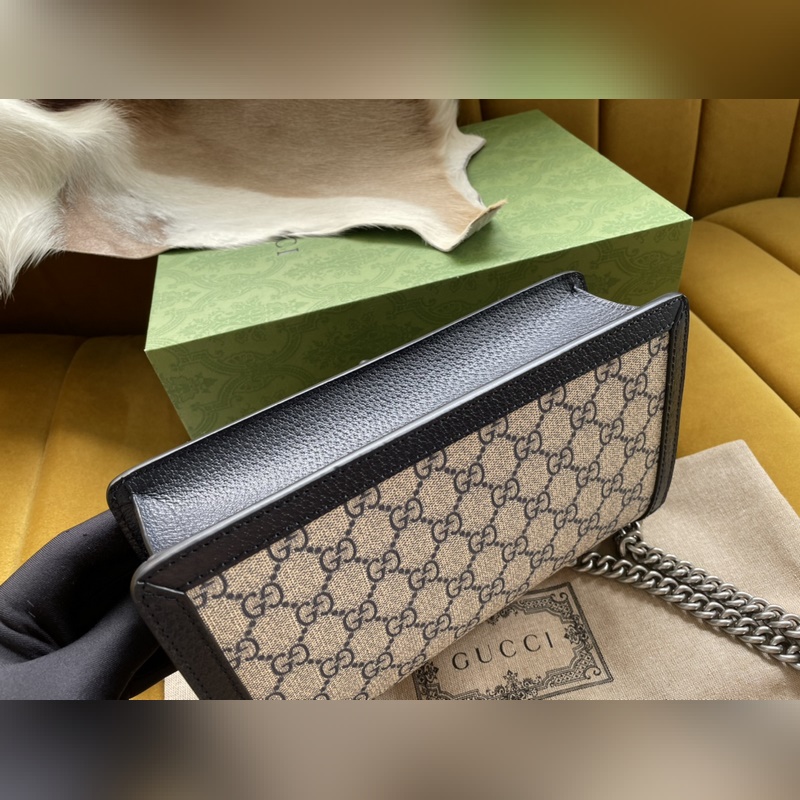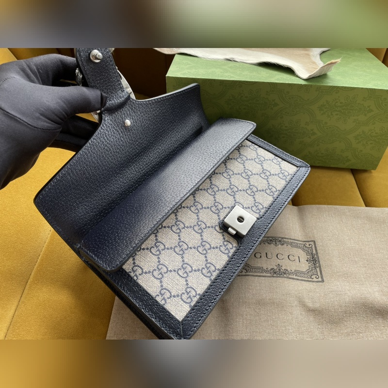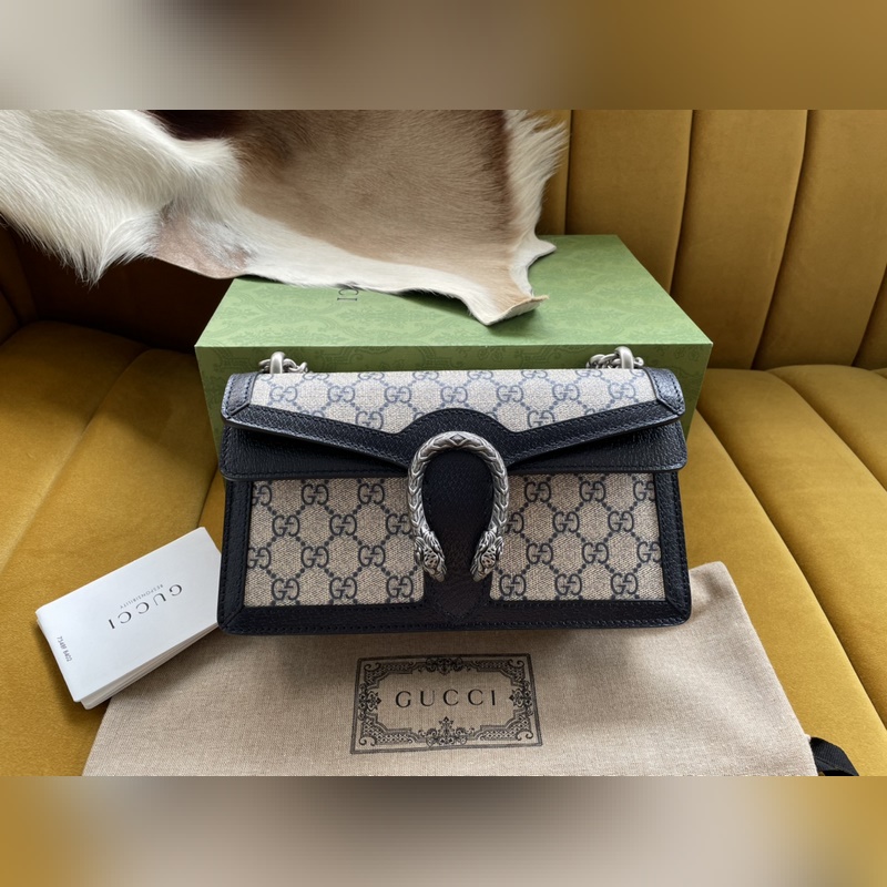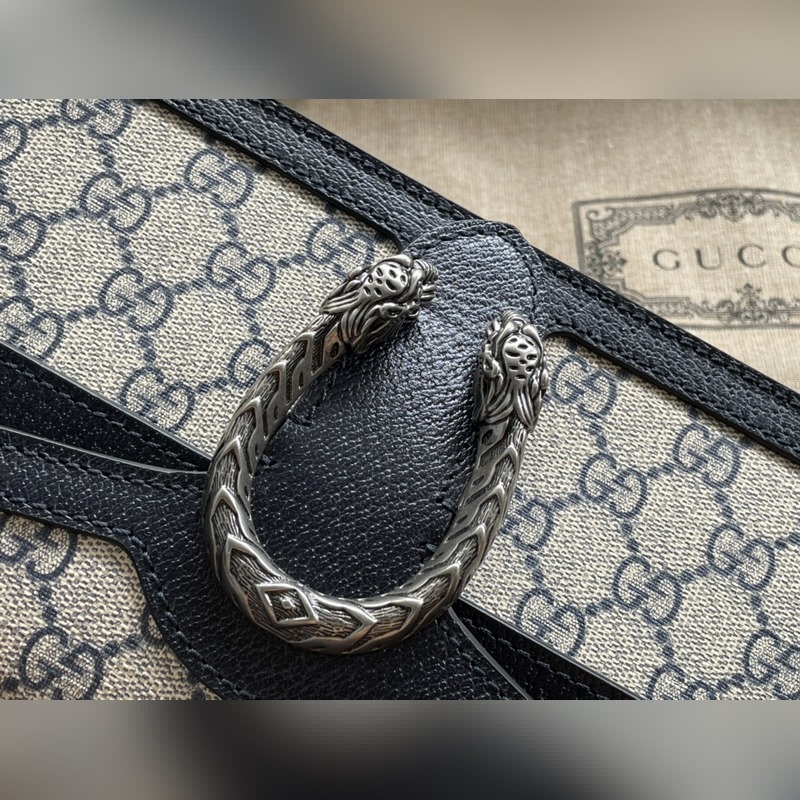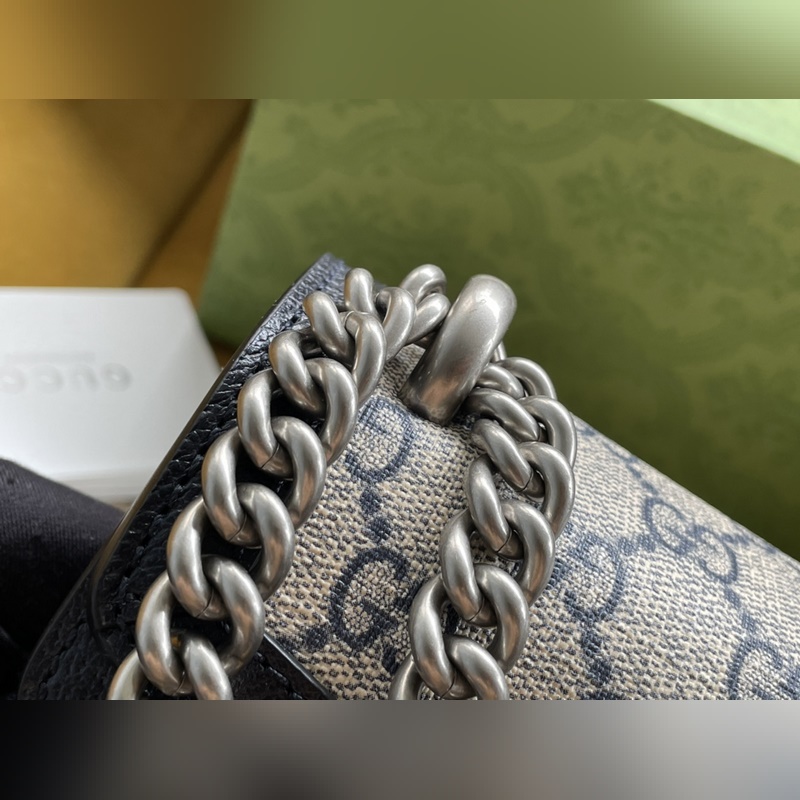 아이템 번호 499623 GG 패턴의 타이거 헤드 스퍼가 시리즈의 작은 숄더백에 화려함을 더해줍니다. 슬라이딩 체인 백은 다양한 방법으로 착용할 수 있으며 숄더백과 핸드백으로 자유롭게 전환할 수 있습니다. GG 프리미엄 인조 가죽 안감의 스웨이드 안감 포켓. 크기: 25/13.5/7cm [원 포장 상태] 아이템 번호: XZM96181050