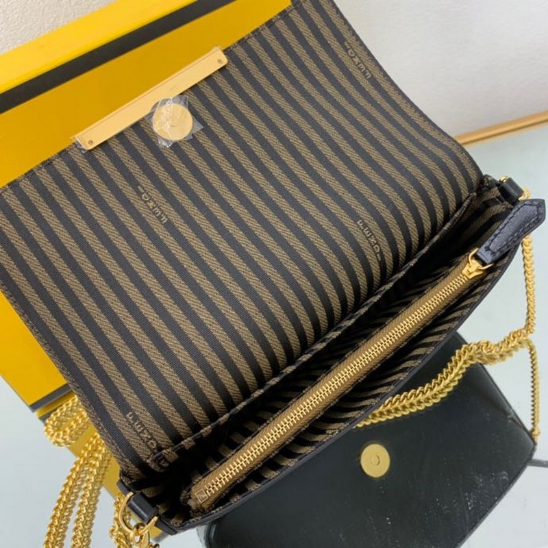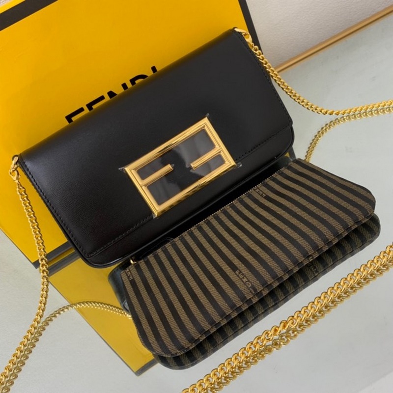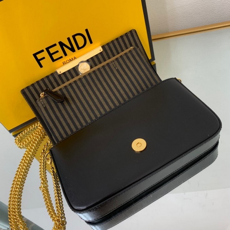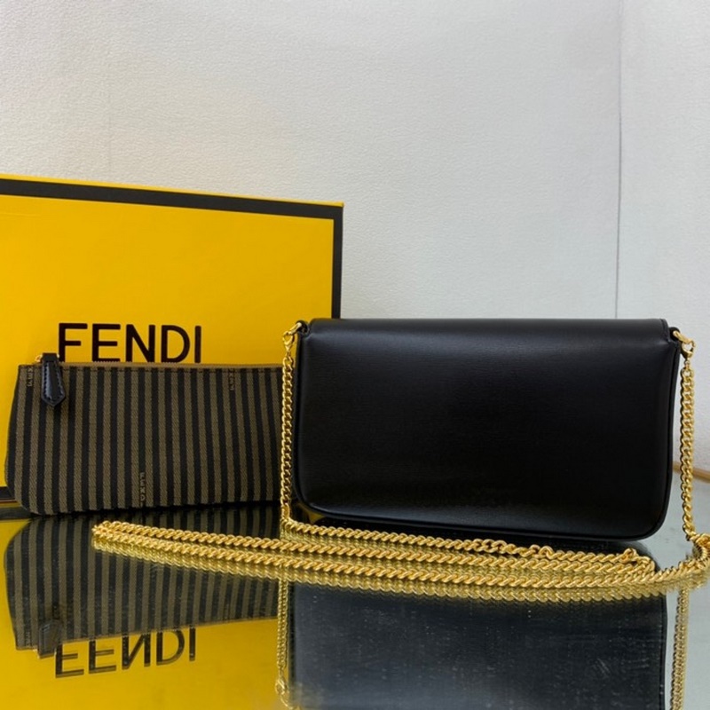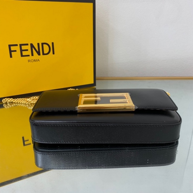 펜디 검은색 가죽 소재의 기하학적인 미니 가방 금속 FF 장식 플랩과 스냅 버튼 잠금 장치 패브릭 뒷면과 탈착식 지퍼가 달린 평평한 포켓 패브릭 내부 포켓 탈착식 체인이 달린 금색 마감 금속 부속품 어깨 끈은 손으로 들거나 어깨에 메고 다닐 수 있습니다. 크기: 21.5*3*13cm 품번: BD96181060