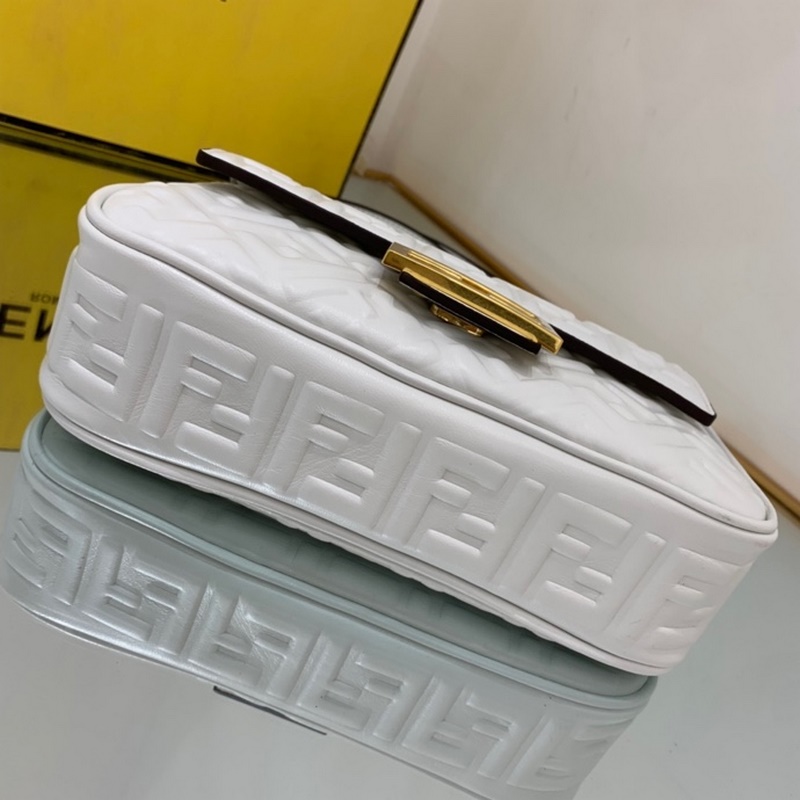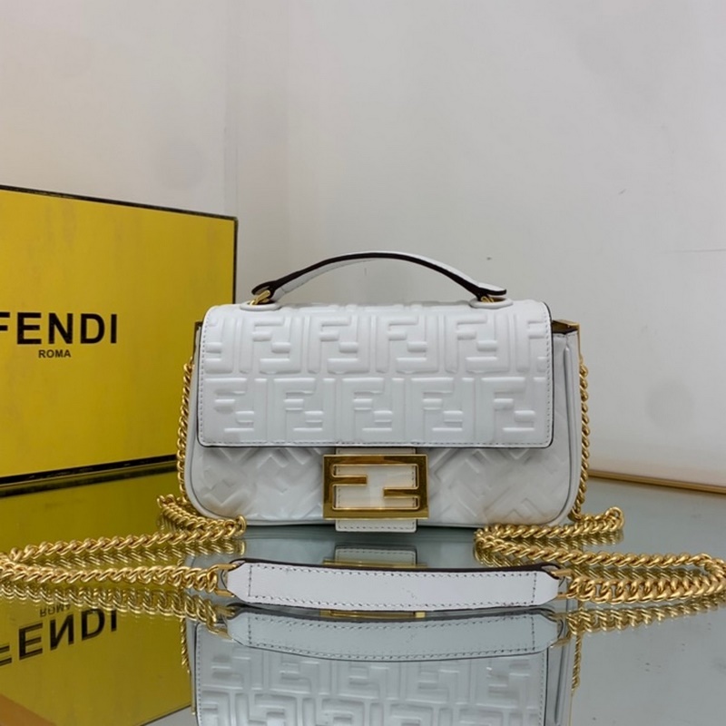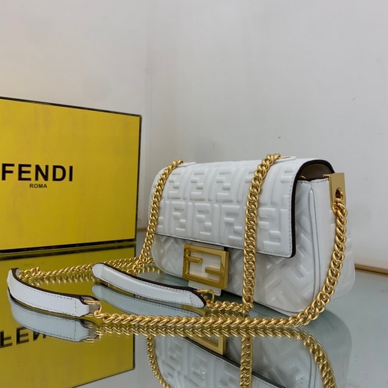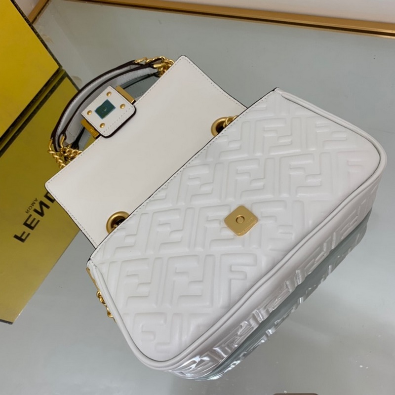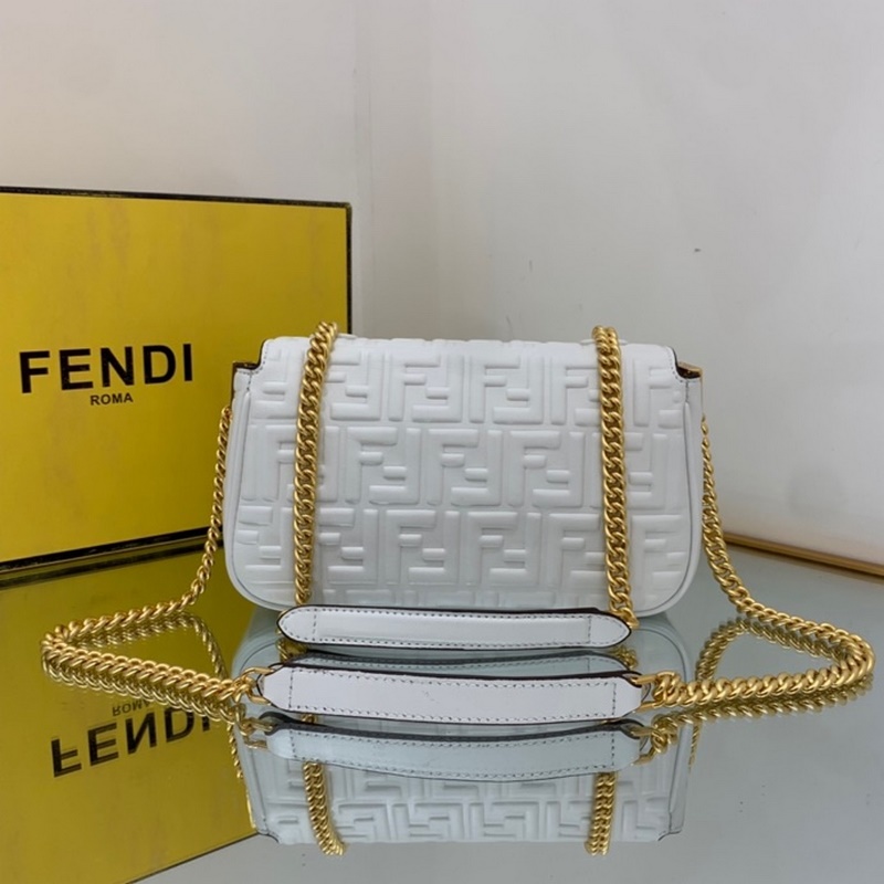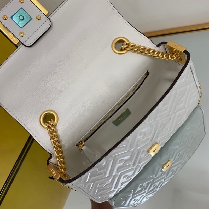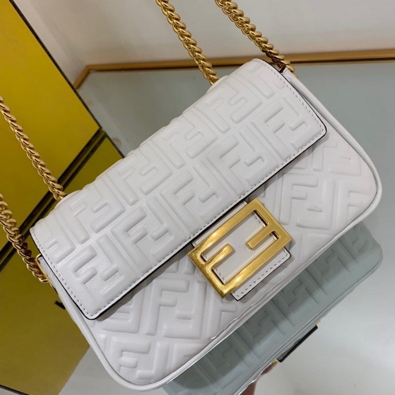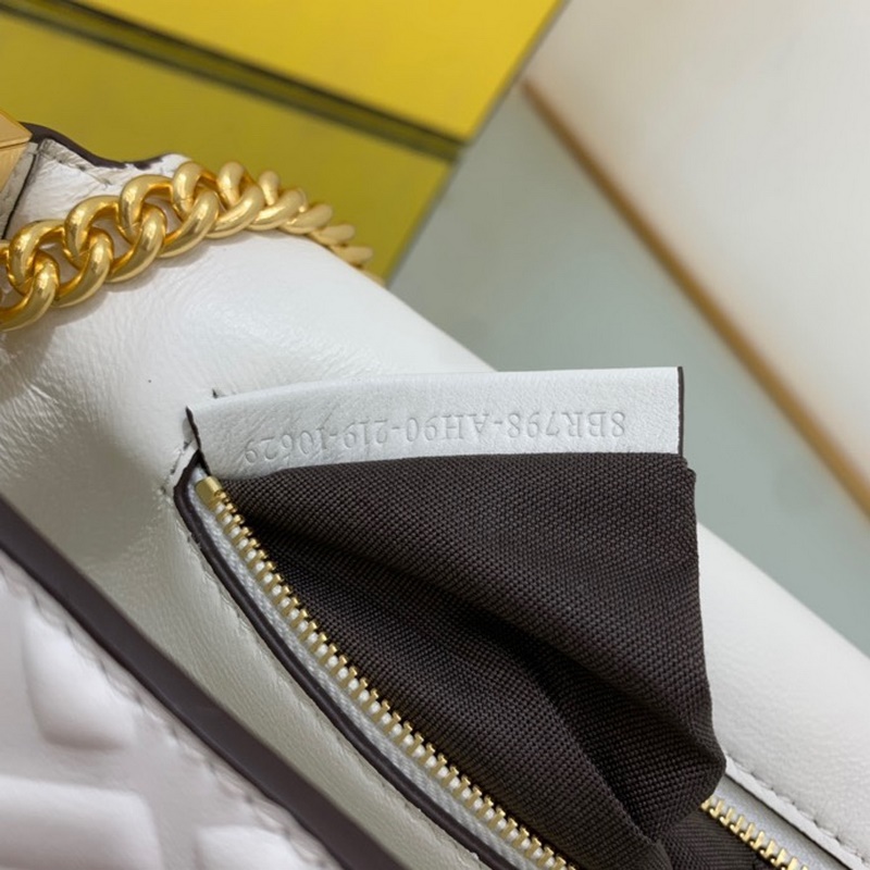 펜디 화이트 나파 가죽 소재의 미디엄 체인 백 흰색 나파 가죽 소재의 3D FF 패턴 FF 버클 앞쪽에 플랩 자석 잠금장치 안감 처리된 내부 지퍼 포켓 빈티지 골드색 금속 부속품 손으로 들거나 어깨에 메는 슬라이딩 체인 숄더 스트랩 크기 24*7*14.5cm ☆No. 6356 번호: BD96181380