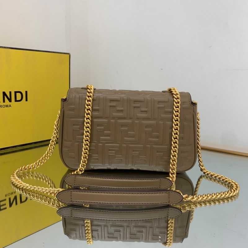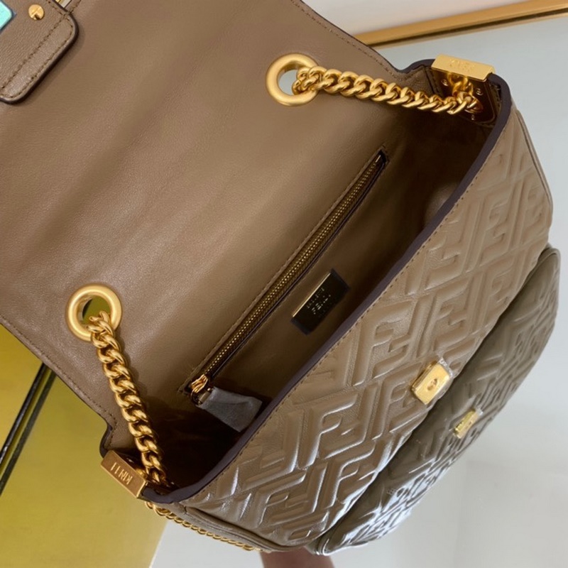펜디 중간 체인 백 살구색 나파 소프트 레더 나파 가죽 소재의 3D FF 패턴 FF 버클 앞면에 플랩 여밈 내부 안감 지퍼 포켓 빈티지 골드 컬러 금속 장식 손으로 들거나 어깨에 메는 슬라이딩 체인 숄더 스트랩 크기 24*7*14.5cm ☆No. 6356 번호: BD96181380