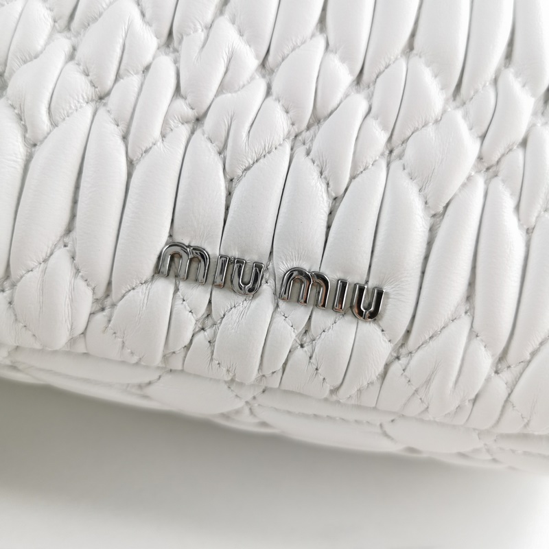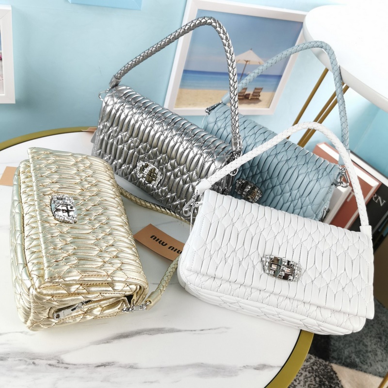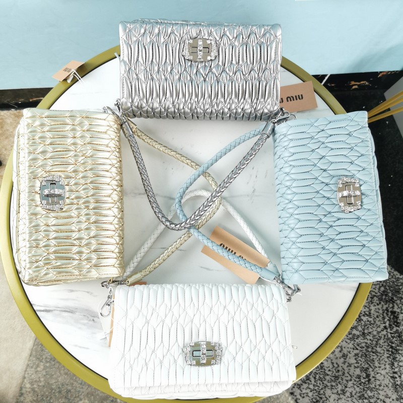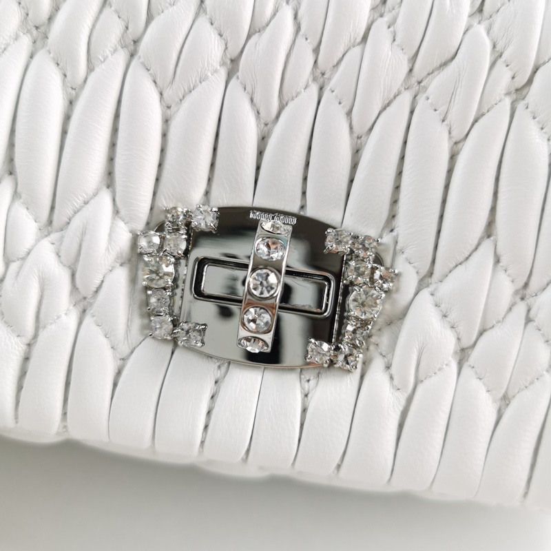Miumiu 화이트 모델 번호: 5BH012 크리스탈 장식 체인 스트랩이 달린 업그레이드 버전 최고급 수입 양가죽으로 만든 클래식한 자카드 디자인 직조 가죽 손잡이 탈부착 가능한 크리스탈 장식 체인 스트랩. 부드럽고 섬세한 가죽 마감의 내부 3단 수납공간. 다이아몬드 모양의 회전식 잠금장치로 열고 닫을 수 있습니다. 뒷면에 클래식한 미우미우 로고가 있습니다. 손으로 들거나 어깨에 메거나 크로스 바디로 메는 등 다양한 패션 캐리 스타일을 연출할 수 있습니다. 크기: L21 H12 W5 (포장 포함) 번호: SD96181280
