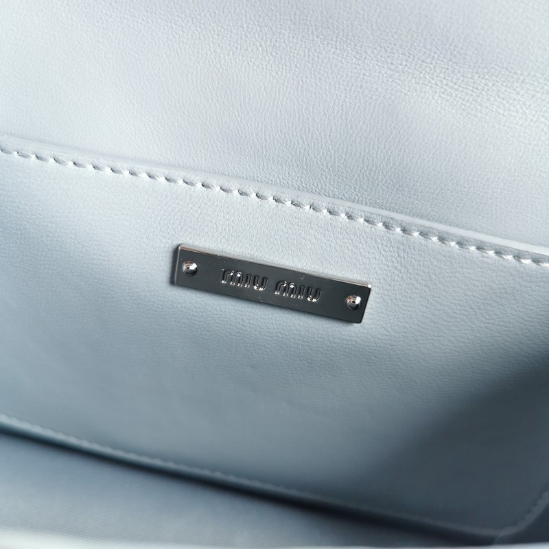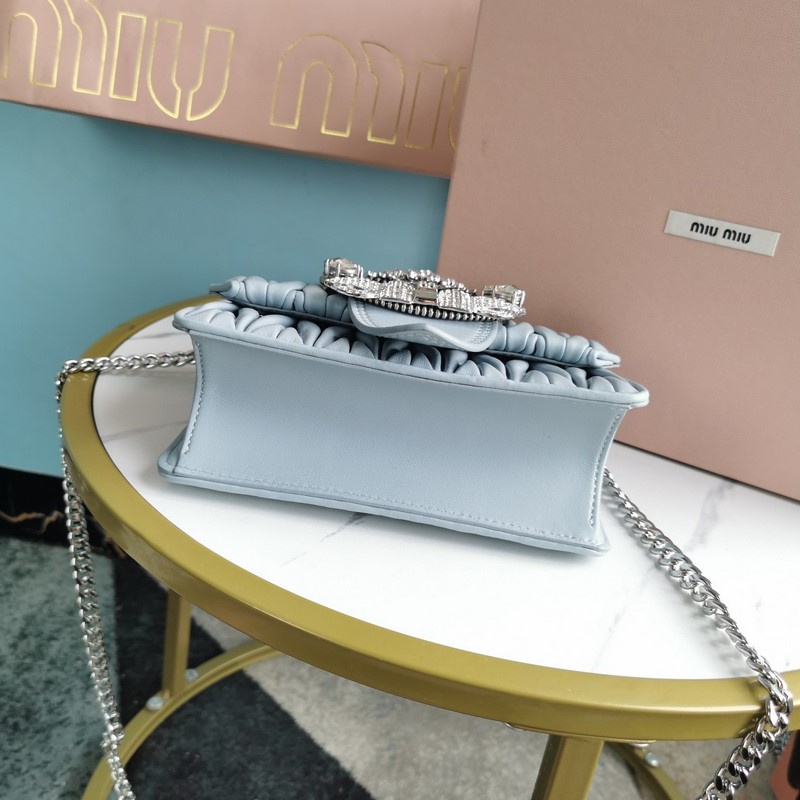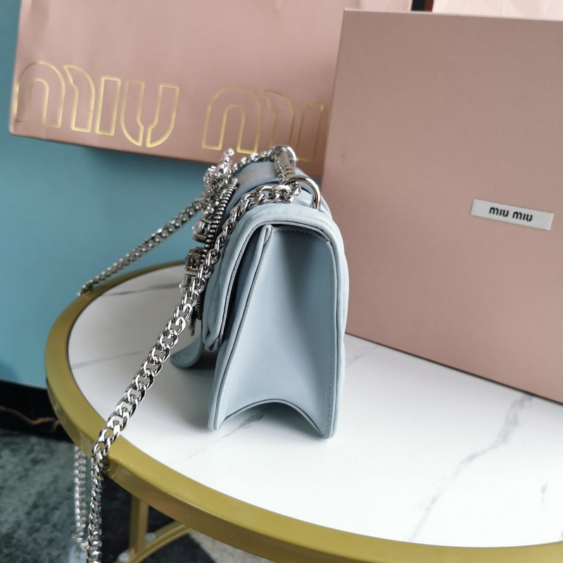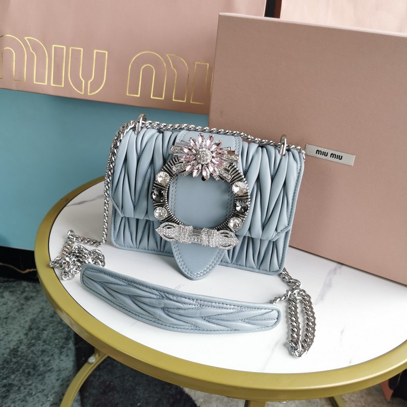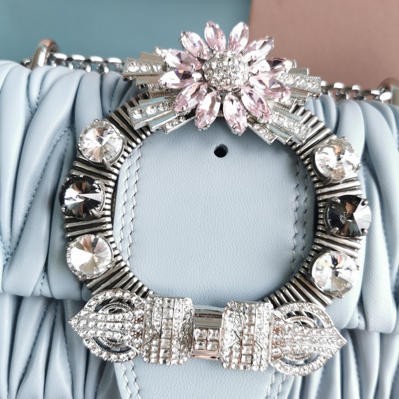 Miumiu 체인백 미스티 블루 모델 번호: 5BD084 최고급 수입 양가죽 수작업으로 세팅한 모조 크리스탈 대형 다이아몬드 버클 115cm 길이의 양가죽과 금속 소재의 긴 어깨 스트랩 플랩 자석 버튼 잠금장치 새틴 안감 크기: 20 5*5*12cm(포장 포함) 번호: SD96181430