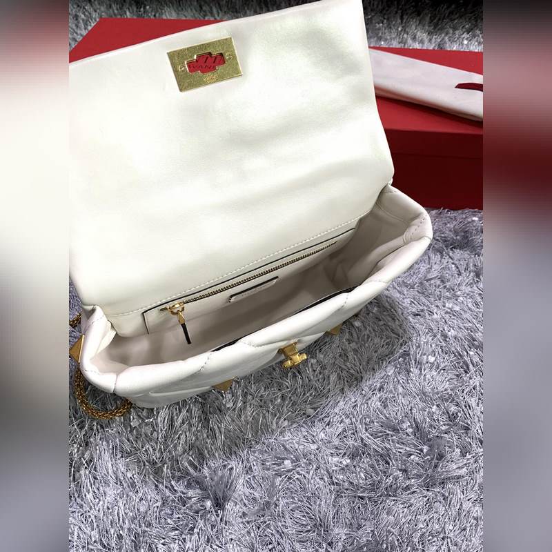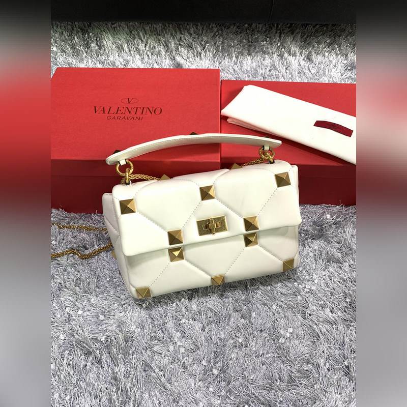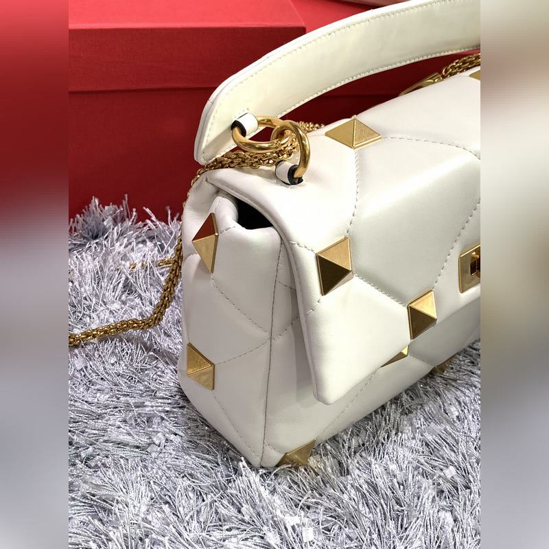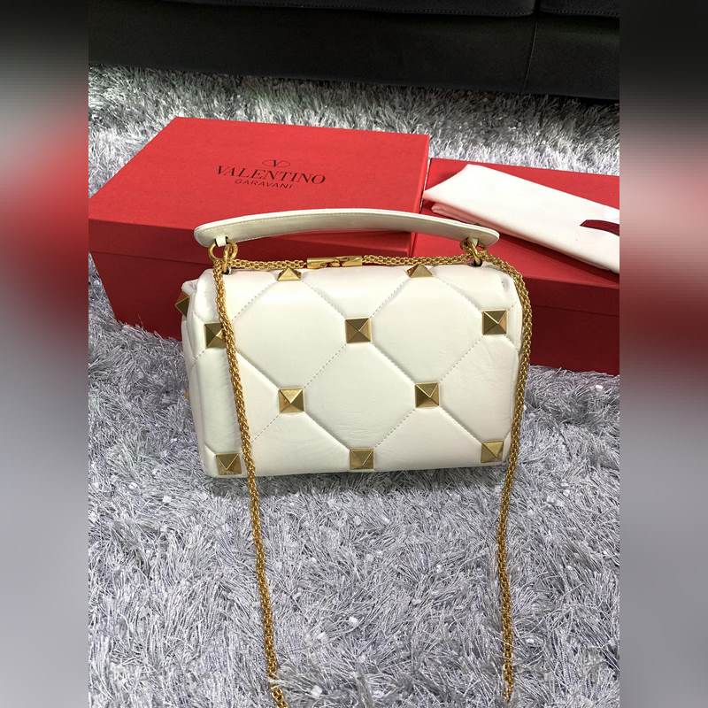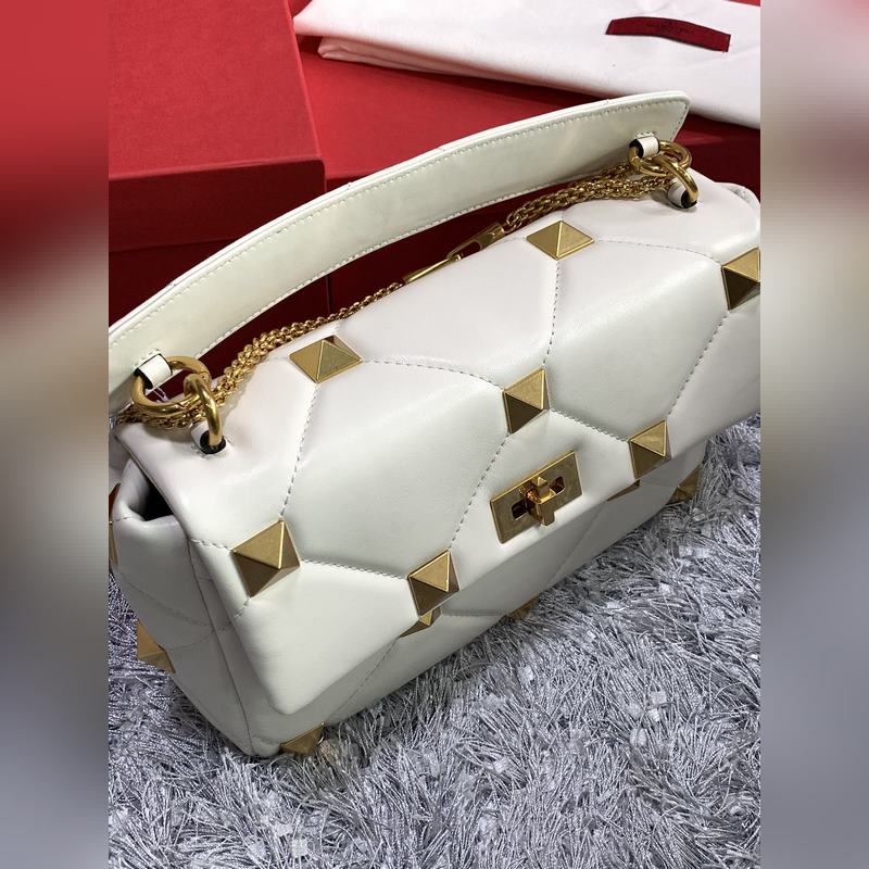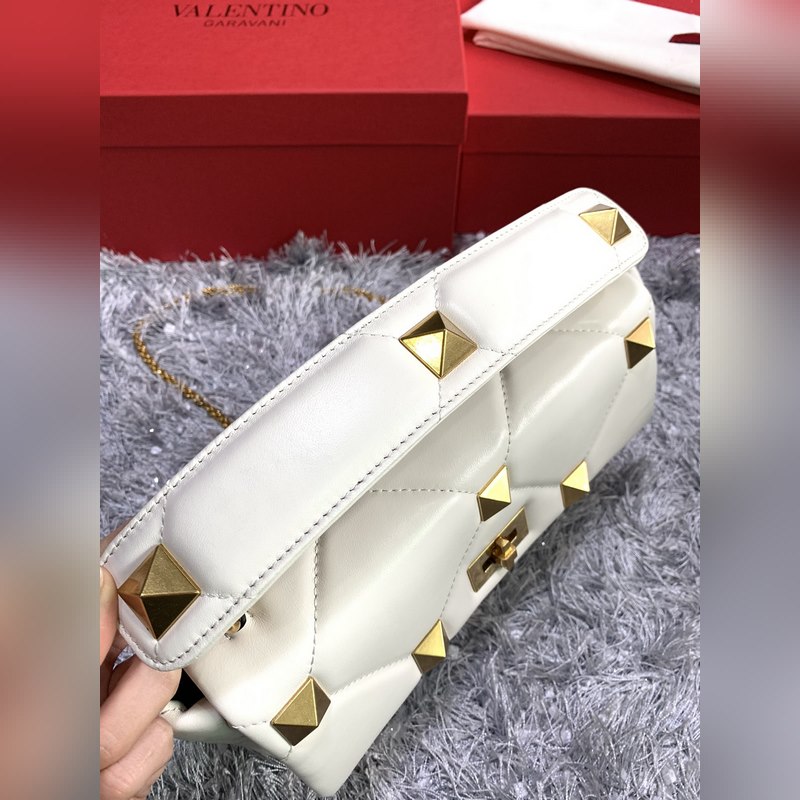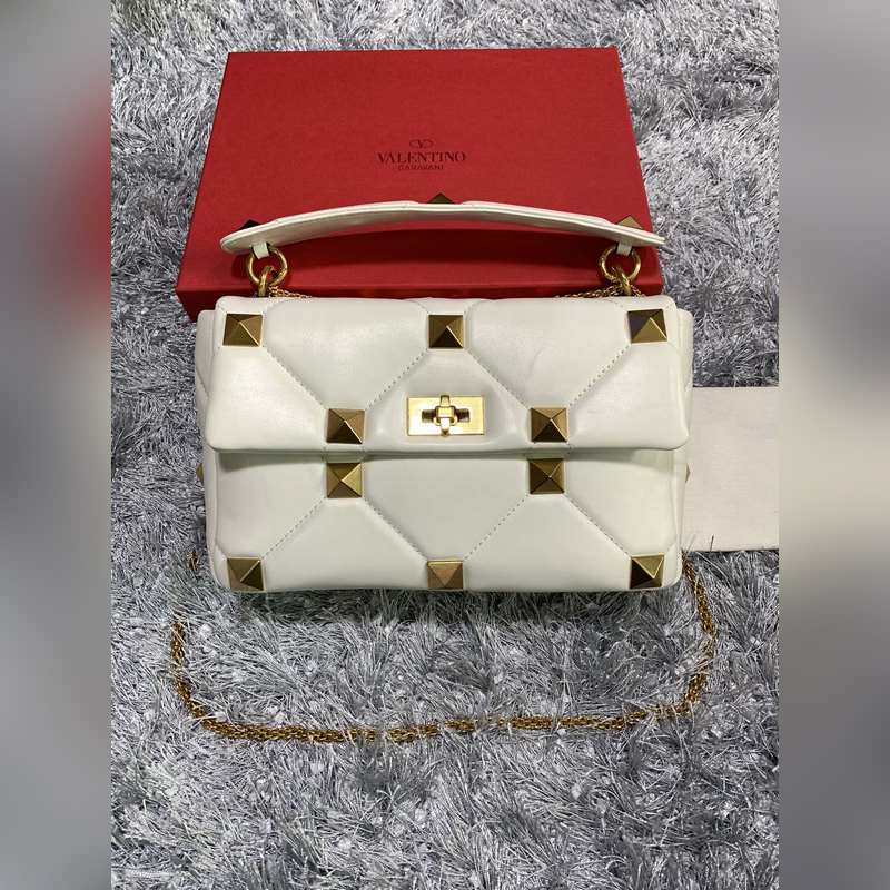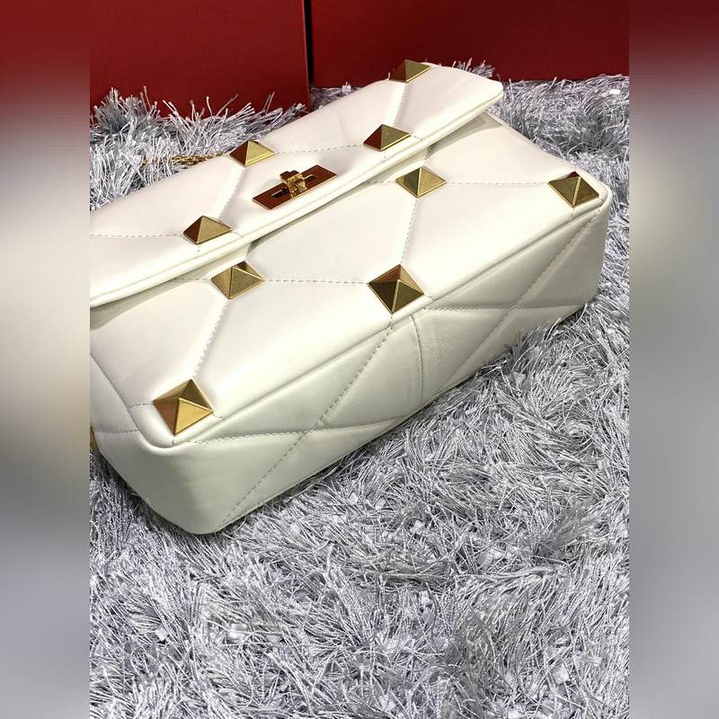 발렌티노 체인 달린 나파 가죽 소재의 큰 스터드 백 대형 스터드가 있는 퀼트 구조 탈착식 손잡이 슬라이딩 체인 트림 크로스 바디 / 어깨에 메거나 손으로 들 수 있습니다. 톤온톤 스티칭으로 프리즘 패턴을 강조한 탑스티치 나파 가죽 - 빈티지 브라스 효과 금속 리벳과 피팅 - 트위스트 락 잠금 - 나파 가죽 내부: 지퍼식 포켓 - 크기: 가로 30 x 세로 20 x 깊이 12cm - 모델 번호: 2060L 상품 번호: SX86181120