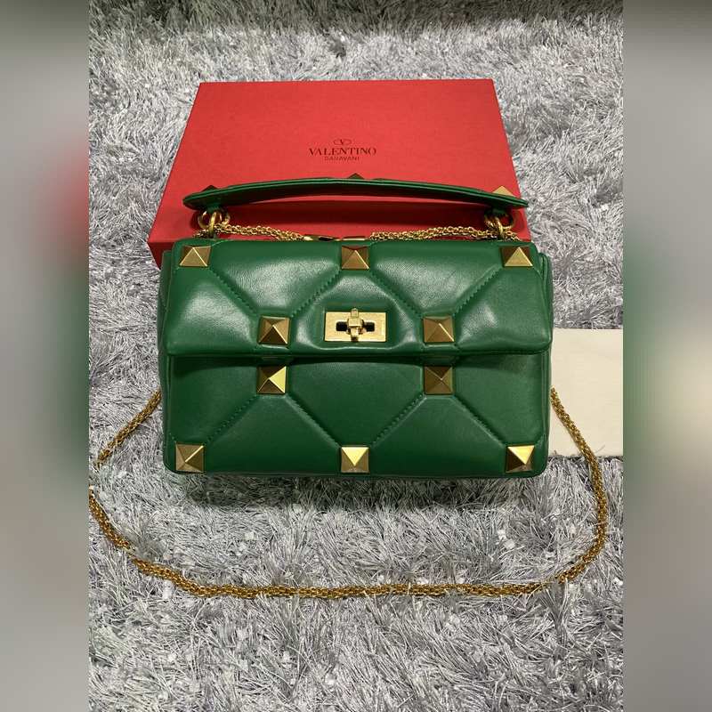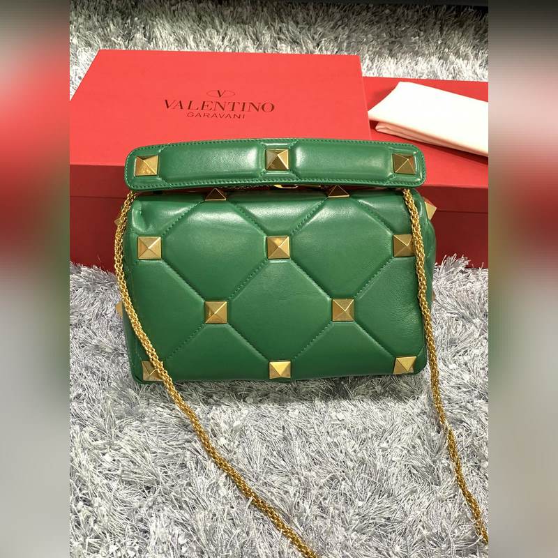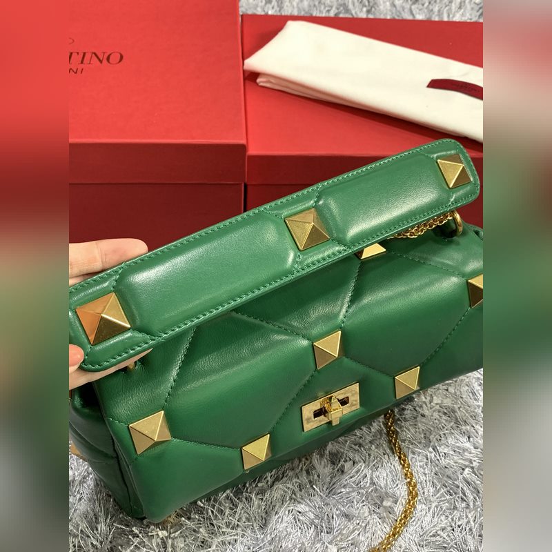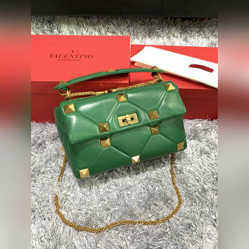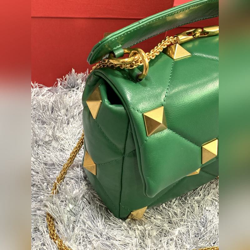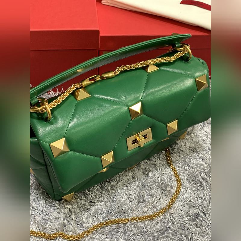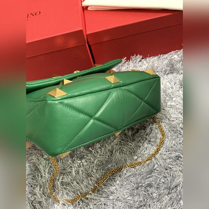 발렌티노 체인 달린 나파 가죽 소재의 큰 스터드 백 대형 스터드가 있는 퀼트 구조 탈착식 손잡이 슬라이딩 체인 트림 크로스 바디 / 어깨에 메거나 손으로 들 수 있습니다. 톤온톤 스티칭으로 프리즘 패턴을 강조한 탑스티치 나파 가죽 - 빈티지 브라스 효과 금속 리벳과 피팅 - 트위스트 락 잠금 - 나파 가죽 내부: 지퍼형 포켓 - 크기: 가로 30 x 세로 20 x 높이 12cm - 모델 번호: 2060L 아이템 번호: SX86181070