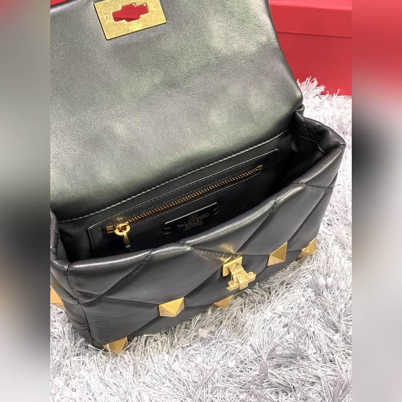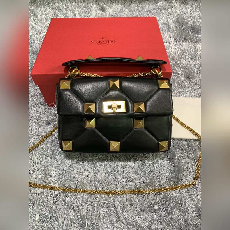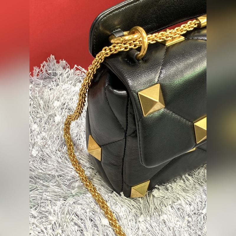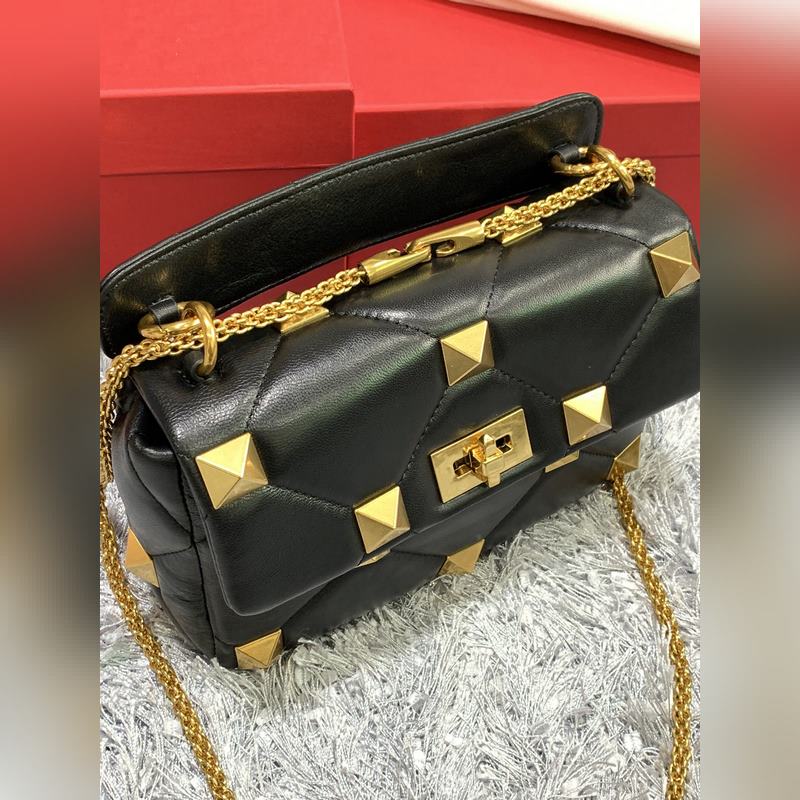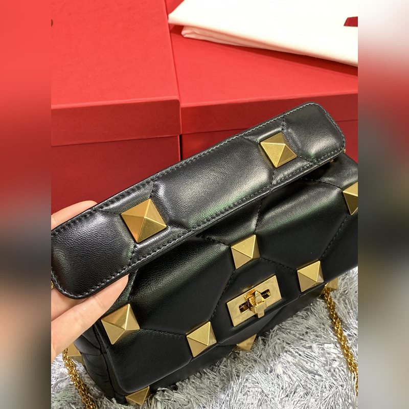 발렌티노 스몰 큰 스터드가 달린 작은 나파 가죽 체인 백 대형 스터드가 있는 퀼트 구조 탈착식 손잡이 슬라이딩 체인 트림 크로스 바디 / 어깨에 메거나 손으로 들 수 있습니다. 톤온톤 스티칭으로 프리즘 패턴을 강조한 탑스티치 나파 가죽 - 빈티지 브라스 효과 금속 리벳과 피팅 - 트위스트 락 잠금 - 나파 가죽 내부: 지퍼식 포켓 - 크기: 가로 25 x 세로 16 x 깊이 10cm - 모델 번호: 2060S 아이템 번호: SX86181060