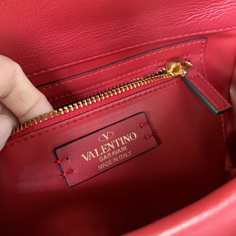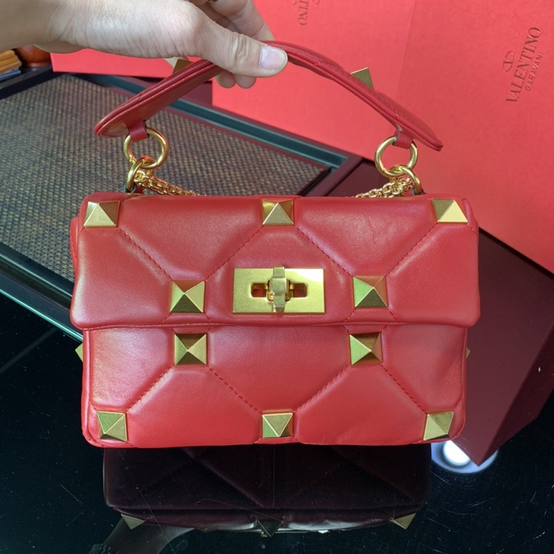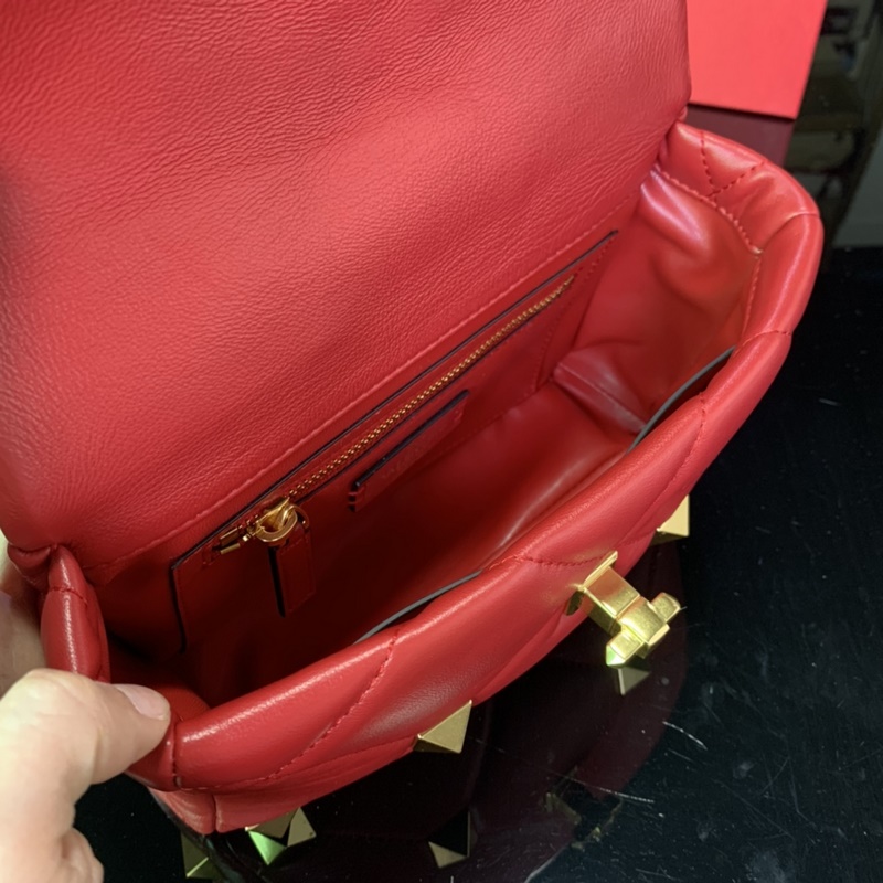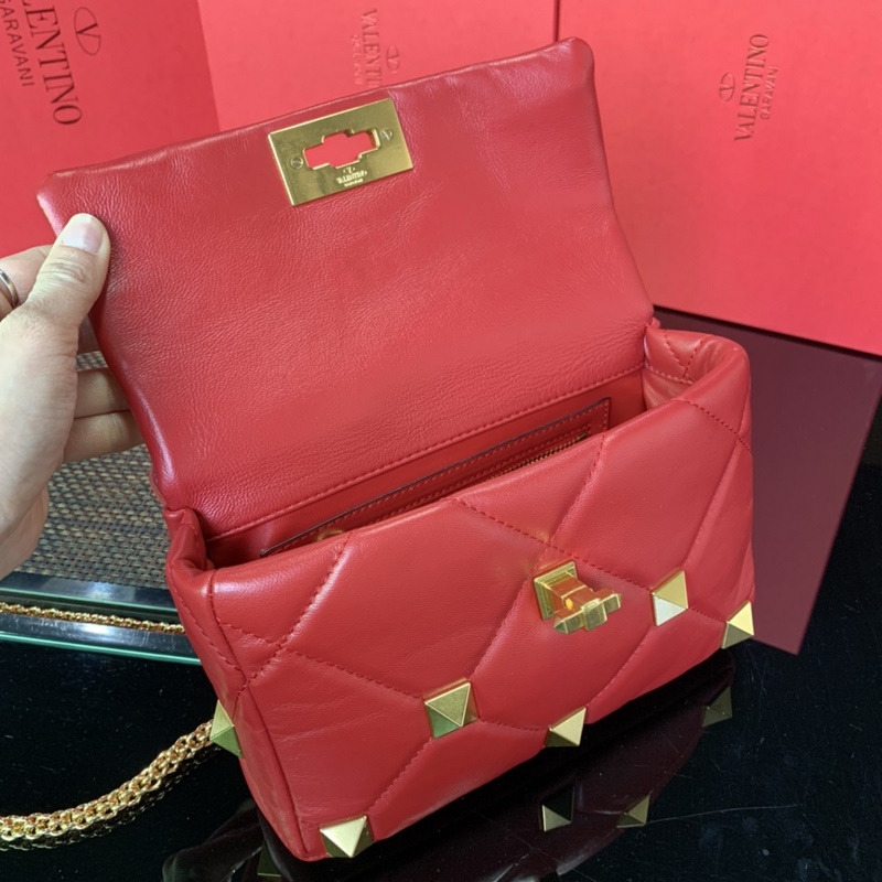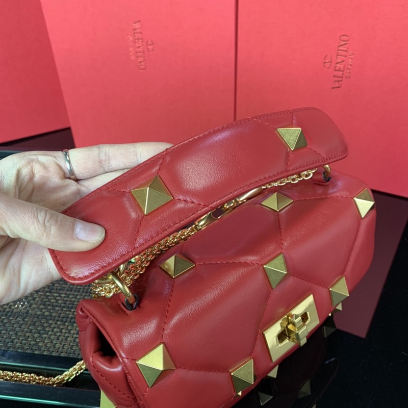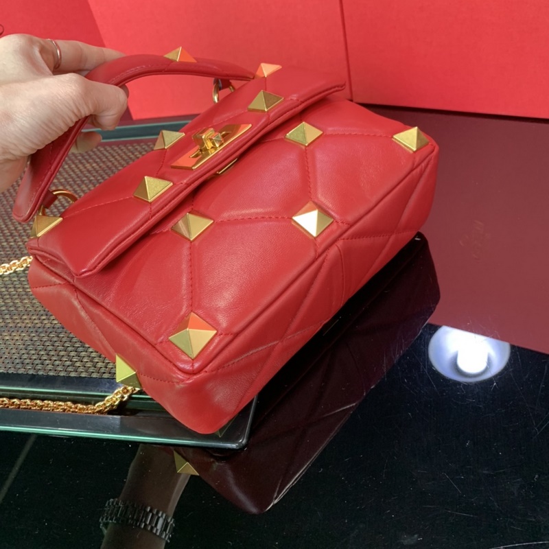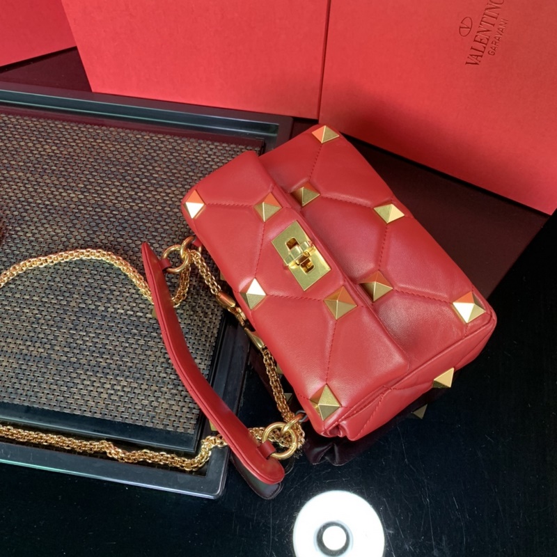 스터드가 달린 발렌티노 스몰 나파 가죽 체인 백 대형 스터드 탈착식 손잡이 슬라이딩 체인 트림이 있는 퀼트 구조 크로스 바디 / 어깨에 메거나 손잡이로 잡을 수 있습니다. 톤온톤 스티칭으로 프리즘 패턴을 강조한 탑스티치 나파 가죽 - 빈티지 브라스 효과 금속 리벳과 피팅 - 트위스트 락 잠금 - 나파 가죽 내부: 지퍼식 포켓 - 크기: 가로 25 x 세로 16 x 깊이 10cm - 모델 번호: 2060S 아이템 번호: SX86181060