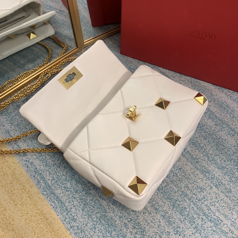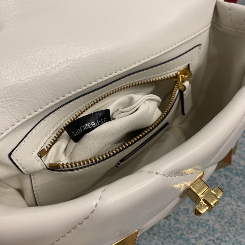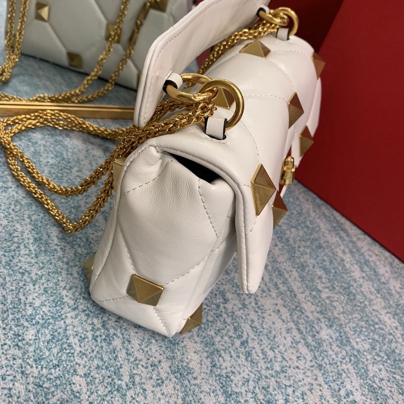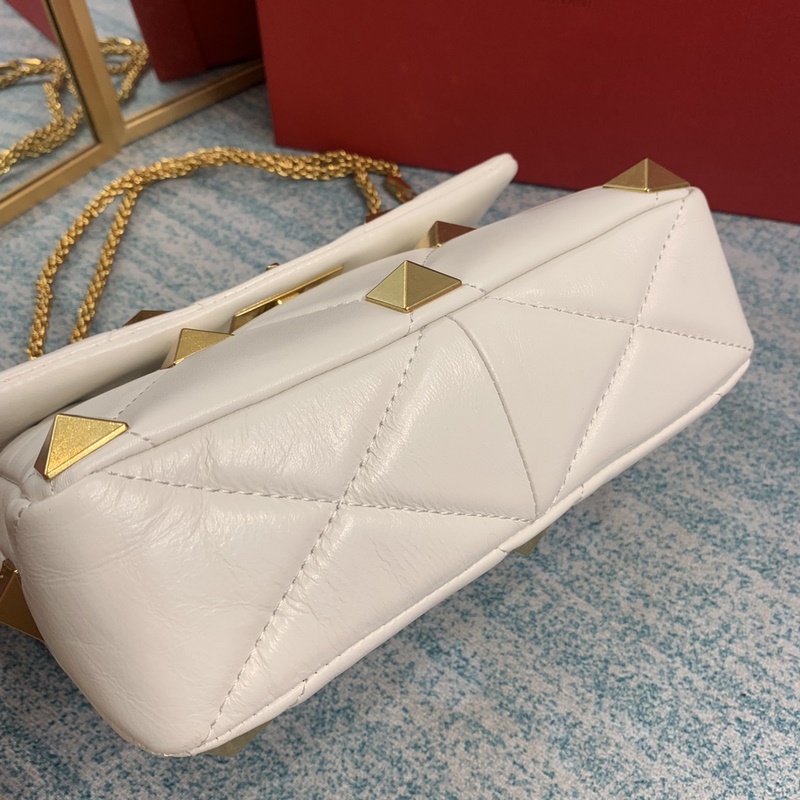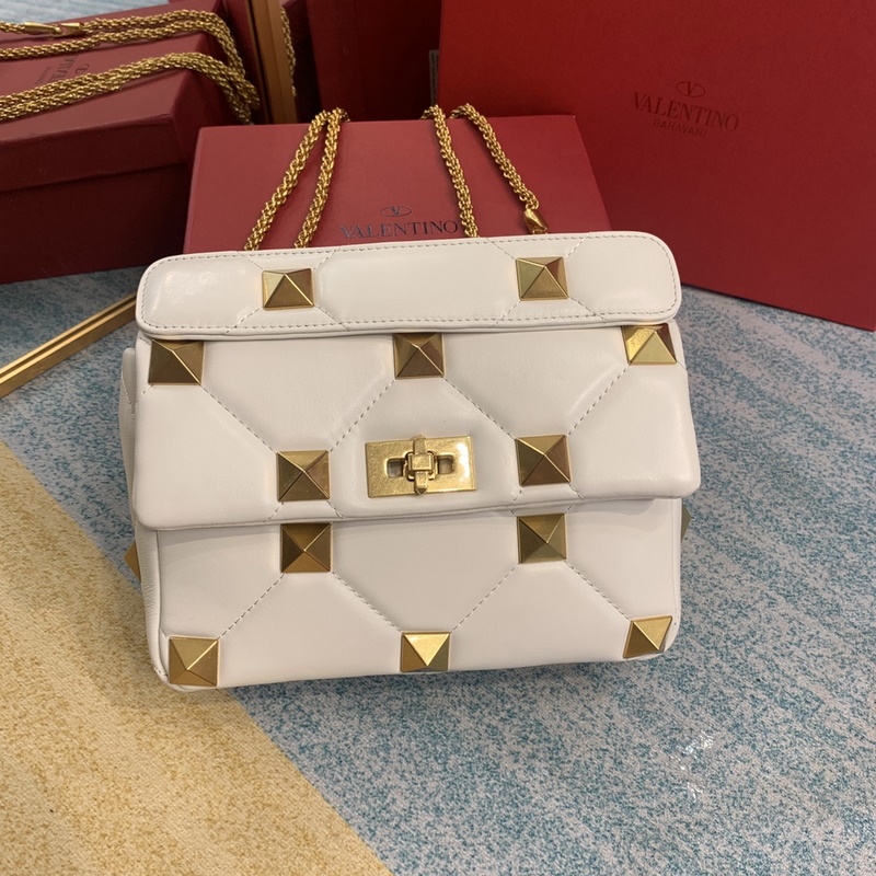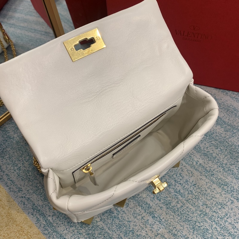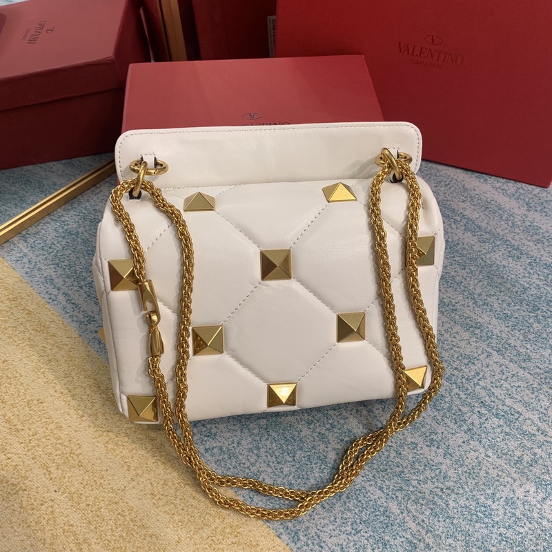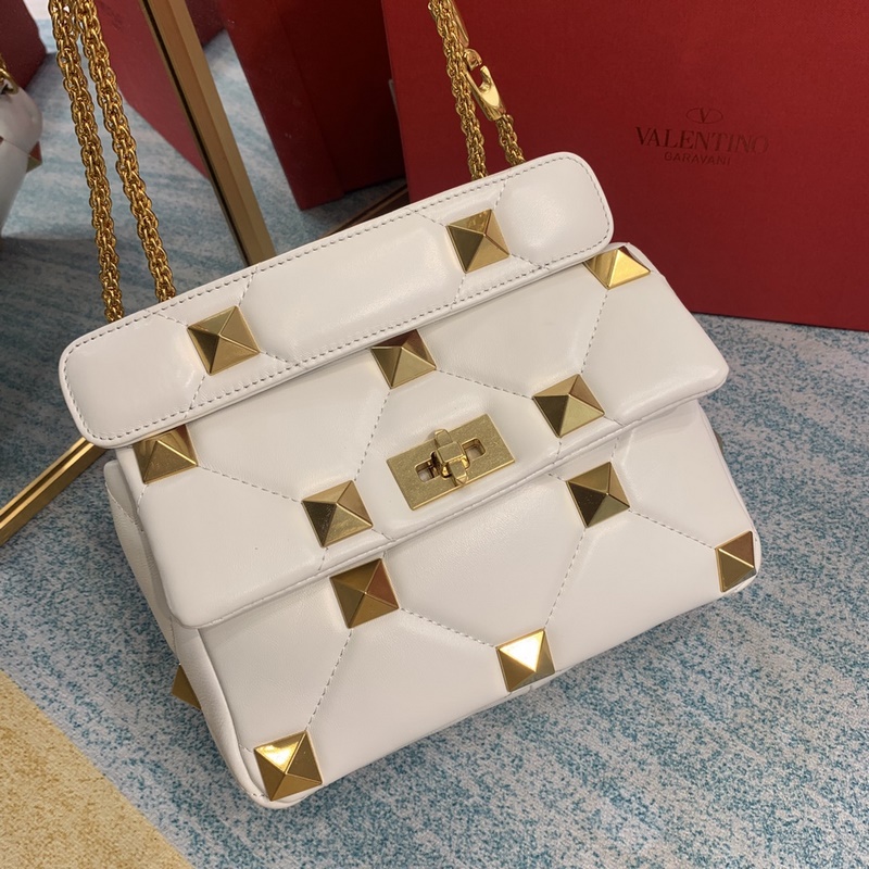 발렌티노 로마 스터드 체인 숄더백 나파 양가죽 대형 리벳으로 장식된 퀼트 구조 탈착식 손잡이 슬라이딩 체인 트림 슬링/숄더/핸드헬드 - 프리스타일 패턴을 강조하는 톤온톤 퀼팅이 적용된 누비 나파 가죽 - 빈티지한 느낌의 황동 효과 금속 리벳과 피팅 - 내부: 지퍼 포켓 모델 번호: 2060 대형: 30 x 20 x 12 소형: 25x16x10 상자에 담겨 제공 No.: SD96181280 (소형) No.: SD96181350 (대형)