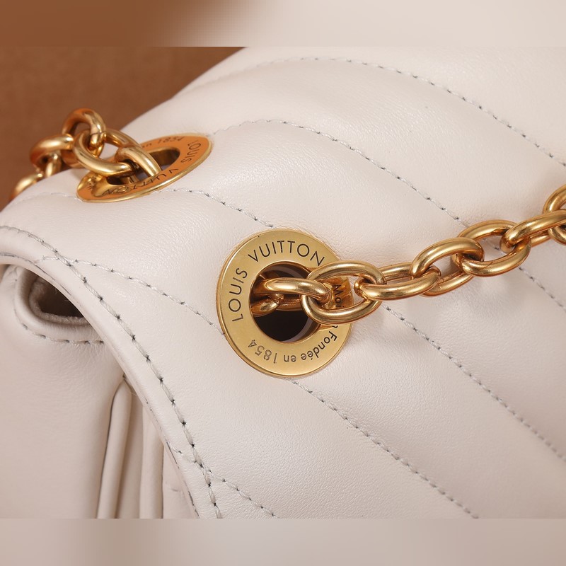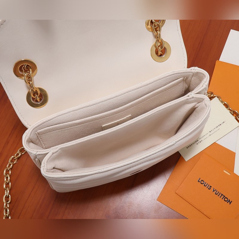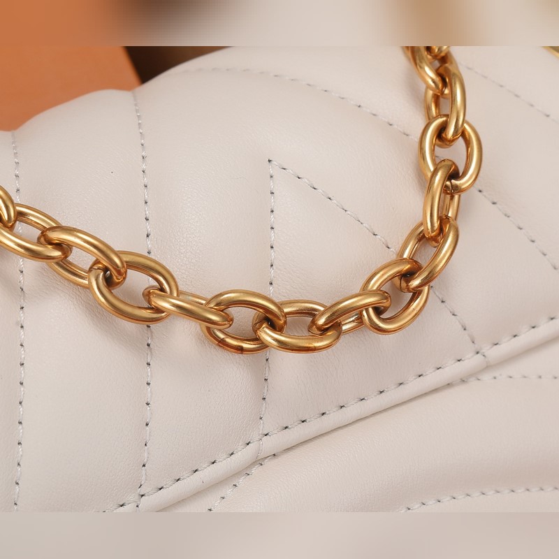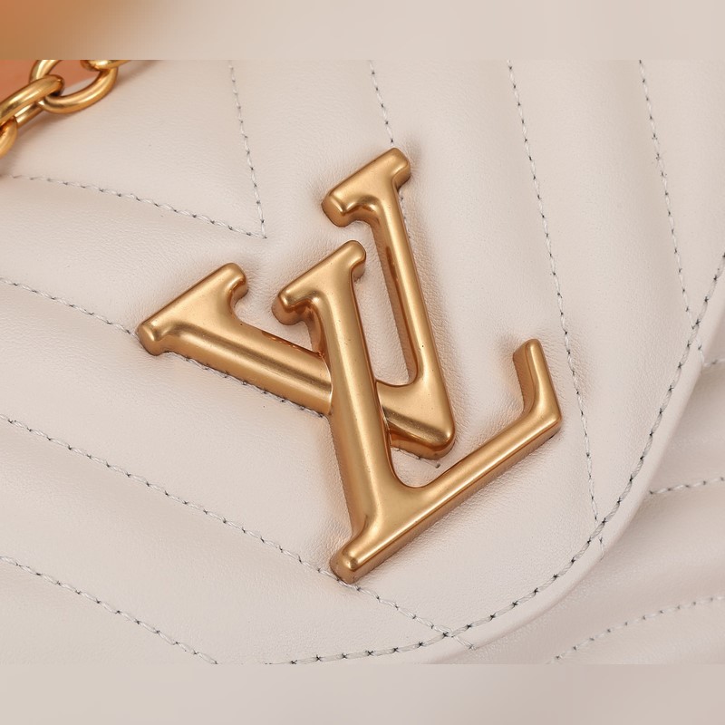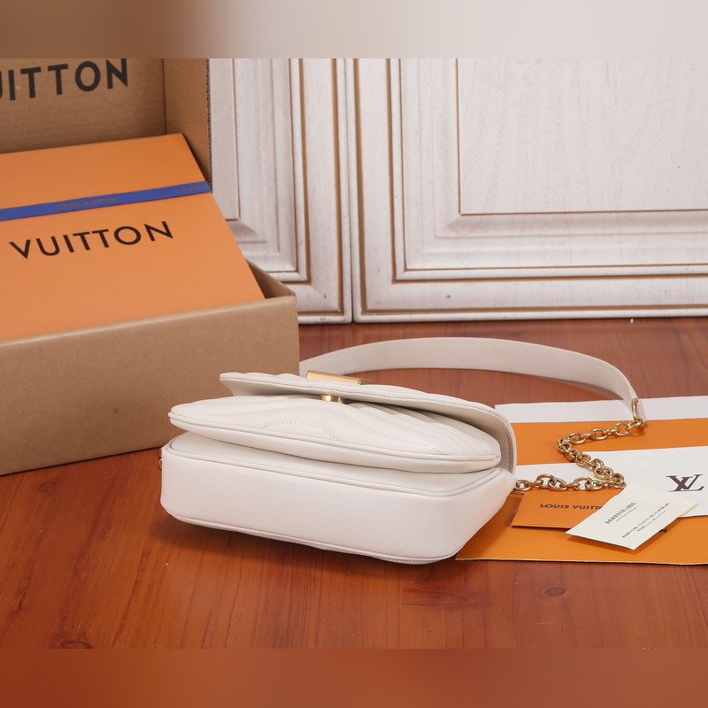 LV 뉴 웨이브 스몰 체인 백 웨이브 체인백과 멀티 포셰트 액세서리 핸드백을 결합합니다. 물결 무늬가 있는 누빔 소가죽 어깨에 메거나 몸에 걸칠 수 있는 슬라이딩 체인 숄더 스트랩 누빔 소가죽 안감 부드러운 소가죽 트림 디스트레스드 메탈 부품 LV 마그네틱 버클 수납공간 패치 포켓 체인은 슬라이딩으로 조절 가능 탈착 불가! 모델: M20685; 크기: 21x12x9cm