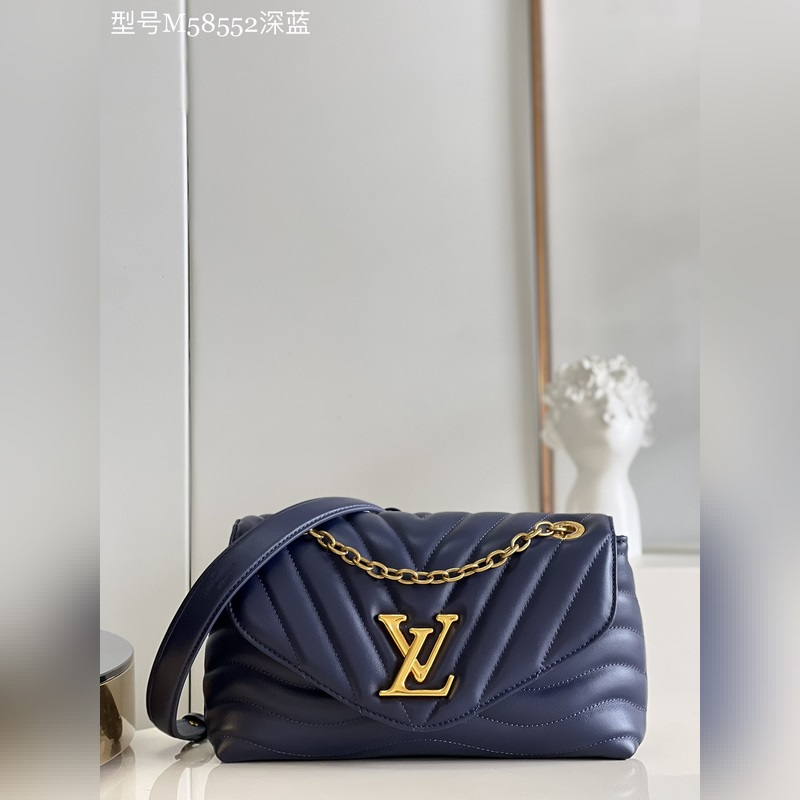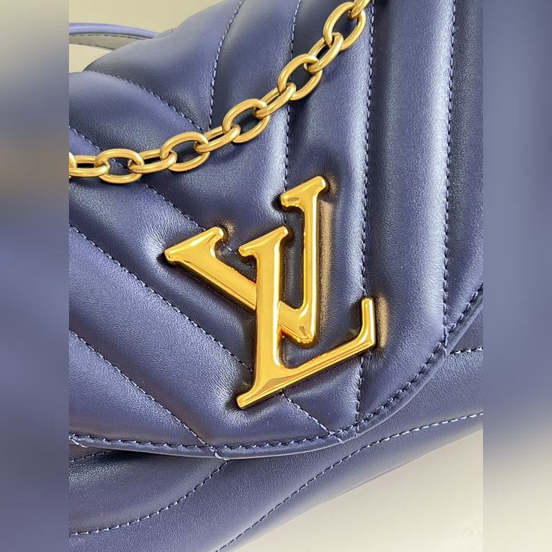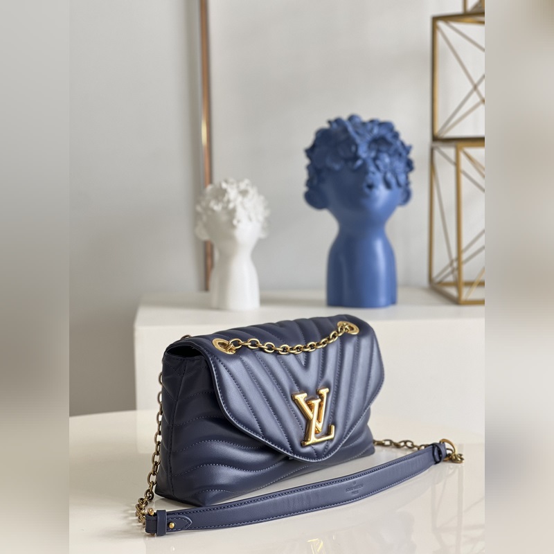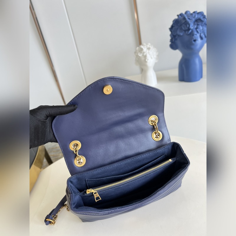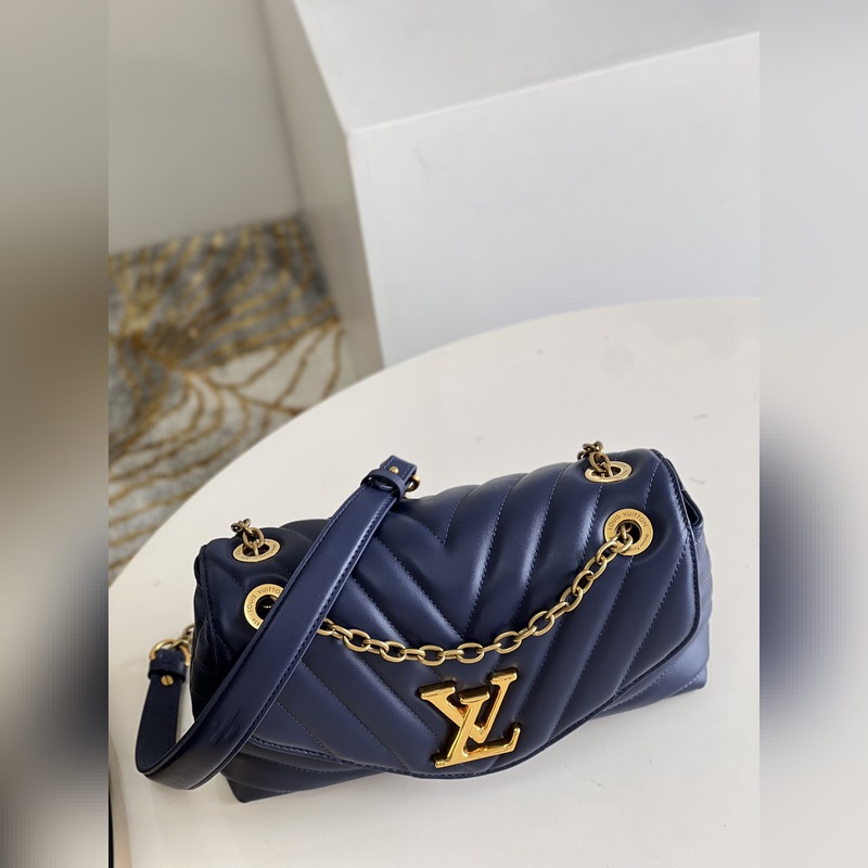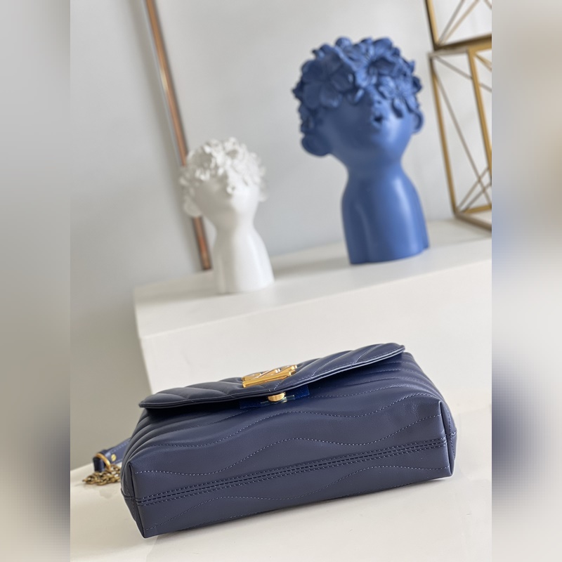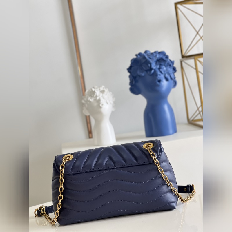 LV NEW WAVE 체인백 V자형 퀼팅 체인 백. 빈티지 골드 컬러의 체인이 각인된 구멍을 통과하고 접이식 잠금장치가 유연성을 더해줍니다. 여러 개의 수납공간 덕분에 내부 공간이 여성을 위한 필수품을 정리하기 쉽게 만들어 줍니다. 쉽게 알아볼 수 있는 LV 모노그램 로고가 있는 체인 백. M59349 크기: 24x14x9cm
