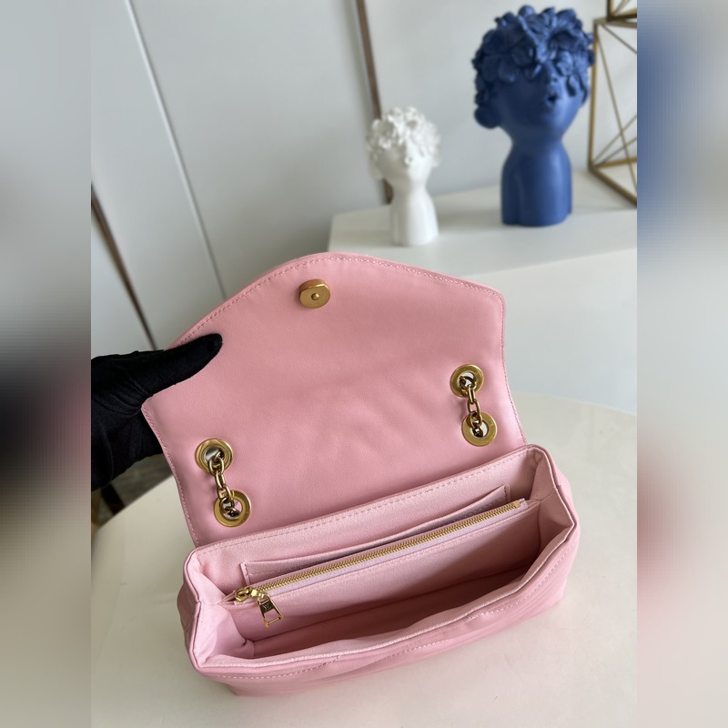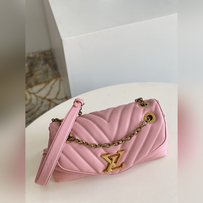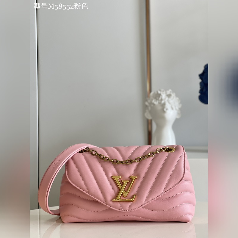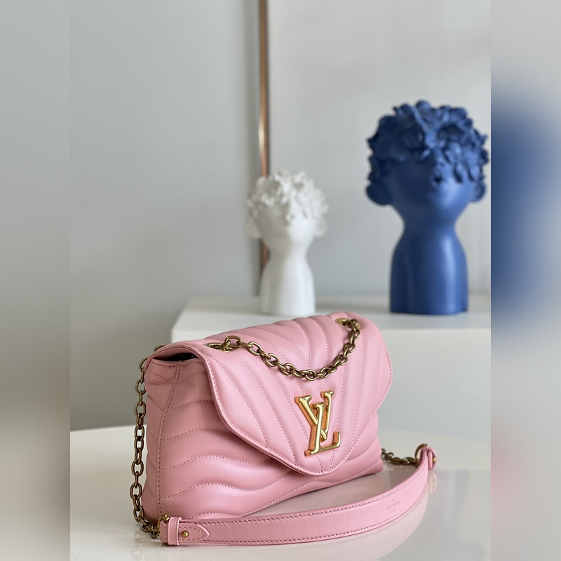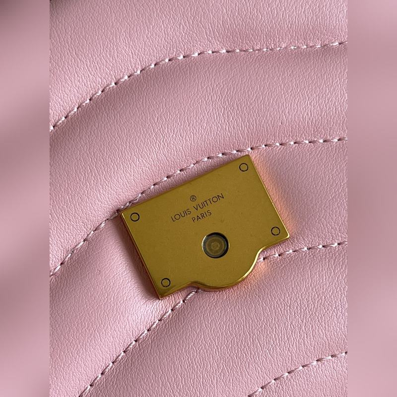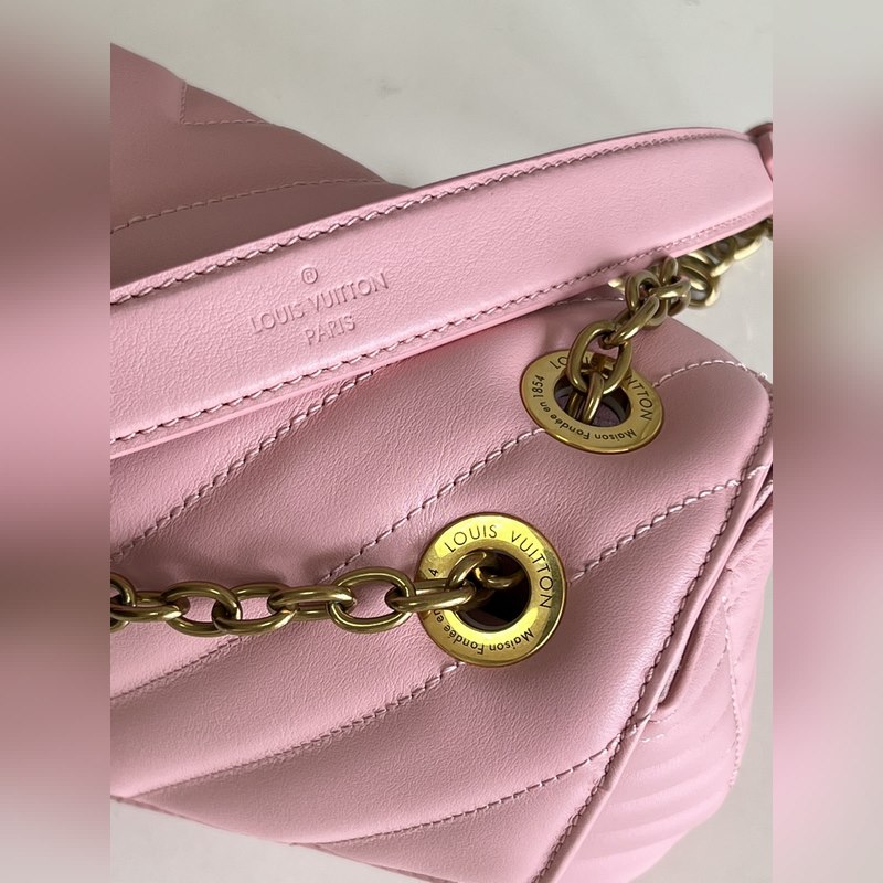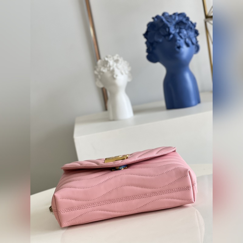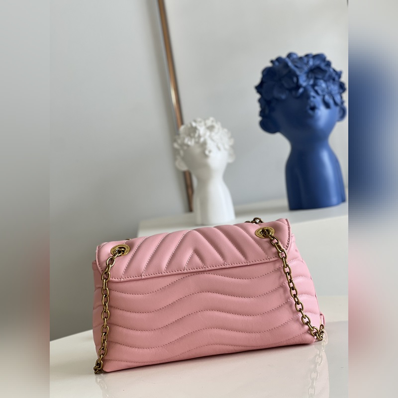 LV NEW WAVE 체인백 V자형 퀼팅 체인 백. 빈티지 골드 컬러의 체인이 각인된 구멍을 통과하고 접이식 잠금장치가 유연성을 더해줍니다. 여러 개의 수납공간 덕분에 내부 공간이 여성을 위한 필수품을 정리하기 쉽게 만들어 줍니다. 쉽게 알아볼 수 있는 LV 모노그램 로고가 있는 체인 백. M59349 크기: 24x14x9cm