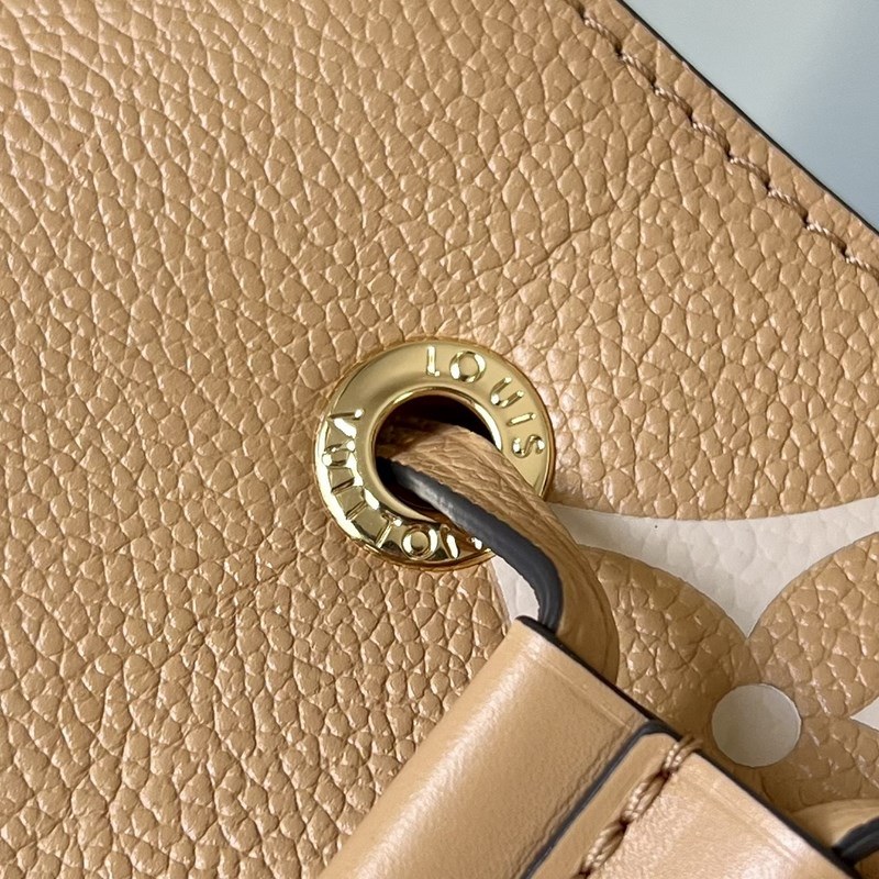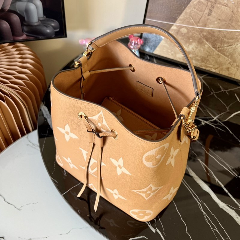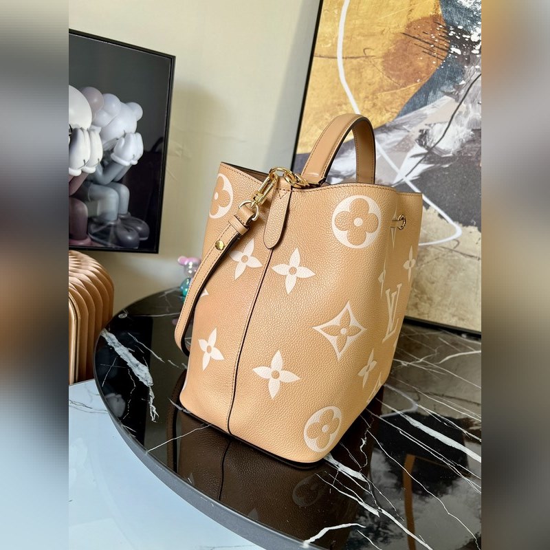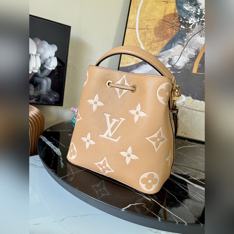 LV N?oNo? 버킷백 모델 M46029 브라운 실크스크린 프린트 이 네오노에 버킷백은 부드러운 모노그램 앙프렝뜨 가죽으로 만들어졌으며 프린팅 엠보싱 자수 기법을 사용하여 독특한 패턴을 만들어 냈습니다. 이 제품은 브랜드의 여행 가방에 사용되는 퀼팅 안감을 기리는 동시에 2022년 봄과 그 이후의 트렌드를 선도합니다. 크기: 26.0 x 26.0 x 17.5cm (가로 x 세로 x 높이)