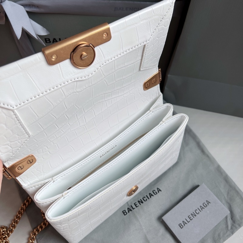 발렌시아 트리플렛 오르간 체인 백 새로 출시된 악어 무늬 클러치 백 체인 길이는 한쪽 어깨에 걸치거나 크로스 바디로 착용할 수 있도록 설계되었습니다. 심플한 악어 무늬와 로고가 고급스러움을 더해줍니다. 여러 개의 카드 슬롯이 있고 더 사려 깊고 실용적입니다. 크기: 길이 21cm 폭 8cm 높이 12cm