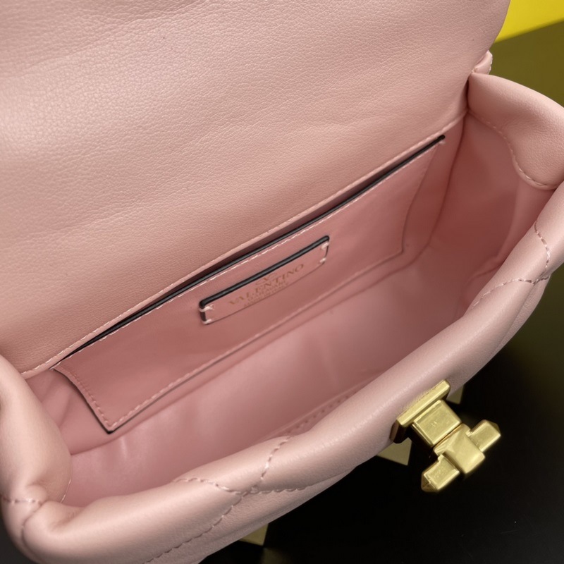 발렌티노 가라바니 로마 스터드 스몰 나파 가죽 체인 백 오버사이즈 스터드 탈착식 핸들 슬라이딩 체인 트림이 있는 퀼팅 구조로 크로스 바디 숄더백 또는 클러치로 착용할 수 있습니다. 퀼팅 나파 가죽에 톤온톤 퀼팅으로 프리즘 패턴을 강조 - 빈티지 브라스 효과 마감 - 건메탈 컬러의 금속 스터드와 피팅 - 턴락 잠금장치 - 나파 가죽 내부: 지퍼 포켓 크기 20-12-7cm