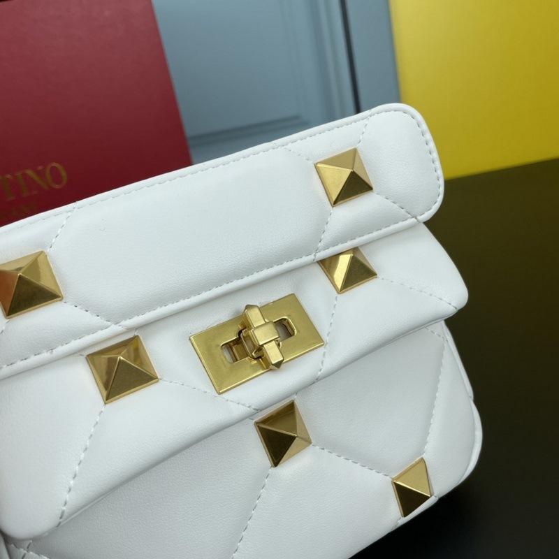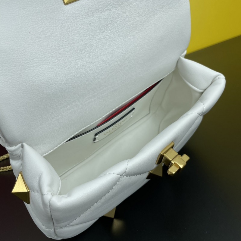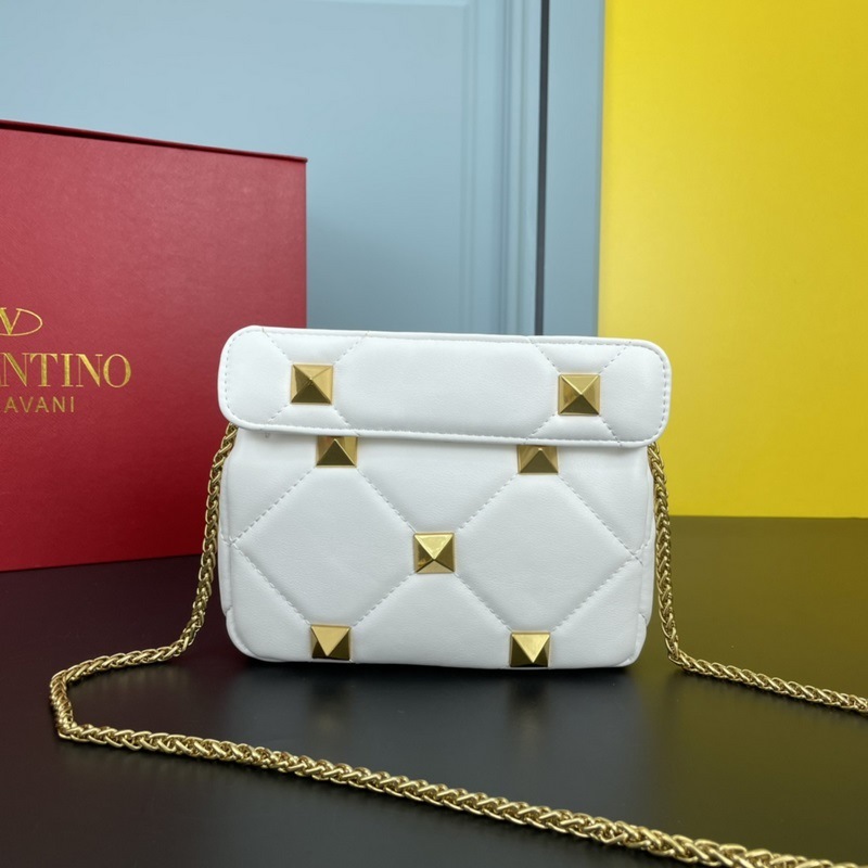 발렌티노 가라바니 로마 스터드 스몰 나파 가죽 체인 백 오버사이즈 스터드 탈착식 핸들 슬라이딩 체인 트림이 있는 퀼팅 구조로 크로스 바디 숄더백 또는 클러치로 착용할 수 있습니다. 퀼팅 나파 가죽에 톤온톤 퀼팅으로 프리즘 패턴을 강조 - 빈티지 브라스 효과 마감 - 건메탈 컬러의 금속 스터드와 피팅 - 턴락 잠금장치 - 나파 가죽 내부: 지퍼 포켓 크기 20-12-7cm