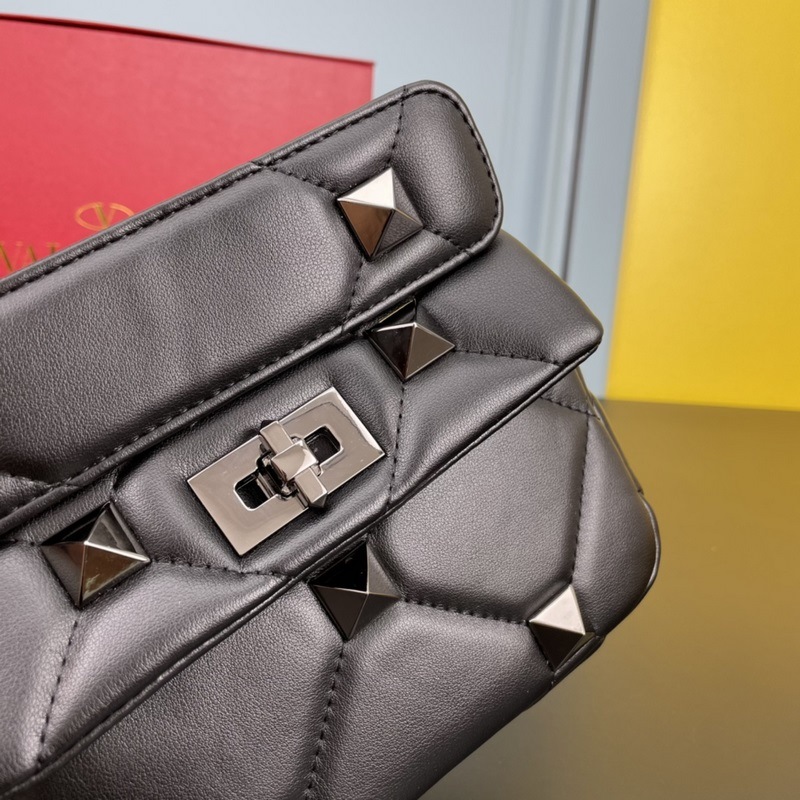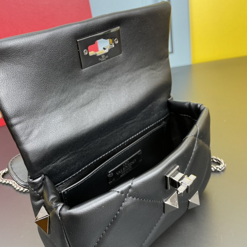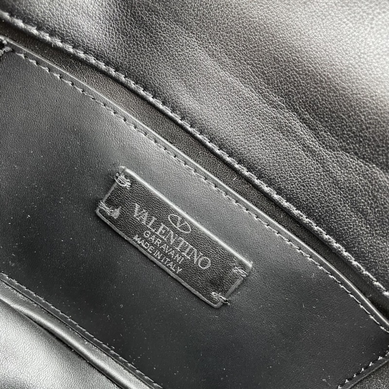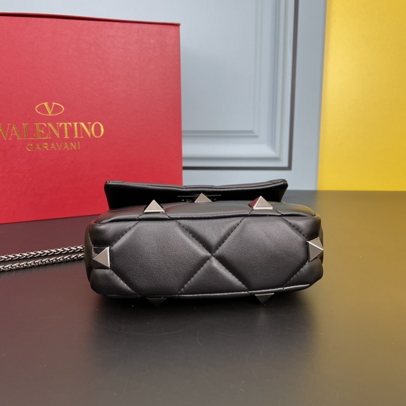 발렌티노 가라바니 로마 스터드 스몰 나파 가죽 체인 백 오버사이즈 스터드 탈착식 핸들 슬라이딩 체인 트림이 있는 퀼팅 구조로 크로스 바디 숄더백 또는 클러치로 착용할 수 있습니다. 퀼팅 나파 가죽에 톤온톤 퀼팅으로 프리즘 패턴을 강조 - 빈티지 브라스 효과 마감 - 건메탈 컬러의 금속 스터드와 피팅 - 턴락 잠금장치 - 나파 가죽 내부: 지퍼 포켓 크기 20-12-7cm