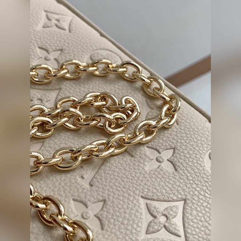 LV 이지 파우치 온 스트랩 핸드백 모델 M80349 화이트 2022 봄 컬렉션 스트랩 핸드백에 간편한 파우치 모노그램 앙프렝뜨 가죽으로 제작된 이 가방은 모노그램 엠보싱과 부드러운 질감으로 세련된 느낌을 줍니다. 어깨에 메거나 체인 및 조절 가능한 가죽 어깨 스트랩을 사용하여 몸에 걸칠 수 있습니다. 크기: 19 x 11.5 x 3cm