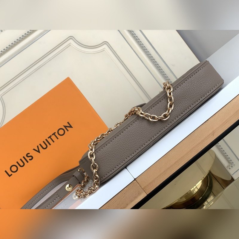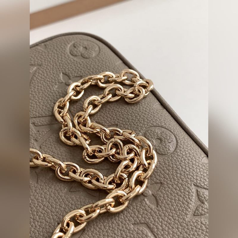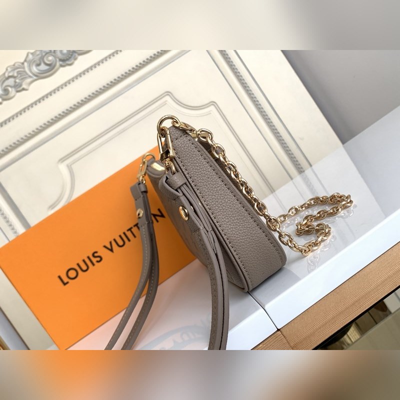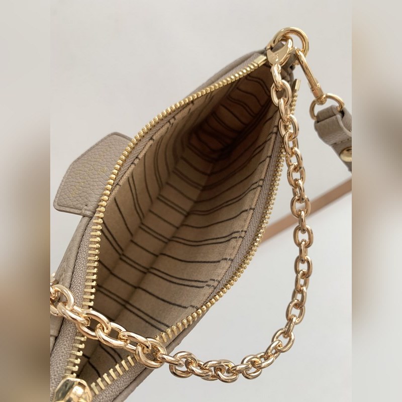LV 이지 파우치 온 스트랩 핸드백 모델 M80349 살구색 엠보싱 2022 봄 컬렉션 스트랩 핸드백에 간편한 파우치 부착 모노그램 앙프렝뜨 가죽으로 제작된 이 가방은 모노그램 엠보싱과 부드러운 질감으로 세련된 느낌을 줍니다. 체인과 길이 조절이 가능한 가죽 어깨 스트랩 덕분에 어깨에 메거나 크로스 바디로 메는 것이 가능합니다. 크기: 19 x 11.5 x 3cm